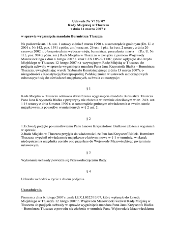 Uchwała Nr V/ 70/ 07 Rady Miejskiej w Tłuszczu z dnia 14 marca 2007 r. w sprawie wygaśnięcia mandatu Burmistrza Tłuszcza Na podstawie art. 18. ust. 1 ustawy z dnia 8 marca 1990 r. o samorządzie gminnym (Dz. U. z 2001 r. Nr 142, poz. 1591 z późn. zm.) oraz art. 26 ust. 1 pkt. 1a i ust. 2 ustawy z dnia 20 czerwca 2002 r. o bezpośrednim wyborze wójta, burmistrza, prezydenta miasta (Dz. U. Nr 113, poz. 984 z późn. zm.) Rada Miejska w Tłuszczu w związku z pismem Wojewody Mazowieckiego z dnia 6 lutego 2007 r. znak LEX.I.0522/13/07, (które wpłynęło do Urzędu Miejskiego w Tłuszczu 12 lutego 2007 r.) wzywającym Radę Miejską w Tłuszczu do podjęcia uchwały w sprawie wygaśnięcia mandatu Pana Jana Krzysztofa Białka – Burmistrza Tłuszcza, uwzględniając wyrok Trybunału Konstytucyjnego z dnia 13 marca 2007r. o niezgodności z Konstytucją Rzeczpospolitej Polskiej zmian w ustawach samorządowych odnoszących się do oświadczeń majątkowych, uchwala co następuje: §1 Rada Miejska w Tłuszczu odmawia stwierdzenia wygaśnięcia mandatu Burmistrza Tłuszcza Pana Jana Krzysztofa Białka z przyczyny nie złożenia w terminie określonym w art. 24 h ust. 1 i 4 ustawy z dnia 8 marca 1990 r. o samorządzie gminnym oświadczenia o swoim stanie majątkowym, z powodów wymienionych w § 2 ust. 2. §2 1.Uchwałę podjęto po umożliwieniu Panu Janowi Krzysztofowi Białkowi złożenia wyjaśnień w sprawie. 2.Rada Miejska w Tłuszczu przyjęła do wiadomości, że Pan Jan Krzysztof Białek- Burmistrz Tłuszcza wypełnił oświadczenie majątkowe o którym mowa w § 1 w terminie, w skutek niedopatrzenia urzędnika zostało ono przesłane do Wojewody Mazowieckiego po terminie ustawowym. §3 Wykonanie uchwały powierza się Przewodniczącemu Rady. §4 Uchwała wchodzi w życie z dniem podjęcia. Uzasadnienie. Pismem z dnia 6. lutego 2007 r. znak LEX.I.0522/13/07, które wpłynęło do Urzędu Miejskiego w Tłuszczu 12 lutego 2007 r. Wojewoda Mazowiecki wezwał Radę Miejską w Tłuszczu do podjęcia uchwały w sprawie wygaśnięcia mandatu Pana Jana Krzysztofa Białka – Burmistrza Tłuszcza z powodu nie złożenia w terminie Panu Wojewodzie Mazowieckiemu przez Burmistrza Tłuszcza oświadczenia o swoim stanie majątkowym. Burmistrz Tłuszcza był zobowiązany złożyć w/w oświadczenie w terminie do dnia 4 stycznia 2007 r. Oświadczenie wypełnił w dniu 3 stycznia 2007r. i przekazał je Sekretarzowi Gminy Tłuszcz w celu przesłania właściwemu organowi. W skutek niedopatrzenia urzędnika zostało ono przesłane do Pana Wojewody Mazowieckiego w dniu 9 stycznia 2007 r. Wobec powyższego w żadnym przypadku nie można mówić o świadomym zamiarze zaniechania wykonania obowiązku złożenia oświadczenia przez Pana Burmistrza. Jednak najistotniejszym argumentem za podjęciem niniejszej uchwały jest ogłoszenie wyroku przez Trybunał Konstytucyjny i stwierdzenie niezgodności z Konstytucją Rzeczypospolitej Polskiej zmian w ustawach samorządowych, odnoszących się do oświadczeń majątkowych samorządowców.