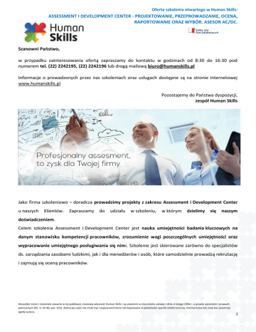 Oferta szkolenia otwartego w Human Skills: ASSESSMENT I DEVELOPMENT CENTER - PROJEKTOWANIE, PRZEPROWADZANIE, OCENA, RAPORTOWANIE ORAZ WYBÓR. ASESOR AC/DC. Szanowni Państwo, w przypadku zainteresowania ofertą zapraszamy do kontaktu w godzinach od 8:30 do 16:30 pod numerem tel. (22) 2242195, (22) 2242196 lub drogą mailową [email protected] Informacje o prowadzonych przez nas szkoleniach oraz usługach dostępne są na stronie internetowej www.humanskills.pl Pozostajemy do Państwa dyspozycji, zespół Human Skills Jako firma szkoleniowo – doradcza prowadzimy projekty z zakresu Assessment i Development Center u naszych Klientów. Zapraszamy do udziału w szkoleniu, w którym dzielimy się naszym doświadczeniem. Celem szkolenia Assessment i Development Center jest nauka umiejętności badania kluczowych na danym stanowisku kompetencji pracowników, zrozumienie wagi poszczególnych umiejętności oraz wypracowanie umiejętnego posługiwania się nimi. Szkolenie jest skierowane zarówno do specjalistów ds. zarządzania zasobami ludzkimi, jak i dla menedżerów i osób, które samodzielnie prowadzą rekrutację i zajmują się oceną pracowników. Wszystkie treści i materiały zawarte w tej publikacji, stanowią własność Human Skills i są utworem w rozumieniu ustawy z dnia 4 lutego 1994 r. o prawie autorskim i prawach pokrewnych (Dz. U. Nr 90, poz. 631). Żadna jej część nie może być rozpowszechniana lub kopiowana w jakikolwiek sposób (elektroniczny, mechaniczny lub inny) bez pisemnej zgody autora. 1 Oferta szkolenia otwartego w Human Skills: ASSESSMENT I DEVELOPMENT CENTER - PROJEKTOWANIE, PRZEPROWADZANIE, OCENA, RAPORTOWANIE ORAZ WYBÓR. ASESOR AC/DC. DZIĘKI UDZIAŁOWI W SZKOLENIU, UCZESTNIK POZYSKA NASTĘPUJĄCE UMIEJĘTNOŚCI: Poznanie specyfiki metody Assesment Centre oraz Development Centre. Rozpoznawanie kompetencji i możliwości rozwojowych omawianych podczas szkolenia case study. Tworzenie definicji kompetencji do sesji Assessment Center lub Development Center. Tworzenie słownika kompetencji do omawianego podczas szkolenia ćwiczenia do sesji Assessment Center lub Development Center. Rozdzielanie kompetencji głównych od pobocznych dla wybranego Assesment Centre oraz Development Centre. Tworzenie pytań do wybranych kompetencji do sesji Assessment Center lub Development Center. Określanie wskaźników do wybranych kompetencji do sesji Assessment Center lub Development Center. Dopasowanie ćwiczeń do badanej kompetencji do sesji Assessment Center lub Development Center. Badanie kluczowych kompetencji na omawianym podczas szkolenia profilu stanowiska do sesji Assessment Center lub Development Center. Zdobycie umiejętności samodzielnego projektowania wybranych ćwiczeń Assesment Centre oraz Development Centre. Nabycie umiejętności efektywnego przygotowania projektów Assesment Centre oraz Development Centre. Nabycie umiejętności przeprowadzenia projektów Assesment Centre oraz Development Centre. Przygotowanie do roli asesora w projektach Assesment Centre oraz Development Centre. Zdobycie informacji dotyczących profesjonalnego pełnienia roli asesora podczas sesji Assessment Center lub Development Center. Obserwacja asesorska podczas ćwiczeń sesji Assessment Center lub Development Center. Poznanie zasad analizy i oceny sesji Assessment Center lub Development Center. Tworzenie notatek asesora sesji Assessment Center lub Development Center. Tworzenie raportu cząstkowego sesji Assessment Center lub Development Center. Poznanie zasad budowania raportu końcowego sesji Assessment Center lub Development Center. Zdobycie umiejętności prawidłowego raportowania sesji Assessment Center lub Development Center. Poznanie zasad budowania sesji feedbackowej do sesji Assesment Centre lub Development Centre. Zapraszamy do udziału w szkoleniu uzupełniającym z zakresu: Feedback z elementami Feedforward, Zarządzanie talentami w organizacji i planowanie ścieżek karier. Wszystkie treści i materiały zawarte w tej publikacji, stanowią własność Human Skills i są utworem w rozumieniu ustawy z dnia 4 lutego 1994 r. o prawie autorskim i prawach pokrewnych (Dz. U. Nr 90, poz. 631). Żadna jej część nie może być rozpowszechniana lub kopiowana w jakikolwiek sposób (elektroniczny, mechaniczny lub inny) bez pisemnej zgody autora. 2 Oferta szkolenia otwartego w Human Skills: ASSESSMENT I DEVELOPMENT CENTER - PROJEKTOWANIE, PRZEPROWADZANIE, OCENA, RAPORTOWANIE ORAZ WYBÓR. ASESOR AC/DC. DZIĘKI UDZIAŁOWI W SZKOLENIU, UCZESTNIK POZYSKA NASTĘPUJĄCE MOŻLIWOŚCI: Zdobycie i poszerzenie wiedzy dotyczącej projektowania i wdrażania narzędzi do oceny danych kompetencji w organizacji. Możliwości zastosowania metody Assessment lub Development Centre w kierowaniu kapitałem ludzkim w organizacji Klienta. Rozwój kompetencji z zakresu tworzenia potencjału kadrowego w organizacji. Rozwój kompetencji z zakresu oceniania talentów wśród kandydatów lub pracowników organizacji Klienta. Wgląd do zaprojektowanych przez Human Skills projektów, dedykowanych dla różnych stanowisk i różnych kompetencji. Wgląd do autorskich ćwiczeń stosowanych na sesjach Assessment i Development Centre. ADRESACI SZKOLENIA: Pracownicy działów personalnych zajmujących się rekrutacjami oraz rozwojem talentów w organizacji, w tym menedżerowie HR, specjaliści, doradcy personalni i zawodowi. Osoby zarządzające zespołami i mający pełnić role asesorów w projektach Assessment Center oraz Development Center. Osoby zainteresowane pozyskaniem specjalistycznej wiedzy z zakresu Human Resources. Osoby zainteresowane powyższą tematyką oraz rozwojem kompetencji z zakresu zarządzania potencjałem kadrowym. OPINIE: Accenture „Bardzo praktyczne szkolenie a zasadniczo warsztat" Polski Instytut Dyplomacji „Poznałam zasady budowania i przeprowadzania projektów Assessment Centre oraz Development Centre" Polsko-Niemiecka Izba Przemysłowo-Handlowa „Skrupulatne wyjaśnienie poszcze