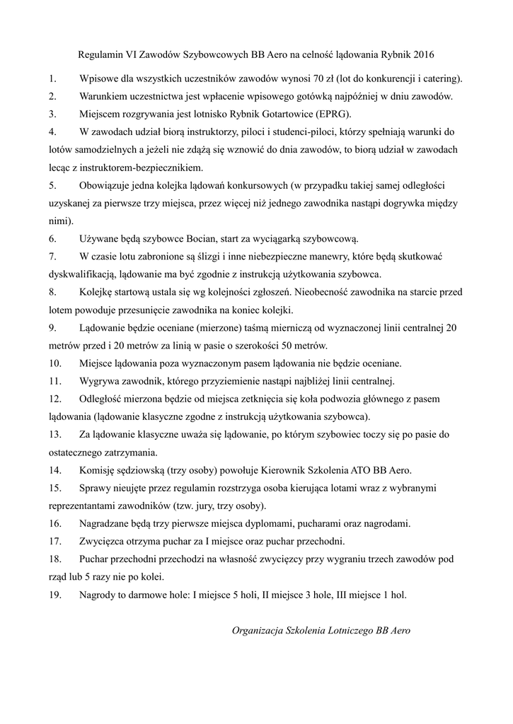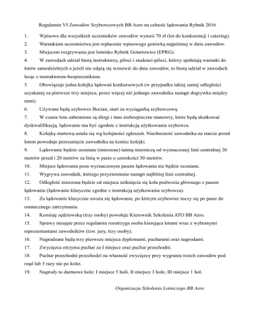 Regulamin VI Zawodów Szybowcowych BB Aero na celność lądowania Rybnik 2016 1. Wpisowe dla wszystkich uczestników zawodów wynosi 70 zł (lot do konkurencji i catering). 2. Warunkiem uczestnictwa jest wpłacenie wpisowego gotówką najpóźniej w dniu zawodów. 3. Miejscem rozgrywania jest lotnisko Rybnik Gotartowice (EPRG). 4. W zawodach udział biorą instruktorzy, piloci i studenci-piloci, którzy spełniają warunki do lotów samodzielnych a jeżeli nie zdążą się wznowić do dnia zawodów, to biorą udział w zawodach lecąc z instruktorem-bezpiecznikiem. 5. Obowiązuje jedna kolejka lądowań konkursowych (w przypadku takiej samej odległości uzyskanej za pierwsze trzy miejsca, przez więcej niż jednego zawodnika nastąpi dogrywka między nimi). 6. Używane będą szybowce Bocian, start za wyciągarką szybowcową. 7. W czasie lotu zabronione są ślizgi i inne niebezpieczne manewry, które będą skutkować dyskwalifikacją, lądowanie ma być zgodnie z instrukcją użytkowania szybowca. 8. Kolejkę startową ustala się wg kolejności zgłoszeń. Nieobecność zawodnika na starcie przed lotem powoduje przesunięcie zawodnika na koniec kolejki. 9. Lądowanie będzie oceniane (mierzone) taśmą mierniczą od wyznaczonej linii centralnej 20 metrów przed i 20 metrów za linią w pasie o szerokości 50 metrów. 10. Miejsce lądowania poza wyznaczonym pasem lądowania nie będzie oceniane. 11. Wygrywa zawodnik, którego przyziemienie nastąpi najbliżej linii centralnej. 12. Odległość mierzona będzie od miejsca zetknięcia się koła podwozia głównego z pasem lądowania (lądowanie klasyczne zgodne z instrukcją użytkowania szybowca). 13. Za lądowanie klasyczne uważa się lądowanie, po którym szybowiec toczy się po pasie do ostatecznego zatrzymania. 14. Komisję sędziowską (trzy osoby) powołuje Kierownik Szkolenia ATO BB Aero. 15. Sprawy nieujęte przez regulamin rozstrzyga osoba kierująca lotami wraz z wybranymi reprezentantami zawodników (tzw. jury, trzy osoby). 16. Nagradzane będą trzy pierwsze miejsca dyplomami, pucharami oraz nagrodami. 17. Zwycięzca otrzyma puchar za I miejsce oraz puchar przechodni. 18. Puchar przechodni przechodzi na własność zwycięzcy przy wygraniu trzech zawodów pod rząd lub 5 razy nie po kolei. 19. Nagrody to darmowe hole: I miejsce 5 holi, II miejsce 3 hole, III miejsce 1 hol. Organizacja Szkolenia Lotniczego BB Aero