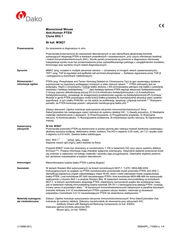 Monoclonal Mouse Anti-Human PTEN Clone 6H2.1 Nr kat. M3627 Przeznaczenie Do stosowania w diagnostyce in vitro. Przeciwciała przeznaczone do zastosowań laboratoryjnych w celu identyfikacji jakościowej komórek wykazujących ekspresję PTEN w tkankach prawidłowych i nowotworowych, przy użyciu mikroskopii świetlnej i metod immunohistochemicznych (IHC). Wyniki panelu przeciwciał są pomocne w diagnostyce różnicowej. Interpretacja wyniku musi być przeprowadzona przez wykwalifikowanego patologa z uwzględnieniem kontekstu klinicznego oraz wyników innych metod diagnostycznych. Synonim MMAC (ang. mutated in multiple advanced cancers — zmutowany w mnogich rakach zaawansowanych), TEP1 (ang. TGF-β-regulated and epithelial cell-enriched phosphatase — fosfataza regulowana przez TGF-β i wzbogacona w komórkach nabłonkowych) Streszczenie i informacje ogólne PTEN (ang. Phosphatase and Tensin Homolog Deleted on Chromosome Ten) to gen wywierający działanie supresorowe na nowotwory podlegający mutacjom w wielu różnych rakach.1-4 PTEN ulokowany jest na podprążku 10q23.3 chromosomu i koduje białko złożone z 403 aminokwasów pełniące rolę białka o podwójnej swoistości i fosfatazy fosfolipidowej.2, 3, 5, 6 Jako fosfataza lipidowa PTEN reguluje aktywność fosfatydyloinozytol3’-kinazy poprzez defosforylację pozycji D3 (3,4,5)-trifosforanu fosfatydyloinozytolu i (3,4)-biofosforanu fosfatydyloinozytolu, prowadząc do antagonizacji przekaźnictwa sygnału za fosfatydyloinozytol-(PI-3)-kinazą.7 Mutacje w genie PTEN powodujące utratę funkcji białka prowadzą do konstytutywnej aktywacji wielu szlaków sygnalizacji, w tym szlaku PI3K/Akt, co ma wpływ na proliferację, apoptozę i migrację komórek.8, 9 Wykazano ponadto, że PTEN kontroluje poziom i aktywność transkrypcyjną białka p53.10 Zobacz dokument „Ogólne instrukcje wykonywania odczynów immunohistochemicznych” firmy DakoCytomation lub następujące części instrukcji do systemu detekcji IHC: 1) Zasady procedury, 2) Niezbędne materiały niedostarczone z zestawem, 3) Przechowywanie, 4) Przygotowanie preparatu, 5) Wykonanie odczynu, 6) Kontrola jakości, 7) Rozwiązywanie problemów, 8) Interpretacja wyniku odczynu, 9) Ograniczenia metody. Dostarczany odczynnik Nr kat. M3627 Przeciwciała przeciwko PTEN są dostarczane w postaci płynnej jako nadsącz hodowli tkankowej (zawierający płodową surowicę bydlęcą), dializowany wobec roztworu Tris-HCl o stężeniu 0,05 mol/L, pH 7,2 i azydku sodu o stężeniu 0,015 mol/L. Zawiera białko stabilizujące. Izotyp: IgG2a, kappa Klon: 6H2.111 Stężenie mysich lgG [mg/L]: patrz etykieta na fiolce. Preparat M3627 może być stosowany w rozcieńczeniu 1:100 w badaniach IHC przy użyciu systemu detekcji EnVision™+. Podane informacje mają charakter wyłącznie orientacyjny. Optymalne stężenie przeciwciał może się zmieniać w zależności od rodzaju materiału i sposobu jego przygotowania. Optymalne stężenie powinno być określone indywidualnie w każdym laboratorium. Immunogen Rekombinowane ludzkie białko PTEN o pełnej długości Swoistość W testach Western Blot wykonywanych na liniach komórkowych MCF-7, T-47D i MDA-MB-435S homozygotycznych ze względu na PTEN monokolonalne przeciwciała mysie przeciwko PTEN, klon 6H2.1, identyfikują pojedynczy prążek odpowiadający masie 55 kD, która z kolei odpowiada masie cząsteczkowej białka PTEN. Linie komórkowe BT-549 niezawierające PTEN i linie komórkowe MDA-MB-468 nie wykazywały reaktywności z klonem 6H2.1 w analizie Western Blot. W badaniach metodą immunoblotting na komórkach MCF-7, w których wyindukowano ekspresję PTEN, stwierdzono wzmocnienie prążka dla oczekiwanej masy, zaś w badaniach metodą immunoblotting lizatów komórek ZR-75-1 z hemizygotyczną delecją PTEN i mutacją zmiany sensu w pozostałym allelu.11 W barwionych immunohistochemicznie zatopionych w parafinie bloczkach komórek Ishikawa 3-H-12 transfekowanych PTEN uzyskano odczyn dodatni, natomiast w skrawkach preparatów z komórkami 3-H-12 niezawierającymi PTEN nie stwierdzono reaktywności.12 Materiały wymagane, ale niedostarczane Zobacz „Ogólne instrukcje wykonywania odczynów immunohistochemicznych” firmy DakoCytomation i/lub instrukcje do systemu detekcji. Zalecany rozcieńczalnik do stosowania przy odczynach IHC: Antibody Diluent with Background Reducing Components (nr kat. S3022) Zalecana ujemna kontrola odczynów IHC: Mouse IgG2a (nr kat. X0943) (113998-001) 306645PL_110905 s. 1/4 Środki ostrożności 1. Odczynniki są przeznaczone dla przeszkolonych Użytkowników. 2. Opisywany produkt zawiera silnie toksyczny związek — azydek sodu (NaN3), w czystej postaci. Stężenie NaN3 występujące w produkcie nie jest klasyfikowane jako niebezpieczne. Jednak w wyniku reakcji NaN3 z ołowiem lub miedzią, wchodzącymi w skład instalacji kanalizacyjnych, mogą powstawać silnie wybuchowe azydki metali. Przy usuwaniu resztek odczynnika używać dużych ilości wody do przepłukiwania, aby uniknąć gromadzenia się azydków w instalacji kanalizacyjnej. 3. Podobnie jak w przypadku każdego produktu otrzymywanego z materiału biologicznego, należy stosować odpowiednie procedury postępowania. 4. Należy stosować właściwe wyposażenie ochronne, zabezpieczające przed kontaktem odczynnika ze skórą bądź oczami. 5. Niewykorzystane odczynniki należy usuwać zgodnie ze stosownymi przepisami lokalnymi i ogólnokrajowymi. Przechowywanie Przechowywać w temperaturze 2–8°C. Nie należy używać odczynników po upływie terminu ważności podanego na fiolce. Jeżeli odczynniki są przechowywane w warunkach innych niż podane na ulotce dołączanej do opakowania, Użytkownik powinien je zweryfikować. Nie ma jednoznacznych oznak świadczących o niestabilności tego produktu. Dlatego równolegle z odczynami na materiale pochodzącym od pacjentów należy wykonywać dodatnie i ujemne próby kontrolne. W wypadku nieoczekiwaneg