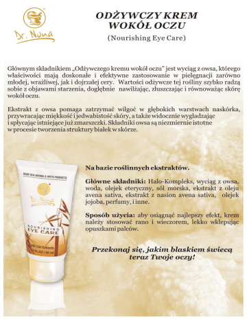 ODŻYWCZY KREM WOKÓŁ OCZU (Nourishing Eye Care) (Nourishing Eye Care) Głównym składnikiem „Odżywczego kremu wokół oczu” jest wyciąg z owsa, którego właściwości mają doskonałe i efektywne zastosowanie w pielęgnacji zarówno młodej, wrażliwej, jak i dojrzałej cery. Wartości odżywcze tej rośliny szybko radzą sobie z objawami starzenia, dogłębnie nawilżając, złuszczając i równoważąc skórę wokół oczu. Ekstrakt z owsa pomaga zatrzymać wilgoć w głębokich warstwach naskórka, przywracając miękkość i jedwabistość skóry, a także widocznie wygładzając i spłycając istniejące już zmarszczki. Składniki owsa są niezmiernie istotne w procesie tworzenia struktury białek w skórze. Na bazie roślinnych ekstraktów. Główne składniki: Halo-Kompleks, wyciąg z owsa, woda, olejek eteryczny, sól morska, ekstrakt z oleju avena sativa, ekstrakt z nasion avena sativa, olejek jojoba, perfumy, i inne. Sposób użycia: aby osiągnąć najlepszy efekt, krem należy stosować rano i wieczorem, lekko wklepując opuszkami palców. Przekonaj się, jakim blaskiem świecą teraz Twoje oczy!