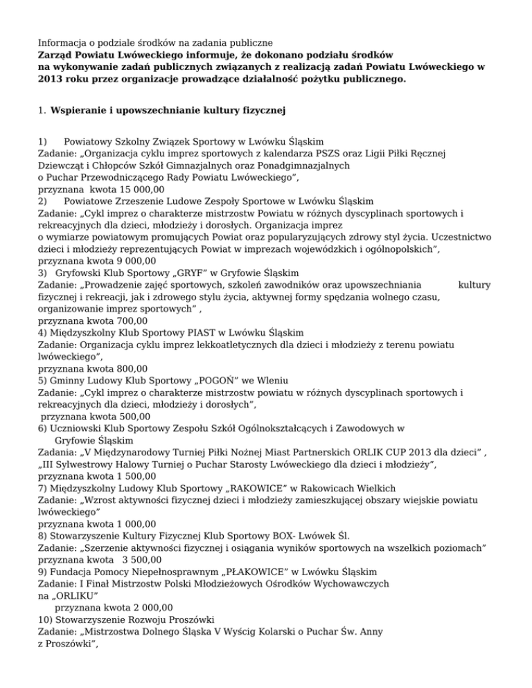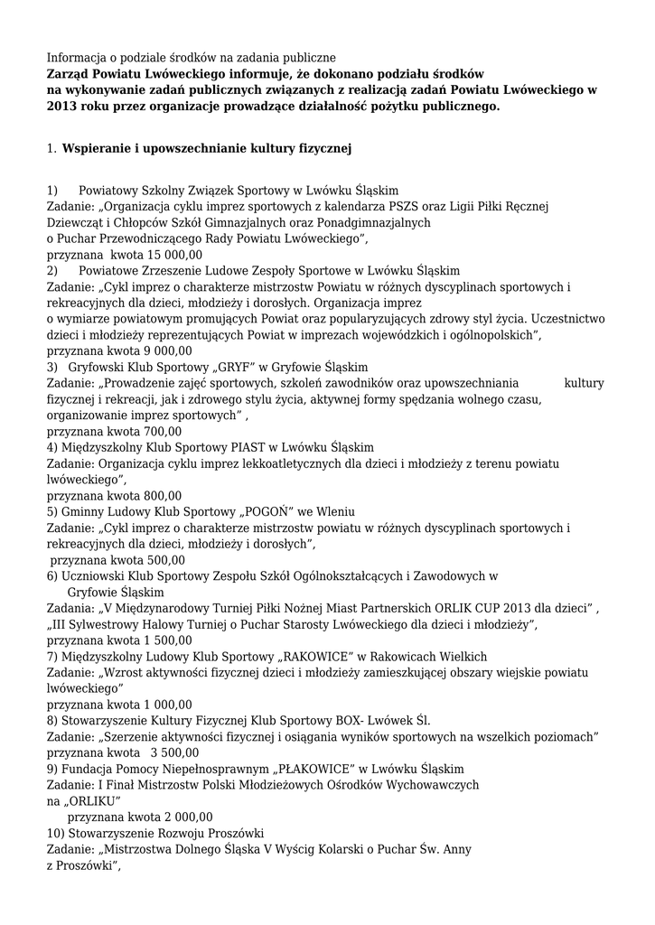 Informacja o podziale środków na zadania publiczne Zarząd Powiatu Lwóweckiego informuje, że dokonano podziału środków na wykonywanie zadań publicznych związanych z realizacją zadań Powiatu Lwóweckiego w 2013 roku przez organizacje prowadzące działalność pożytku publicznego. 1. Wspieranie i upowszechnianie kultury fizycznej 1) Powiatowy Szkolny Związek Sportowy w Lwówku Śląskim Zadanie: „Organizacja cyklu imprez sportowych z kalendarza PSZS oraz Ligii Piłki Ręcznej Dziewcząt i Chłopców Szkół Gimnazjalnych oraz Ponadgimnazjalnych o Puchar Przewodniczącego Rady Powiatu Lwóweckiego”, przyznana kwota 15 000,00 2) Powiatowe Zrzeszenie Ludowe Zespoły Sportowe w Lwówku Śląskim Zadanie: „Cykl imprez o charakterze mistrzostw Powiatu w różnych dyscyplinach sportowych i rekreacyjnych dla dzieci, młodzieży i dorosłych. Organizacja imprez o wymiarze powiatowym promujących Powiat oraz popularyzujących zdrowy styl życia. Uczestnictwo dzieci i młodzieży reprezentujących Powiat w imprezach wojewódzkich i ogólnopolskich”, przyznana kwota 9 000,00 3) Gryfowski Klub Sportowy „GRYF” w Gryfowie Śląskim Zadanie: „Prowadzenie zajęć sportowych, szkoleń zawodników oraz upowszechniania kultury fizycznej i rekreacji, jak i zdrowego stylu życia, aktywnej formy spędzania wolnego czasu, organizowanie imprez sportowych” , przyznana kwota 700,00 4) Międzyszkolny Klub Sportowy PIAST w Lwówku Śląskim Zadanie: Organizacja cyklu imprez lekkoatletycznych dla dzieci i młodzieży z terenu powiatu lwóweckiego”, przyznana kwota 800,00 5) Gminny Ludowy Klub Sportowy „POGOŃ” we Wleniu Zadanie: „Cykl imprez o charakterze mistrzostw powiatu w różnych dyscyplinach sportowych i rekreacyjnych dla dzieci, młodzieży i dorosłych”, przyznana kwota 500,00 6) Uczniowski Klub Sportowy Zespołu Szkół Ogólnokształcących i Zawodowych w Gryfowie Śląskim Zadania: „V Międzynarodowy Turniej Piłki Nożnej Miast Partnerskich ORLIK CUP 2013 dla dzieci” , „III Sylwestrowy Halowy Turniej o Puchar Starosty Lwóweckiego dla dzieci i młodzieży”, przyznana kwota 1 500,00 7) Międzyszkolny Ludowy Klub Sportowy „RAKOWICE” w Rakowicach Wielkich Zadanie: „Wzrost aktywności fizycznej dzieci i młodzieży zamieszkującej obszary wiejskie powiatu lwóweckiego” przyznana kwota 1 000,00 8) Stowarzyszenie Kultury Fizycznej Klub Sportowy BOX- Lwówek Śl. Zadanie: „Szerzenie aktywności fizycznej i osiągania wyników sportowych na wszelkich poziomach” przyznana kwota 3 500,00 9) Fundacja Pomocy Niepełnosprawnym „PŁAKOWICE” w Lwówku Śląskim Zadanie: I Finał Mistrzostw Polski Młodzieżowych Ośrodków Wychowawczych na „ORLIKU” przyznana kwota 2 000,00 10) Stowarzyszenie Rozwoju Proszówki Zadanie: „Mistrzostwa Dolnego Śląska V Wyścig Kolarski o Puchar Św. Anny z Proszówki”, przyznana kwota 1 000,00 1. Turystyka i krajoznawstwo 1) Stowarzyszenie Maltanowo Płóczki Górne Zadanie : „Powiatowymi szlakami - z grą, zabawą i kijkami”, przyznana kwota 1 000,00 2) Polskie Towarzystwo Turystyczno-Krajoznawcze Oddział „Ziemi Lwóweckiej” w Lwówku Śląskim Zadanie: „VII Ogólnopolskie Marsze na Orientację „O Złoty Liść Jesieni”, „Odnawianie ( konserwacja) szlaków turystycznych na terenie Powiatu Lwóweckiego”, „XX Ogólnopolska Impreza na Orientację Wiosna 2013”, „ XXXV Ogólnopolski Rajd Młodzieży Szkolnej „Babie Lato”, „Eliminacje Międzypowiatowe XLI Ogólnopolskiego Młodzieżowego Turnieju Turystyczno-Krajoznawczego”, „XLI Ogólnopolski Młodzieżowy Turniej Turystyczno-Krajoznawczy Finał Wojewódzki”, przyznana kwota 4 000,00 3) Polskie Towarzystwo Schronisk Młodzieżowych Zarządu Oddziału „Ziemi Jeleniogórskiej” w Jeleniej Górze z/s w Piechowicach Zadanie: XXXIX Jeleniogórski Rajd Młodzieży Szkolnej „Wleń 2013”, przyznana kwota 1 000,00 1. Ekologia i ochrona zwierząt oraz ochrona dziedzictwa przyrodniczego 1) Polskie Towarzystwo Turystyczno-Krajoznawcze Oddział „Ziemi Lwóweckiej” w Lwówku Śląskim Zadanie: „Ogólnopolska Konferencja Ekologiczna Turystyka na obszarach chronionych”, przyznana kwota 2 500,00 1. Promocja i organizacja wolontariatu 1) Stowarzyszenie HOMO VIATOR w Gryfowie Śląskim Zadanie : „Wolontariat –dlaczego nie?”, przyznana kwota 5 700,00 2) Stowarzyszenie Inicjatyw Lokalnych „Spokojna Góra” w Mirsku Zadanie: Piknik integracyjny osób niepełnosprawnych, mieszkańców DPS Mirsk oraz zaprzyjaźnionych DPS-ów z wolontariuszami Powiatu Lwóweckiego”, przyznana kwota 2 300,00 Przewodniczący Zarządu Powiatu Lwóweckiego Józef Stanisław Mrówka
