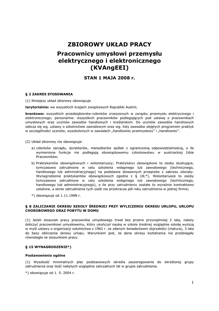 ZBIOROWY UKŁAD PRACY Pracownicy umysłowi przemysłu elektrycznego i elektronicznego (KVAngEEI) STAN 1 MAJA 2008 r. § 2 ZAKRES STOSOWANIA (1) Niniejszy układ zbiorowy obowiązuje terytorialnie: we wszystkich krajach związkowych Republiki Austrii; branŜowo: wszystkich przedsiębiorstw-członków zrzeszonych w związku przemysłu elektrycznego i elektronicznego; personalnie: wszystkich pracowników podlegających pod ustawę o pracownikach umysłowych oraz uczniów zawodów handlowych i kreślarskich. Do uczniów zawodów handlowych zalicza się wg. ustawy o szkolnictwie zawodowym oraz wg. listy zawodów objętych programem praktyk w szczególności uczniów, wyszkolonych w zawodach „handlowiec przemysłowy” i „handlowiec”. (2) Układ zbiorowy nie obowiązuje: a) członków zarządu, dyrektorów, menedŜerów spółek z ograniczoną odpowiedzialnością, o ile wymienione funkcje nie podlegają obowiązkowemu członkowstwu w austriackiej Izbie Pracowników; b) Praktykantów obowiązkowych i wolontariuszy; Praktykanci obowiązkowi to osoby studiujące, tymczasowo zatrudnione w celu szkolenia wstępnego lub zawodowego (technicznego, handlowego lub administracyjnego) na podstawie stosownych przepisów z zakresu oświaty. Wynagrodzenie praktykantów obowiązkowych zgodne z § 18;*). Wolontariusze to osoby tymczasowo zatrudnione w celu szkolenia wstępnego lub zawodowego (technicznego, handlowego lub administracyjnego), o ile przy zatrudnieniu zostało to wyraźnie kontraktowo ustalone, a okres zatrudnienia tych osób nie przekracza pół roku zatrudnienia w jednej firmie; *) obowiązuje od 1.11.1998 r. § 8 ZALICZANIE OKRESU SZKOŁY ŚREDNIEJ PRZY WYLICZENIU OKRESU URLOPU, URLOPU CHOROBOWEGO ORAZ POBYTU W DOMU (1) JeŜeli stosunek pracy pracownika umysłowego trwał bez przerw przynajmniej 2 lata, naleŜy doliczyć pracownikowi umysłowemu, który ukończył naukę w szkole średniej względnie szkołę wyŜszą w myśl ustawy o organizacji szkolnictwa z 1962 r. ze zdanym świadectwem dojrzałości (matura), 3 lata do bazy obliczenia okresu urlopu. Warunkiem jest, Ŝe dane okresy kształcenia nie przebiegały równolegle ze stosunkiem pracy. § 15 WYNAGRODZENIE*) Postanowienia ogólne (1) Wysokość minimalnych płac podstawowych określa zaszeregowanie do zatrudnienia oraz ilość nabytych względnie zaliczalnych lat w grupie zatrudnienia. określonej grupy *) obowiązuje od 1. 5. 2004 r. 1 (2) Przy osiągnięciu drugiego, czwartego, siódmego oraz dziesiątego roku w grupie zatrudnienia pracownik otrzymuje podwyŜkę swojego wynagrodzenia minimalnego i rzeczywistego o stosowną wartość zgodnie z klasą wynagrodzenia. (3) Ponadto poszczególni pracownicy otrzymują w kaŜdym roku kalendarzowym podwyŜkę swojego wynagrodzenia rzeczywistego o udział wypracowanego wyniku. Patrz „PodwyŜki indywidualne ” (str. 37). (4) PodwyŜka wynagrodzenia rzeczywistego zgodnie z układem zbiorowym reguluje sekcja G (str. 67). (5) W dalszym ciągu „wynagrodzenie minimalne“ określa się jako minimalne wynagrodzenie podstawowe, a „wynagrodzenie rzeczywiste” jako rzeczywiste wynagrodzenie podstawowe. (6) Wszystkie sformułowania dotyczą obu płci. Grupy zatrudnienia Zaszeregowanie (7) Za zaszeregowanie pracowników do jednej z jedenastu grup zatrudnienia odpowiada pracodawca z udziałem rady pracowniczej. (8) Zaszeregowanie odbywa się z uwzględnieniem ogółu wykonywanych czynności, tam gdzie jest to przewidziane - wg. ukończonego wykształcenia (zawodowego); wg. wykonywania zadań kierowniczych lub zadań w zakresie zarządzania projektem. Patrz protokół z dn. 12.12.2003 r. (str. 50). (9) Zaszeregowanie nie moŜe prowadzić do tego, Ŝe te same lub równowartościowe czynności, wykonywane głównie przez męŜczyzn względnie kobiety, są róŜnie zaszeregowane lub wynagradzane. (10). Zaszeregowanie do grupy zatrudnienia, ilość zaliczonych lat w grupie zatrudnienia oraz wysokość wynagrodzenia minimalnego i rzeczywistego, jak równieŜ wszelakie zmiany naleŜy przekazać pracownikom w formie karty pracownika (Dienstzettel). Uwaga: patrz adnotacja 5, str. 54 (11) [Dotyczy wyłącznie pracowników fizycznych.] Definicje grup zatrudnienia (12) Grupy zatrudnienia zdefiniowane są, jak następuje: Grupa zatrudnienia A Pracownicy wykonujący bardzo proste, schematyczne czynności z narzuconą kolejnością etapów pracy. Pracownicy nie potrzebują wyszkolenia zgodnego z przeznaczeniem. Grupa zatrudnienia B Pracownicy z wyszkoleniem zgodnym z przeznaczeniem wykonujący proste, schematyczne czynności wg wytycznych i instrukcji. Kolejność etapów pracy w zasadniczym stopniu wyznaczona. Ponadto pracownicy bez wyszkolenia zgodnego z przeznaczeniem, zatrudnieni do wykonywania większej ilości czynności z grupy zatrudnienia lub dysponujący szczególnymi zręcznościami. Ponadto pracownicy grupy zatrudnienia A po trzech latach przynaleŜności zakładowej. 2 Grupa zatrudnienia C Pracownicy wykonujący proste czynności wg. wytycznych i instrukcji. Mogą oni zmieniać kolejność etapów pracy w wyznaczonych ramach wytycznych i instrukcji. Wymagane jest wyszkolenie zgodne z przeznaczeniem i doświadczenie zawodowe. Grupa zatrudnienia D Pracownicy wykonujący czynności zgodnie z ogólnymi wytycznymi i instrukcjami. Pracownicy z ukończonym wykształceniem zawodowym (w szczególności zdany egzamin z nauki zawodu lub egzamin z nauki zawodu poświadczający kwalifikacje „istotnych elementów nauki zawodu” w ramach integralnej nauki zawodu), a takŜe pracownicy ze zdanym egzaminem z nauki zawodu w technologicznie pokrewnych względnie technologicznie podobnych zawodach, o ile przedmiotowe kwalifikacje istotne są przynajmniej w części wykonywanej czynności. Ponadto pracownicy, którzy nabyli równowartościowe umiejętności i zdolności poprzez kwalifikowane szkolenie w zakładzie i poprzez stosowne doświadczenie zawodowe. Wynagrodzenie minimalne początkujących w zawodzie a
