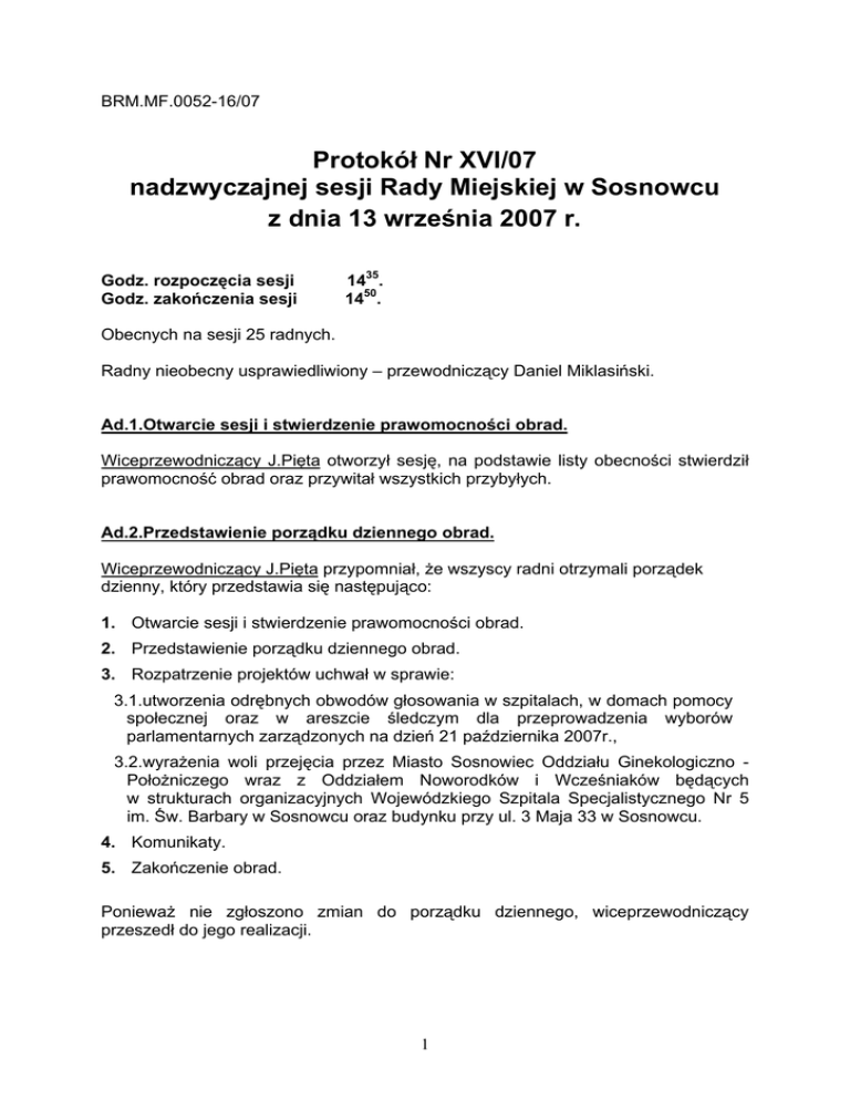 BRM.MF.0052-16/07 Protokół Nr XVI/07 nadzwyczajnej sesji Rady Miejskiej w Sosnowcu z dnia 13 września 2007 r. Godz. rozpoczęcia sesji Godz. zakończenia sesji 1435. 1450. Obecnych na sesji 25 radnych. Radny nieobecny usprawiedliwiony – przewodniczący Daniel Miklasiński. Ad.1.Otwarcie sesji i stwierdzenie prawomocności obrad. Wiceprzewodniczący J.Pięta otworzył sesję, na podstawie listy obecności stwierdził prawomocność obrad oraz przywitał wszystkich przybyłych. Ad.2.Przedstawienie porządku dziennego obrad. Wiceprzewodniczący J.Pięta przypomniał, że wszyscy radni otrzymali porządek dzienny, który przedstawia się następująco: 1. Otwarcie sesji i stwierdzenie prawomocności obrad. 2. Przedstawienie porządku dziennego obrad. 3. Rozpatrzenie projektów uchwał w sprawie: 3.1.utworzenia odrębnych obwodów głosowania w szpitalach, w domach pomocy społecznej oraz w areszcie śledczym dla przeprowadzenia wyborów parlamentarnych zarządzonych na dzień 21 października 2007r., 3.2.wyrażenia woli przejęcia przez Miasto Sosnowiec Oddziału Ginekologiczno Położniczego wraz z Oddziałem Noworodków i Wcześniaków będących w strukturach organizacyjnych Wojewódzkiego Szpitala Specjalistycznego Nr 5 im. Św. Barbary w Sosnowcu oraz budynku przy ul. 3 Maja 33 w Sosnowcu. 4. Komunikaty. 5. Zakończenie obrad. Ponieważ nie zgłoszono zmian do porządku dziennego, wiceprzewodniczący przeszedł do jego realizacji. 1 Ad.3.Rozpatrzenie projektów uchwał. Ad.3.1.Rozpatrzenie projektu uchwały w sprawie utworzenia odrębnych obwodów głosowania w szpitalach, w domach pomocy społecznej oraz w areszcie śledczym dla przeprowadzenia wyborów parlamentarnych zarządzonych na dzień 21 października 2007r., Wiceprzewodniczący J.Pięta przedstawił pozytywną opinię Komisji Spraw Obywatelskich, Administracji i Inwentaryzacji Mienia Komunalnego raz autopoprawkę polegającą na zmianie zapisu § 3 i nadanie mu brzmienia „Uchwała wchodzi w życie z dniem podjęcia”. Uwag brak. W wyniku głosowania, w którym udział wzięło 21 radnych: za - 21, przeciw - 0, wstrzymało się - 0, została podjęta uchwała Nr 222/XVI/07, której druk stanowi załącznik do protokołu. Ad.3.2.Rozpatrzenie projektu uchwały w sprawie wyrażenia woli przejęcia przez Miasto Sosnowiec Oddziału Ginekologiczno - Położniczego wraz z Oddziałem Noworodków i Wcześniaków będących w strukturach organizacyjnych Wojewódzkiego Szpitala Specjalistycznego Nr 5 im. Św. Barbary w Sosnowcu oraz budynku przy ul. 3 Maja 33 w Sosnowcu. Wiceprzewodniczący J.Pięta poinformował, że do projektu uchwały zgłoszona została autopoprawka, o przedstawienie której poprosił Naczelnika Wydziału Zdrowia i Opieki Społecznej. Naczelnik Wydziału Zdrowia i Opieki Społecznej J.Wieja w imieniu Prezydenta Miasta przedstawił następujący tekst autopoprawki: Wnoszę o autopoprawkę do projektu Uchwały w sprawie: wyrażenia woli przejęcia przez Miasto Sosnowiec Oddziału Ginekologiczno - Położniczego wraz z Oddziałem Noworodków i Wcześniaków będących w strukturach organizacyjnych Wojewódzkiego Szpitala Specjalistycznego Nr 5 im. Św. Barbary w Sosnowcu oraz budynku przy ul. 3 Maja 33 w Sosnowcu, polegającą na: 1. w tytule uchwały, w § 1 ust. 1, w § 2 ust. l oraz w § 3 zastąpić słowo: "...budynku..." słowami: "...nieruchomości położonej...", 2. w § l ust. 2 po słowach: "...na działalność publiczną..." wykreślić zapis: "...niemedyczną z wyjątkiem działalności o charakterze opiekuńczopielęgnacyjnym lub hospicyjnym...", 3. zmienić zapis § 2 ust. 2 nadając mu brzmienie: "Zaapelować o podjęcie przez Sejmik Województwa Śląskiego stosownych uchwał umożliwiających włączenie Oddziału Ginekologiczno-Położniczego i Oddziału Noworodków i 2 Wcześniaków do miejskich struktur zdrowia oraz przekazanie na rzecz Miasta Sosnowca nieruchomości położonej przy ul. 3 Maja 33". Naczelnik J.Wieja poinformował również, że w/w projekt uchwały przygotowany został w dużym pośpiechu, a jest wynikiem spotkania Prezydenta Miasta Sosnowca z Wicemarszałkiem Województwa Śląskiego Grzegorzem Szpyrką i I Wicewojewodą Województwa Śląskiego panem Arturem Warzochą, podczas którego strony zgodziły się, aby problem Oddziału Ginekologiczno-Położniczego oraz nieruchomości przy ul. 3 Maja, rozwiązane zostały pozytywnie. Zarząd Województwa nie wnosi zastrzeżeń co do przekazania zarówno oddziału, jak i nieruchomości na rzecz miasta Sosnowca, dlatego prezentowany projekt uchwały ma zainicjować proces zmierzający do przejęcia przez miasto tego podmiotu i nieruchomości. Dodał, że miasto oczekuje, iż Sejmik po otrzymaniu w/w uchwały zaproponuje dalsze kroki oraz szczegółowe porozumienia w tym zakresie. Podkreślił również, że miasto dąży do uruchomienia w pełnym zakresie działalności Oddziału Ginekologiczno-Położniczego, zanim podjęte zostaną działania formalne, dotyczące bytu samego oddziału, jak i nieruchomości. Radny K.Haładus cytując uzasadnienie do projektu uchwały, że budynek przy ul. 3 Maja po przejęciu przez miasto przeznaczony zostanie na działalność o charakterze publicznym, a nie komercyjnym, zapytał, jakie jest rozróżnienie pomiędzy działalnością publiczną, a komercyjną. Jako przykład podał sklep spożywczy lub myjnię samochodową, które są przykładem działalności komercyjnej, będąc równocześnie niezbędne dla funkcjonowania miasta. Zapytał także, czy miasto zaplanowało już przeznaczenie dla budynku przy ul. 3 Maja. Naczelnik J.Wieja stwierdził, że z docierających do niego informacji wynika, iż Marszałek Województwa nie zgadza się na prowadzenie w tym budynku działalności medycznej przez zakłady opieki zdrowotnej, natomiast wyraża zgodę na działalność opiekuńczo-leczniczą, pielęgnacyjną, czy hospicyjną, a także o charakterze niekomercyjnym, czyli niezarobkowym. Przyzna