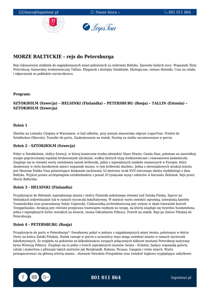 [email protected] Nasze biura 801 011 864 MORZE BAŁTYCKIE - rejs do Petersburga Rejs luksusowym statkiem do najpiękniejszych miast położonych na wybrzeżu Bałtyku. Zjawisko białych nocy. Wspaniały Złoty Petersburg. Kameralny średniowieczny Tallinn. Elegancki i dostojny Sztokholm. Ekologiczne, zielone Helsinki. Czas na relaks i odpoczynek na pokładzie wycieczkowca. Program: SZTOKHOLM (Szwecja) – HELSINKI (Finlandia) – PETERSBURG (Rosja) – TALLIN (Estonia) – SZTOKHOLM (Szwecja) Dzień 1 Zbiórka na Lotnisku Chopina w Warszawie, w hali odlotów, przy nowym stanowisku odpraw LogosTour. Przelot do Sztokholmu (Skavsta). Transfer do portu. Zaokrętowanie na statek. Nocleg na statku zacumowanym w porcie. Dzień 2 - SZTOKHOLM (Szwecja) Pobyt w Sztokholmie, stolicy Szwecji, w której koniecznie trzeba odwiedzić Stare Miasto, Gamla Stan, położone na niewielkiej wyspie poprzecinanej wąskimi brukowanymi uliczkami, wzdłuż których stoją średniowieczne i renesansowe kamieniczki. Znajduje się tu również warty zwiedzenia zamek królewski, jeden z największych zamków monarszych w Europie, który zbudowany w stylu barokowym mieści wspaniałe muzea, w tym królewski skarbiec. Jedną z obowiązkowych atrakcji miasta jest Muzeum Statku Vasa prezentujące doskonale zachowany 52-metrowy wrak XVII wiecznego okrętu wydobytego z dnia Bałtyku. Wyjście promu archipelagiem sztokholmskim z ponad 20 tysiącami wysp i szkierów w kierunku Helsinek. Rejs przez Morze Bałtyckie. Dzień 3 - HELSINKI (Finlandia) Przypłynięcie do Helsinek, największego miasta i stolicy Finlandii położonego również nad Zatoką Fińską. Spacer po Helsinkach indywidualnie lub w ramach wycieczki fakultatywnej. W mieście warto zwiedzić ogromną, luterańską katedrę Tuomiokirkko oraz prawosławny Sobór Uspienski. Ciekawostką architektoniczną jest wykuty w skale luterański kościół Temppeliaukio. Atrakcją jest również przeprawa tramwajem wodnym na wyspę, na której znajduje się twierdza Suomenlinna, jedna z największych fortec morskich na świecie, zwana Gibraltarem Północy. Powrót na statek. Rejs po Zatoce Fińskiej do Petersburga. Dzień 4 - PETERSBURG (Rosja) Przypłynięcie do portu w Petersburgu*. Dwudniowy pobyt w jednym z najpiękniejszych miast świata, położonym w delcie Newy na końcu Zatoki Fińskiej. Statek cumuje w porcie a uczestnicy rejsu mogą zwiedzać miasto w ramach wycieczek fakultatywnych. Ze względu na położenie na kilkudziesięciu wyspach połączonych kilkuset mostami Petersburg nazywany bywa Wenecją Północy. Znajduje się tu jedno z trzech największych muzeów świata – Ermitaż, będący wspaniałą galerią sztuki i malarstwa z płótnami takich mistrzów jak Rembrandt, Rubens, Picasso, Gauguin i wielu innych. Warto przespacerować się główną arterią miasta – sławnym Newskim Prospektem oraz zwiedzić bajkowo wyglądające zabytkowe 801 011 864 logostour.pl [email protected] Nasze biura 801 011 864 cerkwie, sobory oraz ławrę Aleksandra Newskiego. Turystów przyciąga również Krążownik Aurora na stałe zacumowany przy nabrzeżu. Wycieczki fakultatywne organizowane są również w okolice Petersburga do Peterhofu, słynącego ze wspaniałej rezydencji cara Piotra Wielkiego oraz miasta Puszkin mieszczącego słynne Carskie Sioło z rekonstrukcją bursztynowej komnaty. Wieczorem drugiego dnia pobytu w Petersburgu wypłyniecie w kierunku Tallina. Dzień 5 - PETERSBURG (Rosja) Przypłynięcie do portu w Petersburgu*. Dwudniowy pobyt w jednym z najpiękniejszych miast świata, położonym w delcie Newy na końcu Zatoki Fińskiej. Statek cumuje w porcie a uczestnicy rejsu mogą zwiedzać miasto w ramach wycieczek fakultatywnych. Ze względu na położenie na kilkudziesięciu wyspach połączonych kilkuset mostami Petersburg nazywany bywa Wenecją Północy. Znajduje się tu jedno z trzech największych muzeów świata – Ermitaż, będący wspaniałą galerią sztuki i malarstwa z płótnami takich mistrzów jak Rembrandt, Rubens, Picasso, Gauguin i wielu innych. Warto przespacerować się główną arterią miasta – sławnym Newskim Prospektem oraz zwiedzić bajkowo wyglądające zabytkowe cerkwie, sobory oraz ławrę Aleksandra Newskiego. Turystów przyciąga również Krążownik Aurora na stałe zacumowany przy nabrzeżu. Wycieczki fakultatywne organizowane są również w okolice Petersburga do Peterhofu, słynącego ze wspaniałej rezydencji cara Piotra Wielkiego oraz miasta Puszkin mieszczącego słynne Carskie Sioło z rekonstrukcją bursztynowej komnaty. Wieczorem drugiego dnia pobytu w Petersburgu wypłyniecie w kierunku Tallina. Dzień 6 - TALLIN (Estonia) Przypłynięcie do portu w Tallinie położonego u wejścia do Zatoki Fińskiej. Zwiedzanie stolicy Estonii samodzielnie lub w ramach jednej z wycieczek fakultatywnych. Warto odwiedzić jego urzekającą, świetnie zachowaną Starówkę otoczoną XIIIwiecznymi murami miejskimi z basztami o dachach z charakterystycznej czerwonej dachówki. Stojące przy wybrukowanych kocimi łbami uliczkach pastelowe kamienice tworzą tu niepowtarzalną atmosferę przywołującą czasy średniowiecza. Sercem Starego Miasta jest Rynek z gotyckim ratuszem a na uwagę zasługują również świątynie różnych wyznań. Nad miastem góruje Wzgórze Toompea, które od wieków jest siedzibą władz miasta i kraju. Z punktów widokowych Patkuli i Kohtuotsa rozciąga się wspaniały widok na Dolne Miasto i pozostałe bardziej nowoczesne dzielnice. Powrót na statek i rejs w kierunku Sztokholmu. Dzień 7 - SZTOKHOLM (Szwecja) Przypłynięcie do Sztokholmu. Czas na dalsze zwiedzanie miasta. Nocleg na statku zacumowanym w porcie. Dzień 8 Transfer do portu lotniczego. Wylot do Polski. Przylot do Warszawy. Cena obejmuje: I RATA 2000 PLN płatna przy zapisie II RATA płatna na 45 dni przed wyjazdem przeloty międzynarodowe, rejs luksusowym statkiem wycieczkowym po Morzu Bałtyckim, 7 noclegów w kabinie 2-oso