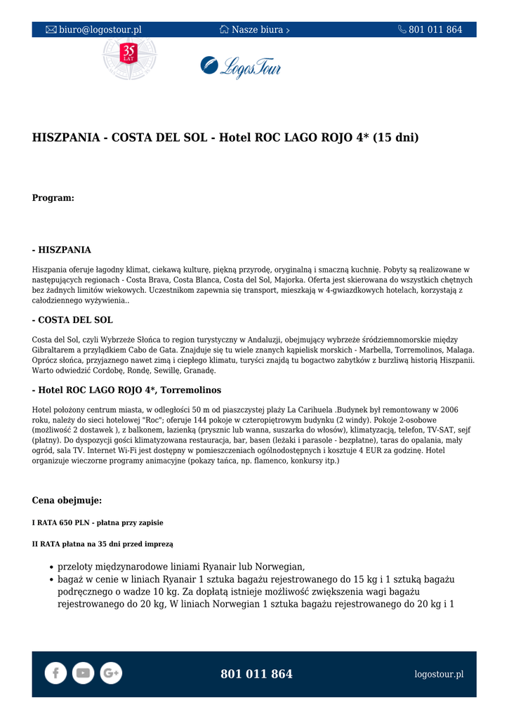 [email protected] Nasze biura 801 011 864 HISZPANIA - COSTA DEL SOL - Hotel ROC LAGO ROJO 4* (15 dni) Program: - HISZPANIA Hiszpania oferuje łagodny klimat, ciekawą kulturę, piękną przyrodę, oryginalną i smaczną kuchnię. Pobyty są realizowane w następujących regionach - Costa Brava, Costa Blanca, Costa del Sol, Majorka. Oferta jest skierowana do wszystkich chętnych bez żadnych limitów wiekowych. Uczestnikom zapewnia się transport, mieszkają w 4-gwiazdkowych hotelach, korzystają z całodziennego wyżywienia.. - COSTA DEL SOL Costa del Sol, czyli Wybrzeże Słońca to region turystyczny w Andaluzji, obejmujący wybrzeże śródziemnomorskie między Gibraltarem a przylądkiem Cabo de Gata. Znajduje się tu wiele znanych kąpielisk morskich - Marbella, Torremolinos, Malaga. Oprócz słońca, przyjaznego nawet zimą i ciepłego klimatu, turyści znajdą tu bogactwo zabytków z burzliwą historią Hiszpanii. Warto odwiedzić Cordobę, Rondę, Sewillę, Granadę. - Hotel ROC LAGO ROJO 4*, Torremolinos Hotel położony centrum miasta, w odległości 50 m od piaszczystej plaży La Carihuela .Budynek był remontowany w 2006 roku, należy do sieci hotelowej "Roc"; oferuje 144 pokoje w czteropiętrowym budynku (2 windy). Pokoje 2-osobowe (możliwość 2 dostawek ), z balkonem, łazienką (prysznic lub wanna, suszarka do włosów), klimatyzacją, telefon, TV-SAT, sejf (płatny). Do dyspozycji gości klimatyzowana restauracja, bar, basen (leżaki i parasole - bezpłatne), taras do opalania, mały ogród, sala TV. Internet Wi-Fi jest dostępny w pomieszczeniach ogólnodostępnych i kosztuje 4 EUR za godzinę. Hotel organizuje wieczorne programy animacyjne (pokazy tańca, np. flamenco, konkursy itp.) Cena obejmuje: I RATA 650 PLN - płatna przy zapisie II RATA płatna na 35 dni przed imprezą przeloty międzynarodowe liniami Ryanair lub Norwegian, bagaż w cenie w liniach Ryanair 1 sztuka bagażu rejestrowanego do 15 kg i 1 sztuką bagażu podręcznego o wadze 10 kg. Za dopłatą istnieje możliwość zwiększenia wagi bagażu rejestrowanego do 20 kg, W liniach Norwegian 1 sztuka bagażu rejestrowanego do 20 kg i 1 801 011 864 logostour.pl [email protected] Nasze biura 801 011 864 sztuka bagażu podręcznego do 10 kg, transfery shuttle lotnisko-hotel-lotnisko (bez udziału rezydenta), zakwaterowanie 7 lub 14 noclegów w hotelu 4*, w pok. 2-osob., wyżywienie 3 posiłki dziennie (bufet) + napoje (wino i woda), opieka polskojęzycznego rezydenta, ubezpieczenie Signal Iduna NW, KL, bagaż. Dodatkowe informacje: POKÓJ 1-OSOBOWY Przy zakwaterowaniu tylko 1 osoby w pokoju obowiązkowa jest dopłata do pokoju 1-osob. Biuro nie gwarantuje dokwaterowania drugiej osoby. Terminy: 11.03 - 25.03.2017, 3730 PLN 18.03 - 01.04.2017, 3730 PLN 25.03 - 08.04.2017, 3730 PLN 01.04 - 15.04.2017, 3730 PLN 08.04 - 22.04.2017, 3730 PLN 15.04 - 29.04.2017, 3730 PLN 06.05 - 20.05.2017, 4740 PLN 801 011 864 logostour.pl