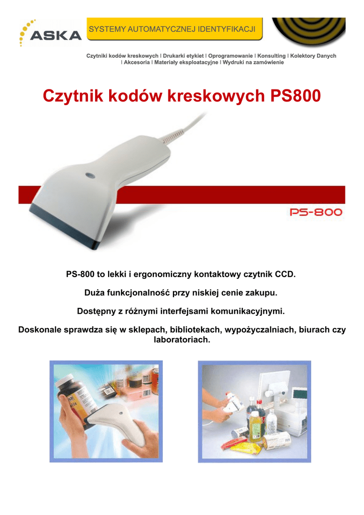 Czytnik kodów kreskowych PS800 PS-800 to lekki i ergonomiczny kontaktowy czytnik CCD. Duża funkcjonalność przy niskiej cenie zakupu. Dostępny z różnymi interfejsami komunikacyjnymi. Doskonale sprawdza się w sklepach, bibliotekach, wypożyczalniach, biurach czy laboratoriach. Czytnik kodów kreskowych PS-800 Optyka System optyczny:2160 Pixel CCD Szybkość skanowania: 100 skanów na sekundę Źródło skanowania: Diody LED (długość fali 660nm) Rozdzielczość: 0.1mm (4 mil) PCS : 30% lub więcej Kąt odczytu: 30° (do przodu) / 37° (do tyłu) Szerokość skanowania:do120 mm Odległość odczytu: 0~50mm (EAN*1, PCS=90%) Odczytywane kody: Code 39, Code 39 extended, Interleave 2 of 5, WPC (EAN-13, EAN-8, UPC-A, UPC-E), Code 128, Code 93, Code Bar, Code 11, Code 32, EAN-128, Chinese Postage Code, IATA, MSI/PLESSY, STD 2 of 5, Matrix 2 of 5, Italian Pharmacy Code, Industrial 2 of 5, BC-412 Interfejs Multi-Interfejs: Klawiatura, Szeregowy Opcjonalnie:USB (IMB PC / AT, Windows 98 lub wyższy) (Mac=OS 8.1 lub wyższy) (iMac= Rev A. lub wyższy) Emulacja klawiatury:IBM PC/XT/AT, IBM PS/2 Model 30/40/50/55/80 IMB5550, 3196, 3472, 3477 NEC 8910, MAC, ect. Interfejs szeregowy: ACK/NAK, X on/ X off, RTS/CTS, Baud Rate, Data Bit, Stop bit, Parity. Elektryka Zasilanie:5V DC ±10% Pobór prądu w czasie pracy: 130mA typical Pobór prądu podczas czuwania: 70mA Otoczenie pracy Temperatura (praca):+32º do +105º (0º to +50º Temperatura (przechowywanie):-15º do +140º (-26º do 60º) Wilgotność (praca): do 80% RH Wilgotność (przechowywanie): do 90% RH Natężenie oświetlenia otoczenia: 1500 Lux max. (Fluorescence). 800 Lux max. (Sunlight) Odporność na upadki: Upadek z 1.2m na twarde podłoże Gwarancja: 1 rok Certyfikaty bezpieczeństwa: FCC Class-B, CE, EMC, U/L , CSA Charakterystyka Obudowa: 30% PC + 70% ABS, UL94U0 Wymiary Długość 170mm x Szerokość 93mm x Wysokość 58mm Waga: 120g, bez kabla Złącze kabla: 10P10C RJ45 Phone Jack Connector / Boeing 10P Connector Typ kabla 2m sprężyna lub prosty ASKA S.C. ul. Wędkarska 2A/B1 04-869 Warszawa tel. (22) 498 59 08 (22) 498 59 09 fax. (22) 617 70 20 www.kodykreskowe.com e-mail: [email protected]