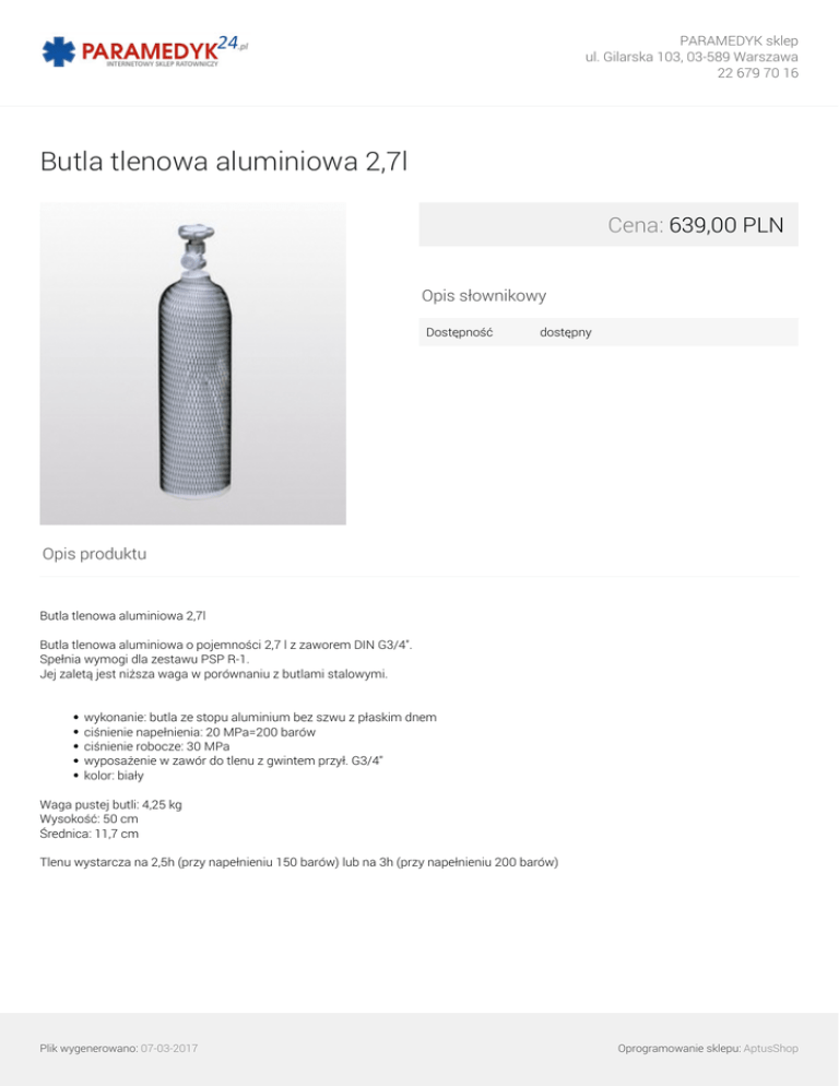 PARAMEDYK sklep ul. Gilarska 103, 03-589 Warszawa 22 679 70 16 Butla tlenowa aluminiowa 2,7l Cena: 639,00 PLN Opis słownikowy Dostępność dostępny Opis produktu Butla tlenowa aluminiowa 2,7l Butla tlenowa aluminiowa o pojemności 2,7 l z zaworem DIN G3/4". Spełnia wymogi dla zestawu PSP R-1. Jej zaletą jest niższa waga w porównaniu z butlami stalowymi. wykonanie: butla ze stopu aluminium bez szwu z płaskim dnem ciśnienie napełnienia: 20 MPa=200 barów ciśnienie robocze: 30 MPa wyposażenie w zawór do tlenu z gwintem przył. G3/4" kolor: biały Waga pustej butli: 4,25 kg Wysokość: 50 cm Średnica: 11,7 cm Tlenu wystarcza na 2,5h (przy napełnieniu 150 barów) lub na 3h (przy napełnieniu 200 barów) Plik wygenerowano: 07-03-2017 Oprogramowanie sklepu: AptusShop PARAMEDYK sklep ul. Gilarska 103, 03-589 Warszawa 22 679 70 16 Galeria Plik wygenerowano: 07-03-2017 Powered by TCPDF (www.tcpdf.org) Oprogramowanie sklepu: AptusShop