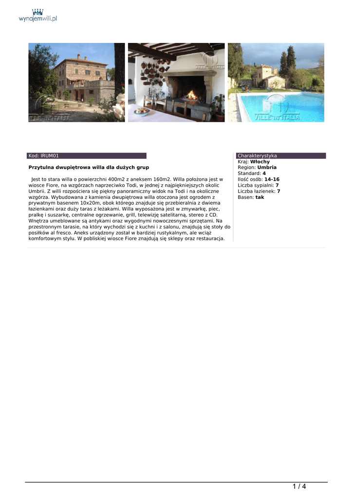 Kod: IRUM01 Przytulna dwupiętrowa willa dla dużych grup Jest to stara willa o powierzchni 400m2 z aneksem 160m2. Willa położona jest w wiosce Fiore, na wzgórzach naprzeciwko Todi, w jednej z najpiękniejszych okolic Umbrii. Z willi rozpościera się piękny panoramiczny widok na Todi i na okoliczne wzgórza. Wybudowana z kamienia dwupiętrowa willa otoczona jest ogrodem z prywatnym basenem 10x20m, obok którego znajduje się przebieralnia z dwiema łazienkami oraz duży taras z leżakami. Willa wyposażona jest w zmywarkę, piec, pralkę i suszarkę, centralne ogrzewanie, grill, telewizję satelitarną, stereo z CD. Wnętrza umeblowane są antykami oraz wygodnymi nowoczesnymi sprzętami. Na przestronnym tarasie, na który wychodzi się z kuchni i z salonu, znajdują się stoły do posiłków al fresco. Aneks urządzony został w bardziej rustykalnym, ale wciąż komfortowym stylu. W pobliskiej wiosce Fiore znajdują się sklepy oraz restauracja. Charakterystyka Kraj: Włochy Region: Umbria Standard: 4 Ilość osób: 14-16 Liczba sypialni: 7 Liczba łazienek: 7 Basen: tak 1/4 Zakwaterowanie: Willa: Pierwsze piętro: kuchnia z jadalnią z kamiennym kominkiem i wyjściem na taras, spiżarnia, salon z wyjściem na taras, studio-gabinet z fortepianem i komputerem z dostępem do Internetu, 1 toaleta, 2 sypialnie dwuosobowe, jedna z nich z łazienką z prysznicem, druga z łazienką z wanną. Drugie piętro: 5 sypialni dwuosobowych, trzy z nich z łazienkami z prysznicem, jedna z łazienką z wanną, 1 sypialnia dwuosobowa z oddzielnymi łóżkami (1 łóżko o szerokości 150cm i 1 miejsce do spania na sofie). Parter: garaż, pralnia. Aneks: Parter: 1 sypialnia dwuosobowa z łazienką z prysznicem i studio z kominkiem. Pierwsze piętro: salon z aneksem kuchennym, 3 sypialnie dwuosobowe, 1 łazienka z prysznicem (aneks może być wynajęty tylko razem z willą). Lokalizacja: Fiore, Todi - 7 km, Perugia - 45 km Dodatkowe informacje: W cenę wliczono: 25 godzin sprzątania w tygodniu, sprzątanie końcowe, wymianę pościeli i ręczników 1 raz w tygodniu, energię elektryczną, na życzenie łóżeczko dla dziecka. Dodatkowo płatne: centralne ogrzewanie - wg zużycia, na życzenie dodatkowa zmiana pościeli i ręczników - 10 EUR za zmianę za osobę. Basen czynny maj wrzesień. Zwierzęta nie są akceptowane. Kaucja zwrotna w wysokości 600 EUR płatna w dniu przyjazdu. Cena za tydzień wynajmu: 2 510 - 9 015 EUR 2/4 3/4 4/4 Powered by TCPDF (www.tcpdf.org)