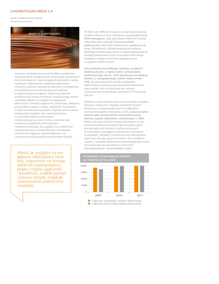 O KGHM POLSKA MIEDŹ S.A. KGHM LIDEREM RYNKU MIEDZI Miedź dla przyszłości W 1825 roku William Sturgeon zwinął wokół żelaznej sztabki izolowany drut miedziany, tworząc pier ws zy elek t r omagnes . Idąc jego śladem Michael Faraday odkrył zjawisko indukcji i zbudował s ilnik elek t r y czny . Dziś silniki elektryczne napędzają cały świat. W milionach silników prąd płynie zwojami cienkiego miedzianego drutu. A będzie płynął jeszcze bardziej intensywnie wraz z rozwojem technologii służących między innymi do napędzania aut z napędem elektrycznym. Surowce, produkowane przez Spółkę są podstawą nowoczesnych i bezpiecznych technologii, kluczowych dla teraźniejszości i wyznaczających przyszłość naszej cywilizacji. Jednocześnie miedź jest pierwszym metalem, z którym zetknął się człowiek, a umiejętność jej wydobywania i przetwarzania jest jednym z najdonioślejszych odkryć. Dzięki niej człowiek pożegnał się z epoką kamienia, rozpoczynając rozwój cywilizacji. Miedź, ze względu na wyjątkowe właściwości: trwałość, odporność na korozje, zdolności przewodzenia prądu i ciepła, ciągliwość i kowalność, a także ponadczasowy połysk, znajduje zastosowanie praktycznie wszędzie. Jest wykorzystywana w przemyśle elektrotechnicznym i elektroenergetycznym, trudno sobie bez niej wyobrazić urządzenia informatyczne i telekomunikacyjne. Ze względu na trwałość jest wykorzystywana w budownictwie i instalacjach sanitarnych, sięga po nią biomedycyna, ale i producenci tradycyjnych instrumentów dętych. Do pr oduk cj i ws zelk iego r odzaj u ur ządzeń elek t r y czny ch, a t ak że k abli i pr zewodów wy k or zy s t uj e s ię ok . 35% ś wiat owej pr oduk cj i miedzi, a uwzględniaj ąc t ak że elek t r onik ę – 38%, bo przecież prawie każde urządzenie elektroniczne wykorzystuje doskonałe właściwości tego metalu. Jest on kluczowy dla rozwoju nowoczesnych technologii, systemów IT i transmisji danych. Miedź ma coraz większe zastosowanie także w służbie zdrowia i medycynie. Według trzyletnich testów klinicznych, przeprowadzonych na oddziałach intensywnej opieki medycznej w USA, zas t os owanie miedzi j ak o powier zchni ant y bak t er y j nej , obniża r y zy k o zak ażenia s zpit alnego o 40%. Miejsce na zastosowanie miedzi i jej stopów w celu przerwania łańcucha zakażeń jest wszędzie, gdzie panuje duży ruch ludności, czyli na poręczach w tramwajach, pociągach i autobusach, klamkach w urzędach, szkołach, na dworcach itp. Rozwiązania tego typu stosuje się już na świecie, np. w chilijskim metrze. Z powodu właściwości bakteriobójczych metal ten doskonale się sprawdza w systemach klimatyzacyjnych i wymiennikach ciepła. Rynek opracowuje coraz to nowsze zastosowania dla miedzi. Według raportu Copper Technology Roadmap (CTR) metal ten sprawdzi się chociażby w rozwijającej się branży ener get y k i odnawialnej (np. w elektrowniach wiatrowych miedź stosowana jest w uzwojeniach stojanów i wirników generatorów, przewodach wysokiego napięcia oraz uzwojeniach transformatorowych). Jak wynika z raportu agencji Frost and Sullivan dla Europejskiego Instytutu Miedzi (ECI), turbina wiatrowa o mocy 2 MW wymaga zastosowania ok. 15 –20 ton miedzi. Przewiduje się także coraz większe wykorzystanie miedzi w far mach mor s k ich . Dotychczas stosowane plastikowe klatki do hodowli zwierząt morskich zbyt szybko zarastały glonami, te z wykorzystaniem miedzi nie tylko nie zarastają, ale przez to, że są wolne od zanieczyszczeń tworzą znacznie zdrowsze środowisko dla ryb czy skorupiaków. Stopy miedzi i tworzyw sztucznych, ze względu na swoją odporność i elastyczność, mogą także znaleźć zastosowanie w konstrukcjach budynków o podwyższonej odporności na wstrząsy sejsmiczne. Przemysł miedziowy wciąż poszukuje nowych, przyszłych zastosowań tego metalu lub rozszerzenia tych, do których jest wykorzystywana obecnie. Miedź ma jeszcze jeden walor, pozycjonujący ją wśród surowców o wielkim znaczeniu dla zrównoważonego rozwoju – według szacunków ok . 80% dot y chczas wy doby t ej miedzi ponownie t r afił o do obiegu gos podar czego . Pod tym względem metal ten ustępuje tylko żelazu i aluminium.