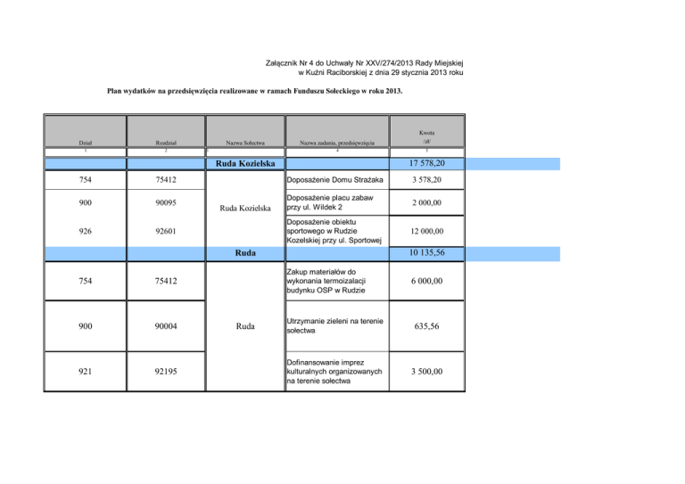 Załącznik Nr 4 do Uchwały Nr XXV/274/2013 Rady Miejskiej w Kuźni Raciborskiej z dnia 29 stycznia 2013 roku Plan wydatków na przedsięwzięcia realizowane w ramach Funduszu Sołeckiego w roku 2013. Dział Rozdział 1 2 Nazwa Sołectwa 3 Nazwa zadania, przedsięwzięcia Kwota /zł/ 4 5 17 578,20 Ruda Kozielska 754 75412 900 90095 926 92601 Ruda Kozielska Doposażenie Domu Strażaka 3 578,20 Doposażenie placu zabaw przy ul. Wildek 2 2 000,00 Doposażenie obiektu sportowego w Rudzie Kozelskiej przy ul. Sportowej 12 000,00 10 135,56 Ruda 754 75412 900 90004 921 92195 Zakup materiałów do wykonania termoizalacji budynku OSP w Rudzie Ruda 6 000,00 Utrzymanie zieleni na terenie sołectwa 635,56 Dofinansowanie imprez kulturalnych organizowanych na terenie sołectwa 3 500,00 17 069,30 Siedliska 600 60016 900 90004 Siedliska Wykonanie nawierzchni ul. Młyńskiej i ulic przyległych Utrzymanie zieleni na terenie sołectwa 16 769,30 300,00 13 634,00 Jankowice 750 75075 Zakupy materiałów promocyjnych 750 75095 Zakup materiałów biurowych 700,00 900 90004 Utrzymanie zieleni na terenie wsi 1 400,00 900 90095 Doposażenie placu zabaw 5 000,00 90095 Zakup materiałów i narzędzi koniecznych do realizacji drobnych i średnich remontów pomieszczeń i urządzeń użyteczności publicznej na terenie Jankowic 2 534,00 1 000,00 1 500,00 900 Jankowice 921 92195 Wymiana historycznego krzyża (wraz z figurą)na skrzyżowaniu ulic Wiejskiej i Polnej, upamiętniającego tragiczną epidemię tyfusu z 1847 roku i jeje ofiary 921 92195 Spotkania okolicznościowe mieszkańców 1 500,00 21 400,70 Turze 754 75412 Zakup aparatów powietrznych dla OSP Turze 7 000,00 900 90095 Utrzymanie estetyki urządzeń zabawowych i ławek na terenie sołectwa 200,00 92109 Wyposażenie namiotu w sprzęt niezbędnydo organizacjinimprez kulturalnych i okolicznościowych 900,00 10 200,00 3 000,70 921 Turze 921 92109 Wyposażenie namiotu w sprzęt niezbędnydo organizacjinimprez kulturalnych i okolicznościowych 921 92195 Organizacja imprez kulturalnych i okolicznościowych 926 92601 Utrzymanie w należytym stanie boiska do piłki nożnej i plażowej sołectwa 100,00 21 400,70 Rudy 921 92195 Rudy Budowa obiektu biesiadnego przy boisku LKS "Buk" Rudy 21 400,00 Budziska 754 75412 Zakup kostki brukowej i podbudowy do wykonania wjazdu do remizy OSP 900 90004 Utrzymanie zieleni na terenie sołectwa 900 90095 Zakup garażu blaszanego Budziska 921 92109 921 92109 921 92109 921 92195 21 400,70 4 000,00 400,00 1 500,00 Zakup materiałów na wykonanie remontu balkonu nad wejściem do świetlicy Zakup materiałów w celu wykonania posadzki w świetlicy wiejskiej Wykonanie remontu sieci instalacji elektrycznej w kuchni świetlicy wiejskiej 11 000,00 Organizacja imprez kulturalnych i okolicznościowych w sołectwie 1 500,00 Ogółem 2 000,00 1 000,00 122 618,46