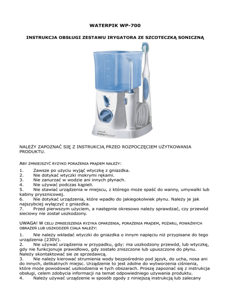 WATERPIK WP-700 INSTRUKCJA OBSŁUGI ZESTAWU IRYGATORA ZE SZCOTECZKĄ SONICZNĄ NALEŻY ZAPOZNAĆ SIĘ Z INSTRUKCJĄ PRZED ROZPOCZĘCIEM UŻYTKOWANIA PRODUKTU. ABY ZMNIEJSZYĆ RYZYKO PORAŻENIA PRĄDEM NALEŻY: 1. Zawsze po użyciu wyjąć wtyczkę z gniazdka. 2. Nie dotykać wtyczki mokrymi rękami. 3. Nie zanurzać w wodzie ani innych płynach. 4. Nie używać podczas kąpieli. 5. Nie stawiać urządzenia w miejscu, z którego może spaść do wanny, umywalki lub kabiny prysznicowej. 6. Nie dotykać urządzenia, które wpadło do jakiegokolwiek płynu. Należy je jak najszybciej wyłączyć z gniazdka. 7. Przed pierwszym użyciem, a następnie okresowo należy sprawdzać, czy przewód sieciowy nie został uszkodzony. UWAGA! W CELU ZMNIEJSZENIA RYZYKA OPARZENIA, PORAŻENIA PRĄDEM, POŻARU, POWAŻNYCH OBRAŻEŃ LUB USZKODZEŃ CIAŁA NALEŻY: 1. Nie należy wkładać wtyczki do gniazdka o innym napięciu niż przypisane do tego urządzenia (230V). 2. Nie używać urządzenia w przypadku, gdy: ma uszkodzony przewód, lub wtyczkę, gdy nie funkcjonuje prawidłowo, gdy zostało zniszczone lub upuszczone do płynu. Należy skontaktować sie ze sprzedawcą. 3. Nie należy kierować strumienia wody bezpośrednio pod język, do ucha, nosa ani do innych, delikatnych miejsc. Urządzenie to jest zdolne do wytworzenia ciśnienia, które może powodować uszkodzenia w tych obszarach. Proszę zapoznać się z instrukcja obsługi, celem zdobycia informacji na temat odpowiedniego używania produktu. 4. Należy używać urządzenie w sposób zgody z niniejszą instrukcją lub zalecany przez stomatologa. 5. Używać wyłącznie z końcówkami i akcesoriami zalecanymi przez Waterpik Technologies. 6. Należy napełniać zbiornik wodą lub płynami przepisanymi przez stomatologa. Płynu należy używać w stosunku 1:1 7. Nie wrzucać lub wkładać żadnych obcych przedmiotów do otwartego urządzenia. 8. Należy trzymać przewód z daleka od nagrzewanych powierzchni. 9. Nie włączać ani nie używać w miejscu, gdzie stosowany jest tlen lub preparaty w aerozolu. 10. Nie używać płynów do ust/ płukanek zawierających Jod, wybielacze lub olejek z drzewa herbacianego. 11. Przed zastosowaniem urządzenia powinno się usunąć biżuterię z jamy ustnej. 12. Nie należy używać urządzenia w przypadku posiadania ran w jamie ustnej. 13. Jeśli lekarz zalecił przyjmowanie antybiotyku przed wykonywaniem wszelkich czynności dentystycznych, należy skonsultować się ze stomatologiem przed użyciem tego urządzenia. 14. Do użytku domowego. Nie należy używać poza domem. 15. Należy dokładnie poinstruować dzieci oraz osoby specjalnej troski o właściwym sposobie użytkowania. UWAGA: 1. Nie należy odłączać miękkiej nakładki od przezroczystej końcówki do kieszonek dziąsłowych (Pik Pocket) 2. Nie należy używać urządzenia dłużej niż przez 5 minut i częściej, niż co 2 godziny. 3. Należy upewnić się, czy dzieci nie bawią sie urządzeniem. BATERIA W SZCZOTECZCE Szczoteczka operuje na 1 alkalicznej baterii typu AAA, by utrzymać najlepsze działanie szczoteczki należy wymienić ją na baterię tego samego typu. Usuń wyczerpaną baterię z urządzenia i utylizuj ją zgodnie z wymogami recyklingu. WAŻNE: nie zostawiaj zużytej baterii w szczoteczce NALEŻY ZACHOWAĆ TĘ INSTRUKCJĘ. OPIS PRODUKTU Classic JT-100e Końcówka klasyczna Plaque Seeker PS-100E Końcówka do mostów i koron Orthodontic OD-100E Końcówka do aparatów ortodontycznych Pik Pocket PP-100E Końcówka do kieszonek dziąsłowych Tongue Cleaner TB-100E Końcówka do języka Zalecana wymiana, co 6 miesięcy Zalecana wymiana, co 3 miesiące Zalecana wymiana, co 3 miesiące Zalecana wymiana, co 3 miesiące Zalecana wymiana, co 6 miesięcy *nie każdy model urządzenia zawiera wszystkie powyższe końcówki Końcówka do szczoteczki wersja STANDARD Zalecana wymiana, co 3 miesiące ABY URUCHOMIĆ URZĄDZENIE NALEŻY W PIERWSZEJ KOLEJNOŚCI WŁĄCZYĆ WTYCZKĘ DO KONTAKTU. 1. PRZYGOTOWANIE ZBIORNIKA: Zdejmij zbiornik i pokrywę z bazy. Napełnij zbiornik letnią woda. Nałóż pełny zbiornik na bazę, dociśnij. 2. NAKŁADANIE I ZDJEMOWANIE KOŃCÓWEK: Włóż końcówkę w otwór znajdujący sie na środku rączki, dociśnij. Delikatnie pociągnij końcówkę do góry by upewnić się, że została właściwie umieszczona. Aby wyjąć końcówkę z rękojeści należy nacisnąć przycisk na rękojeści i lekko pociągnąć końcówkę. 3. REGULACJA CIŚNIENIA: Włącz przycisk włącznika (0/I) na pozycje włączenia (I). Podczas pierwszej irygacji należy ustawić ciśnienie na najniższą pozycję (1) na pokrętle z regulacją ciśnienia (13). Przy kolejnych irygacjach można zwiększać ciśnienie, jednak należy robić to stopniowo. 4. UMIESZCZANIE W JAMIE USTNEJ: Umieść rękojeść z końcówką w ustach i pochyl sie nad umywalką. Ustaw pokrętło zmiany ciśnienia (1-3) na najniższe (1) i włącz przycisk włącznika (0/I) na pozycje włączenia ( I ). Woda powinna swobodnie spływać do umywalki. Po zakończeniu irygacji przełącz przycisk włącznika na pozycję (0). ZALECANA TECHNIKA UŻYCIA Skierować strumień pod kątem 90 stopni do linii dziąseł. Blisko ust, by uniknąć chlapania wodą, ale tak, by woda mogła swobodnie przepływać z ust do zlewu. Aby uzyskać najlepsze wyniki, należy zacząć od tylnich części jamy ustnej i płynnie przechodzić w kierunku przednich. Przesuwaj końcówkę wzdłuż linii dziąseł i zatrzymując ruch, na krótko, między zębami. Kontynuuj proces, dopóki nie oczyścisz wewnątrz i na zewnątrz zarówno górne, jak i dolne zęby. 1 ZAKOŃCZENIE PRACY Po zakończeniu irygacji wyłącz urządzenie (ustaw WŁĄCZNIK/WYŁĄCZNIK na pozycji 0) i opróżnij pojemnik. WSKAZÓWKI DOTYCZĄCE UŻYWANIA KOŃCÓWEK Końcówka PikPocket™ PP-100 zaprojektowana, by jak najdokładniej czyścić kieszenie dziąsłowe. Dzięki delikatnej końcówce zakończonej gumową nakładką ni
