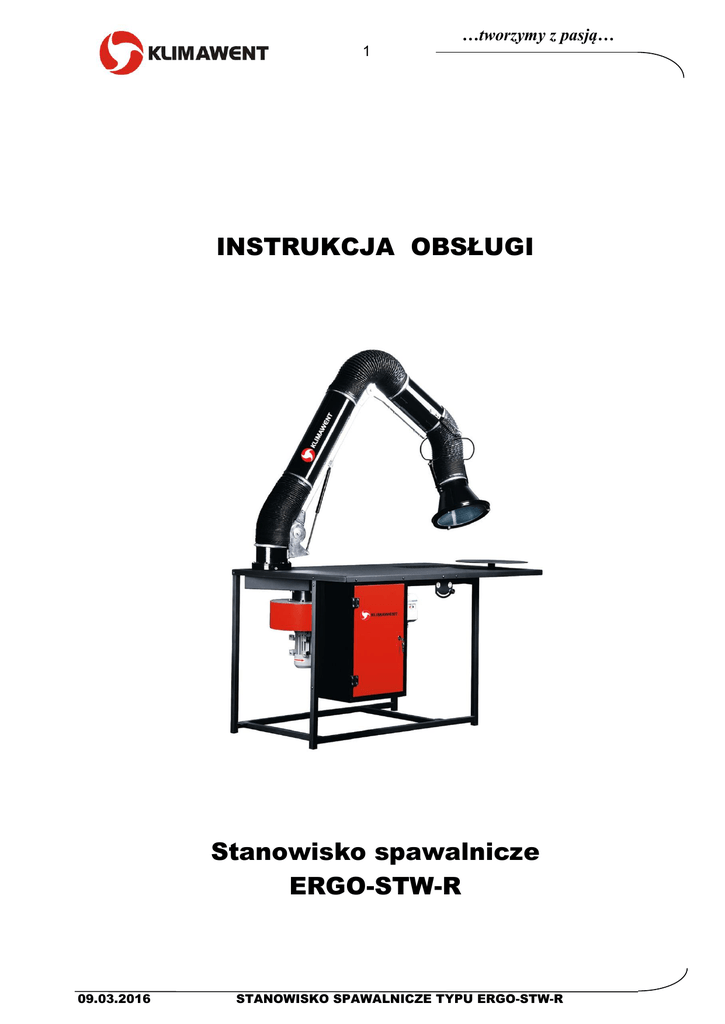 …tworzymy z pasją… 1 INSTRUKCJA OBSŁUGI Stanowisko spawalnicze ERGO-STW-R 09.03.2016 STANOWISKO SPAWALNICZE TYPU ERGO-STW-R …tworzymy z pasją… 2 Spis treści 1. Uwagi wstępne ………………………………………… 3 2. Przeznaczenie ………………………………………….. 4 3. Zastrzeżenia producenta …………………………….. 4 4. Dane techniczne ………………………………………. 4 5. Budowa i działanie ……………………………………. 5 6. Montaż i uruchomienie ……………………………….. 7 7. Użytkowanie …………………………………………….. 9 8. Zakłócenia w pracy, przyczyny, środki zaradcze …10 9. Instrukcja konserwacji ……………………………….. 10 10. Instrukcja BHP …………………………………………. 11 11. Transport i przechowywanie ………………………… 11 12. Warunki gwarancji …………………………………….. 12 13. Deklaracja zgodności ………………………………… 13 STANOWISKO SPAWALNICZE TYPU ERGO-STW-R 09.03.2016 …tworzymy z pasją… 3 1. UWAGI WSTĘPNE Niniejsza instrukcja obsługi przeznaczona jest dla nabywcy i przyszłego użytkownika stanowisk spawalniczych typu ERGO-STW-R. Jej celem jest dostarczenie użytkownikowi wskazówek odnośnie zastosowania, montażu, uruchamiania i eksploatacji w/w wyrobów. Przed przystąpieniem do montażu na stanowisku pracy i jego uruchomieniem należy dokładnie zapoznać się z treścią instrukcji. Ze względu na stałe udoskonalanie naszych wyrobów zastrzegamy sobie możliwość wprowadzania zmian konstrukcyjnych podwyższających walory użytkowe bezpieczeństwo urządzenia. Konstrukcja urządzenia filtrowentylacyjnego ERGO-STW-R odpowiada wymaganiom aktualnego poziomu techniki oraz zapewnienia bezpieczeństwa i zdrowia zawartych w: Dyrektywa 2006/42/WE Parlamentu Europejskiego i Rady z dnia17 maja 2006 r. w sprawie maszyn zmieniająca dyrektywę 95/16/WE (przekształcenie)/Dz. Urz. UE L157 z dn. 09.06.2006, str. 24/. Rozporządzenie Ministra Gospodarki z dnia 21 października 2008 r. w sprawie wymagań dla maszyn (Dz. U. Nr 199 z 2008 r. poz. 1228). Dyrektywa 2014/35/UE Parlamentu Europejskiego i Rady z dnia 26 lutego 2014 r. w sprawie harmonizacji ustawodawstw państw członkowskich odnoszących się do udostępniania na rynku sprzętu elektrycznego przewidzianego do stosowania w określonych granicach napięcia /Dz. Urz. UE L 96 z dnia 29 marca 2014 r./. Dyrektywa 2009/125/WE (ErP) Parlamentu Europejskiego i Rady z dnia 21 października 2009 r. ustanawiająca ogólne zasady ustalania wymogów dotyczących ekoprojektu dla produktów związanych z energią (Dz. U. L 285 z dn.31.10.2009) Rozporządzenie Komisji (UE) nr 327/2011 z dnia 30 marca 2011 r. w sprawie wykonania dyrektywy parlamentu Europejskiego i Rady 2009/125/WE w odniesieniu do wymogów dotyczących ekoprojektu dla wentylatorów napędzanych silnikiem elektrycznym o poborze mocy od 125 W do 500 kW (DZ. U. L nr 90 z dn. 06.04.2011). Spełnia wymagania następujących norm zharmonizowanych: PN-EN ISO-12100:2012 Bezpieczeństwo maszyn – Ogólne zasady projektowaniaOcena ryzyka i zmniejszanie ryzyka PN-EN 60204-1:2010 Bezpieczeństwo maszyn – Wyposażenie elektryczne maszyn – Część 1: Wymagania ogólne PN-EN ISO 13857:2010 Bezpieczeństwo maszyn – Odległości bezpieczeństwa uniemożliwiające sięganie kończynami górnymi i dolnymi do stref niebezpiecznych PN-EN 60529:2003 Stopnie ochrony zapewnianej przez obudowy (Kod IP) 09.03.2016 STANOWISKO SPAWALNICZE TYPU ERGO-STW-R …tworzymy z pasją… 4 2. PRZEZNACZENIE Stanowisko spawalnicze ERGO-STW-R jest przeznaczone do odciągania zapylonego powietrza ze stanowiska pracy - znad stołu spawalniczego – i oczyszczania go z suchych pyłów (bez zanieczyszczeń żrących lub stwarzających zagrożenie wybuchowe) oraz dymów powstających w trakcie prowadzenia prac szlifierskich , spawalniczych itp. Stosowane jest do obróbki drobnych elementów konstrukcyjnych w warsztatach ślusarskich. Usuwa zanieczyszczenia pyłowe zarówno od góry, przy pomocy ramienia ssącego, jak i od dołu, przez komorę ssącą z rusztem. Urządzenie wymaga podłączenia do instalacji wentylacyjnej odprowadzającej zanieczyszczone powietrze na zewnątrz. Maksymalna temperatura przetłaczanego powietrza wynosi 60°C. 3. ZASTRZEŻENIA PRODUCENTA Producent nie ponosi odpowiedzialności za skutki wynikające z niezgodnego z przeznaczeniem użytkowania urządzenia. A. Niedopuszczalne jest instalowanie na urządzeniu dodatkowych elementów niewchodzących w jego skład lub wyposażenie B. Niedopuszczalne są samowolne przeróbki lub modyfikacje urządzenia. C. Należy chronić obudowę urządzenia przed uszkodzeniami mechanicznymi. D. Urządzenie nie może być stosowane do przetłaczania powietrza zawierającego zanieczyszczenia: ● lepkie, które mogą osadzać się na urządzeniu ● żrące ● stwarzające zagrożenie wybuchem 4. DANE TECHNICZNE parametry optymalna wydajność powietrza średnica króćca podłączeniowego wentylatora napięcie moc wymiary gabarytowe stanowiska spawalniczego wymiary rusztu stołu roboczego wymiary stolika obrotowego masa poziom ciśnienia akustycznego jednostka miary m³/h mm V kW mm mm mm kg dB(A) STANOWISKO SPAWALNICZE TYPU ERGO-STW-R ERGO-STW-R 1500 160 3 x 400V; 50Hz 0,55 900 x 1500 x 915 490 x 195 Ø400 164 72 09.03.2016 …tworzymy z pasją… 5 5. BUDOWA I DZIAŁANIE W skład stanowiska spawalniczego ERGO-STW-R wchodzi: ● wentylator promieniowy, ● ramię ssące ERGO ze ssawką jako opcja, ● przepustnica, ● wyłącznik silnikowy, ● stół roboczy ze stolikiem obrotowym, ● szafka narzędziowa, ● komora ssąca z rusztem i szufladą na odpady. Rys. 1 Opis budowy stanowiska spawalniczego typu ERGO-STW-R 09.03.2016 STANOWISKO SPAWALNICZE TYPU ERGO-STW-R …tworzymy z pasją… 6 Rys. 2 Wymiary stanowiska spawalniczego typu ERGO