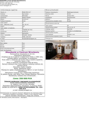 MANAGEM Lucyna Gembal-Skrobotowicz Hallera 115/4, 53-201 Wrocław tel.514 185 009 fax. e-mail:[email protected] www.managem.eu Informacje ogólne Nieruchomość Oferta nr MAN-MS-317 Rodzaj mieszkania jednopoziomowe Rodzaj sprzedaż Piwnica [m2] 8,00 Lokalizacja Wrocław Okna nowe PCV Dzielnica Stare Miasto Instalacje wymienione Rejon Centrum Balkon jest Rodzaj budynku blok Powierzchnia działki [m2] 0.00 Ilość pokoi 4 Pow. całkowita [m2] 51.78 m² Piętro 3p Ilość pięter w budynku Cena 4 350000.00 PLN Cena/m2 6759.37 Status aktualna Imię i nazwisko Wojtek Jamka Telefon 508 138 632 E-mail [email protected] Opis Plac zabaw nie Alarm nie Winda nie Drzwi antywłamaniowe nie Ilość kondygnacji 4 Mieszkanie w Centrum Wrocławia. Powierzchnia mieszkania to 52 m2. Mieszkanie 4pokojowe. Znajduje się na 3 piętrze w 4piętrowym bloku z 1964 roku. Posiada balkon wychodzący na podwórko. Duży salon z wejściem do kuchni oraz 3 osobne sypialnie. Łazienka razem z WC. Piony w budynku wymienione kilka lat temu. Remont elewacji oraz nowe balkony zostaną zrobione do czerwca 2015r. Wszystkie media miejskie. Nowe, plastikowe okna. Miesięczne opłaty eksploatacyjne to 480 zł ( w tym fundusz remontowy). Mieszkanie znajduje się w doskonałej lokalizacji. W pobliżu Rynek, plac Nowy Targ, Wyspa Słodowa, Panorama Racławicka, Katedra oraz Uniwersytet. Cena: 350 000 PLN Polecam serdecznie i zapraszam na prezentację! BIURO NIERUCHOMOŚCI MANAGEM ul. Hallera 115/4 53-201 Wrocław Pośrednik odpowiedzialny zawodowo: nr licencji 20487 OSOBA DO KONTAKTU: ANNA WYSOCZAŃSKA TEL. 533388-818 e-mail: [email protected] Zamieszczone na naszych stronach ogłoszenia nie stanowią oferty w rozumieniu Kodeksu Cywilnego, a dane w nich zawarte mają jedynie charakter informacyjny i mogą ulec zmianie. © Wszelkie prawa zastrzeżone - Managem Pomieszczenia Ilość pokoi 4 Powierzchnia pokoi 20; 8; 8; 8 Podłogi pokoi parkiet Rodzaj kuchni wnęka w przedpokoju Powierzchnia kuchni 3,5 Typ łazienki razem z wc Powierzchnia łazienki [m2] 5,5 Zdjęcia