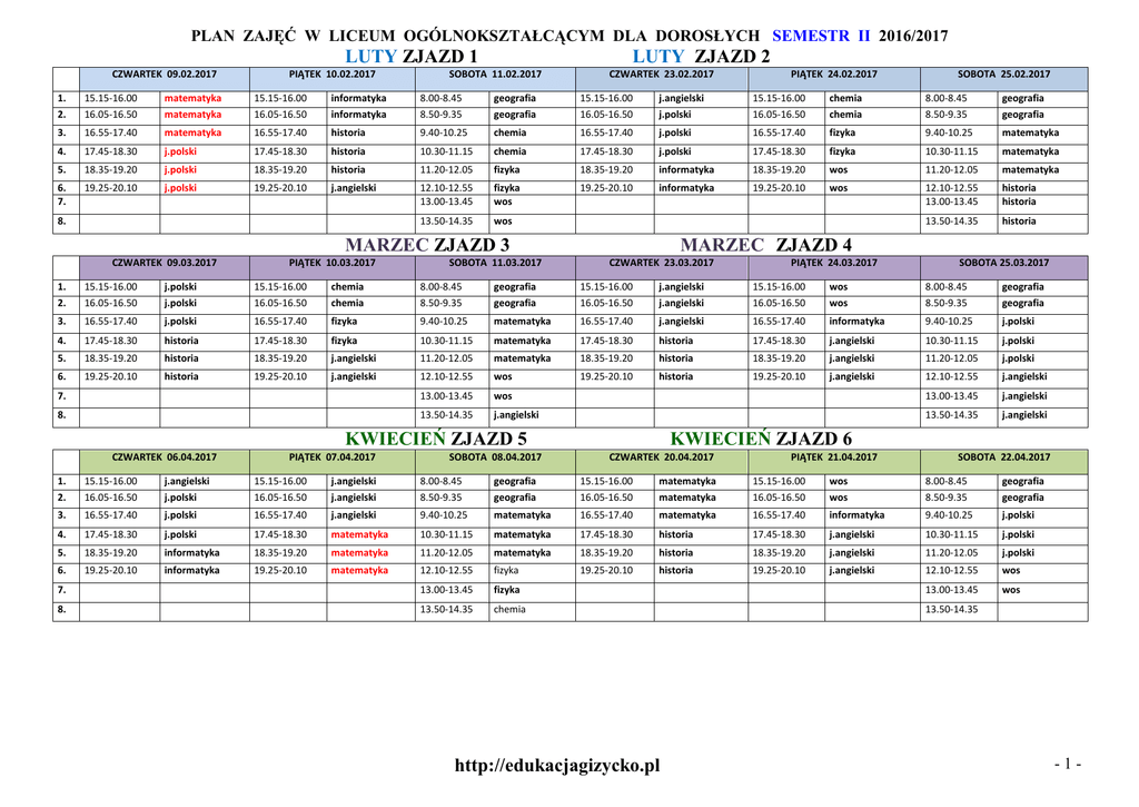 PLAN ZAJĘĆ W LICEUM OGÓLNOKSZTAŁCĄCYM DLA DOROSŁYCH SEMESTR II 2016/2017 LUTY ZJAZD 1 CZWARTEK 09.02.2017 PIĄTEK 10.02.2017 LUTY ZJAZD 2 SOBOTA 11.02.2017 CZWARTEK 23.02.2017 PIĄTEK 24.02.2017 SOBOTA 25.02.2017 1. 2. 15.15-16.00 16.05-16.50 matematyka matematyka 15.15-16.00 16.05-16.50 informatyka informatyka 8.00-8.45 8.50-9.35 geografia geografia 15.15-16.00 16.05-16.50 j.angielski j.polski 15.15-16.00 16.05-16.50 chemia chemia 8.00-8.45 8.50-9.35 geografia geografia 3. 16.55-17.40 matematyka 16.55-17.40 historia 9.40-10.25 chemia 16.55-17.40 j.polski 16.55-17.40 fizyka 9.40-10.25 matematyka 4. 17.45-18.30 j.polski 17.45-18.30 historia 10.30-11.15 chemia 17.45-18.30 j.polski 17.45-18.30 fizyka 10.30-11.15 matematyka 5. 18.35-19.20 j.polski 18.35-19.20 historia 11.20-12.05 fizyka 18.35-19.20 informatyka 18.35-19.20 wos 11.20-12.05 matematyka 6. 7. 19.25-20.10 j.polski 19.25-20.10 j.angielski 12.10-12.55 13.00-13.45 fizyka wos 19.25-20.10 informatyka 19.25-20.10 wos 12.10-12.55 13.00-13.45 historia historia 13.50-14.35 wos 13.50-14.35 historia 8. MARZEC ZJAZD 3 CZWARTEK 09.03.2017 PIĄTEK 10.03.2017 SOBOTA 11.03.2017 MARZEC ZJAZD 4 CZWARTEK 23.03.2017 PIĄTEK 24.03.2017 SOBOTA 25.03.2017 1. 2. 15.15-16.00 16.05-16.50 j.polski j.polski 15.15-16.00 16.05-16.50 chemia chemia 8.00-8.45 8.50-9.35 geografia geografia 15.15-16.00 16.05-16.50 j.angielski j.angielski 15.15-16.00 16.05-16.50 wos wos 8.00-8.45 8.50-9.35 geografia geografia 3. 16.55-17.40 j.polski 16.55-17.40 fizyka 9.40-10.25 matematyka 16.55-17.40 j.angielski 16.55-17.40 informatyka 9.40-10.25 j.polski 4. 17.45-18.30 historia 17.45-18.30 fizyka 10.30-11.15 matematyka 17.45-18.30 historia 17.45-18.30 j.angielski 10.30-11.15 j.polski 5. 18.35-19.20 historia 18.35-19.20 j.angielski 11.20-12.05 matematyka 18.35-19.20 historia 18.35-19.20 j.angielski 11.20-12.05 j.polski 6. 19.25-20.10 historia 19.25-20.10 j.angielski 19.25-20.10 historia 19.25-20.10 j.angielski 12.10-12.55 wos 12.10-12.55 j.angielski 7. 13.00-13.45 wos 13.00-13.45 j.angielski 8. 13.50-14.35 j.angielski 13.50-14.35 j.angielski KWIECIEŃ ZJAZD 5 CZWARTEK 06.04.2017 PIĄTEK 07.04.2017 SOBOTA 08.04.2017 KWIECIEŃ ZJAZD 6 CZWARTEK 20.04.2017 PIĄTEK 21.04.2017 SOBOTA 22.04.2017 1. 2. 15.15-16.00 16.05-16.50 j.angielski j.polski 15.15-16.00 16.05-16.50 j.angielski j.angielski 8.00-8.45 8.50-9.35 geografia geografia 15.15-16.00 16.05-16.50 matematyka matematyka 15.15-16.00 16.05-16.50 wos wos 8.00-8.45 8.50-9.35 geografia geografia 3. 16.55-17.40 j.polski 16.55-17.40 j.angielski 9.40-10.25 matematyka 16.55-17.40 matematyka 16.55-17.40 informatyka 9.40-10.25 j.polski 4. 17.45-18.30 j.polski 17.45-18.30 matematyka 10.30-11.15 matematyka 17.45-18.30 historia 17.45-18.30 j.angielski 10.30-11.15 j.polski 5. 18.35-19.20 informatyka 18.35-19.20 matematyka 11.20-12.05 matematyka 18.35-19.20 historia 18.35-19.20 j.angielski 11.20-12.05 j.polski 6. 19.25-20.10 informatyka 19.25-20.10 matematyka 12.10-12.55 fizyka 19.25-20.10 historia 19.25-20.10 j.angielski 12.10-12.55 wos 7. 13.00-13.45 fizyka 13.00-13.45 wos 8. 13.50-14.35 chemia 13.50-14.35 http://edukacjagizycko.pl -1- MAJ ZJAZD 7 CZWARTEK 25.05.2017 PIĄTEK 26.05.2017 CZERWIEC ZJAZD 8 SOBOTA 27.05.2017 CZWARTEK 08.06.2017 PIĄTEK 09.06.2017 SOBOTA 10.06.2017 1. 2. 15.15-16.00 16.05-16.50 j.polski j.polski 15.15-16.00 16.05-16.50 fizyka fizyka 8.00-8.45 8.50-9.35 geografia geografia 15.15-16.00 16.05-16.50 matematyka matematyka 15.15-16.00 16.05-16.50 informatyka informatyka 8.00-8.45 8.50-9.35 geografia j.polski 3. 16.55-17.40 j.polski 16.55-17.40 j.angielski 9.40-10.25 matematyka 16.55-17.40 matematyka 16.55-17.40 historia 9.40-10.25 j.polski 4. 17.45-18.30 historia 17.45-18.30 j.angielski 10.30-11.15 matematyka 17.45-18.30 j.polski 17.45-18.30 historia 10.30-11.15 j.polski 5. 18.35-19.20 historia 18.35-19.20 11.20-12.05 matematyka 18.35-19.20 j.polski 18.35-19.20 historia 11.20-12.05 wos 6. 19.25-20.10 historia 19.25-20.10 19.25-20.10 j.polski 19.25-20.10 12.10-12.55 matematyka 12.10-12.55 wos 7. 13.00-13.45 j.angielski 13.00-13.45 wos 8. 13.50-14.35 j.angielski 13.50-14.35 http://edukacjagizycko.pl -2-