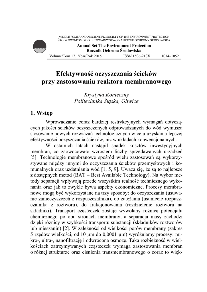MIDDLE POMERANIAN SCIENTIFIC SOCIETY OF THE ENVIRONMENT PROTECTION ŚRODKOWO-POMORSKIE TOWARZYSTWO NAUKOWE OCHRONY ŚRODOWISKA Annual Set The Environment Protection Rocznik Ochrona Środowiska Volume/Tom 17. Year/Rok 2015 ISSN 1506-218X 1034–1052 Efektywność oczyszczania ścieków przy zastosowaniu reaktora membranowego Krystyna Konieczny Politechnika Śląska, Gliwice 1. Wstęp Wprowadzanie coraz bardziej restrykcyjnych wymagań dotyczących jakości ścieków oczyszczonych odprowadzanych do wód wymusza stosowanie nowych rozwiązań technologicznych w celu uzyskania lepszej efektywności oczyszczania ścieków, niż w układach konwencjonalnych. W ostatnich latach nastąpił spadek kosztów inwestycyjnych membran, co zaowocowało wzrostem liczby sprzedawanych urządzeń [5]. Technologie membranowe spośród wielu zastosowań są wykorzystywane między innymi do oczyszczania ścieków przemysłowych i komunalnych oraz uzdatniania wód [1, 5, 9]. Uważa się, że są to najlepsze z dostępnych metod (BAT – Best Available Technology). Na wybór metody separacji wpływają przede wszystkim realność technicznego wykonania oraz jak to zwykle bywa aspekty ekonomiczne. Procesy membranowe mogą być wykorzystane na trzy sposoby: do oczyszczania (usuwanie zanieczyszczeń z rozpuszczalnika), do zatężania (usunięcie rozpuszczalnika z roztworu), do frakcjonowania (rozdzielenie roztworu na składniki). Transport cząsteczek zostaje wywołany różnicą potencjału chemicznego po obu stronach membrany, a separacja masy zachodzi dzięki różnicy w szybkości transportu substancji (składników roztworów lub mieszanin) [2]. W zależności od wielkości porów membrany (zakres 5 rzędów wielkości, od 10 µm do 0,0001 µm) wyróżniamy procesy: mikro-, ultra-, nanofiltrację i odwróconą osmozę. Taka rozbieżność w wielkościach zatrzymywanych cząsteczek wymaga zastosowania membran o różnej strukturze oraz ciśnienia transmembranowego o coraz to więk- Efektywność oczyszczania ścieków przy zastosowaniu reaktora… 1035 szych wartościach. Wraz ze zmniejszaniem się wielkości porów membrany, wzrasta opór hydrauliczny dla strumienia zasilającego dla poszczególnych procesów. Technika ultrafiltracji (UF) daje możliwość separowania cząsteczek o masie molowej większej niż 500 Da, czyli o rozmiarach w przedziale 2–20 nm. UF posiada szerokie zastosowanie przede wszystkim w oczyszczaniu wód i ścieków, stanowiąc rozwiązanie alternatywne dla metod konwencjonalnych [2]. Wykorzystanie UF jest jednak ograniczone tzw. foulingiem. Jest to proces odkładania się substancji na powierzchni i/lub w porach, przez co wydajność hydrauliczna membrany spada. Jeżeli układ membranowy pracuje przy stałej wydajności permeatu, wówczas następuje wzrost ciśnienia. Jeśli z kolei instalacja pracuje przy stałym ciśnieniu, skutkuje to spadkiem wydajności pracy układu. Fouling jest zjawiskiem charakterystycznym dla wszystkich ciśnieniowych technik membranowych, ale przede wszystkim dla technik wykorzystujących membrany porowate (MF,UF). Zjawisko foulingu może mieć charakter zarówno odwracalny jak i nieodwracalny. Odwracalny jest wtedy, kiedy istnieje możliwość przywrócenia pierwotnej wydajności membrany poprzez całkowite usunięcie osadu. Czasem jednak mimo podjęcia działań czyszczenia mechanicznego, a nawet chemicznego nie da się przywrócić początkowej wydajności membrany. Wówczas mamy do czynienia z foulingiem nieodwracalnym [2]. Sposobem na zmniejszenie zjawiska foulingu jest przeprowadzanie płukania wstecznego (ang. backflushing) o częstotliwości wg zapotrzebowania. Proces polega na przepływie permeatu w przeciwnym kierunku niż w trakcie normalnej pracy instalacji. Nowszą metodą jest tak zwane płukanie z użyciem powietrza (ang. airflushing) lub płukanie typu powietrze/woda [1, 2]. Technologia z wykorzystaniem reaktorów membranowych jest rozwinięciem i unowocześnieniem metody osadu czynnego. Podstawową różnicą jest zastąpienie osadników wtórnych, występujących w klasycznej metodzie osadu czynnego, systemem mikroporowych (najczęściej mikro- lub ultrafiltracyjnych) membran filtracyjnych umieszczonych bezpośrednio w napowietrzanej komorze osadu czynnego lub jako urządzenie wydzielone w osobnym zbiorniku. Połączenie ciśnieniowych technik membranowych (UF lub MF) z metodą biologicznego oczyszczania (np. metoda osadu czynnego, złoża biologicznego lub zaimmobilizowanych enzymów) potocznie nosi nazwę 1036 Krystyna Konieczny bioreaktorów membranowych (MBR). Występują dwie zasadnicze konfiguracje MBR; moduł membranowy może być zanurzony w reaktorze biologicznym, wówczas stanowi jedną całość. Mogą również stanowić odrębne urządzenia. Różnica polega na tym, że w pierwszym przypadku gdy membrana zespolona jest z reaktorem – wypływa tylko permeat, ponieważ osad czynny pozostaje w reaktorze. Natomiast, kiedy moduł membranowy jest oddzielony od reaktora, wówczas powstaje również retentat, który zawracany jest do reaktora [14]. Główną rolą modułu membranowego jest separacja osadu czynnego od oczyszczonych ścieków, który spełnia więc funkcję klasycznego osadnika wtórnego. Poza tym membrana poprzez nagromadzenie się na jej powierzchni warstwy osadu czynnego przyczynia się do usuwania zanieczyszczeń (spadek ChZT, BZT5, część soli biogennych). Z powodu zatrzymywania przez membranę związków wielkocząsteczkowych i dłuższego czasu przebywania osadu czynnego w reaktorze, następuje także możliwość usuwania mikrozanieczyszczeń trudno biodegradowalnych jak: pestycydy, substancje hormonalne czy farmaceutyki. Bowiem długi wiek osadu w reaktorze sprzyja rozwojowi specyficznych wolno namnażających się bakteri zdolnych do usuwania tych związków [15]. Biologiczne reaktory membranowe (MBR) posiadają wiele zalet w porównaniu z konwencjonalnymi reaktorami osadu czynnego, z których najważniejsze