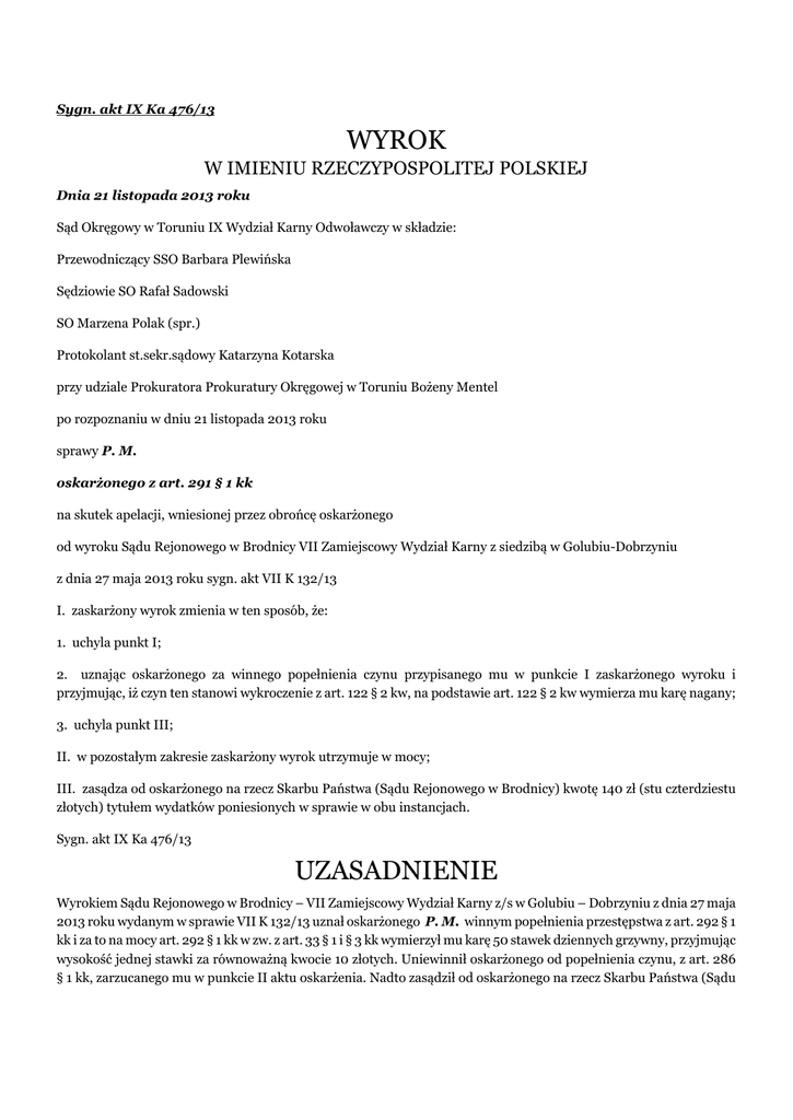 Sygn. akt IX Ka 476/13 WYROK W IMIENIU RZECZYPOSPOLITEJ POLSKIEJ Dnia 21 listopada 2013 roku Sąd Okręgowy w Toruniu IX Wydział Karny Odwoławczy w składzie: Przewodniczący SSO Barbara Plewińska Sędziowie SO Rafał Sadowski SO Marzena Polak (spr.) Protokolant st.sekr.sądowy Katarzyna Kotarska przy udziale Prokuratora Prokuratury Okręgowej w Toruniu Bożeny Mentel po rozpoznaniu w dniu 21 listopada 2013 roku sprawy P. M. oskarżonego z art. 291 § 1 kk na skutek apelacji, wniesionej przez obrońcę oskarżonego od wyroku Sądu Rejonowego w Brodnicy VII Zamiejscowy Wydział Karny z siedzibą w Golubiu-Dobrzyniu z dnia 27 maja 2013 roku sygn. akt VII K 132/13 I. zaskarżony wyrok zmienia w ten sposób, że: 1. uchyla punkt I; 2. uznając oskarżonego za winnego popełnienia czynu przypisanego mu w punkcie I zaskarżonego wyroku i przyjmując, iż czyn ten stanowi wykroczenie z art. 122 § 2 kw, na podstawie art. 122 § 2 kw wymierza mu karę nagany; 3. uchyla punkt III; II. w pozostałym zakresie zaskarżony wyrok utrzymuje w mocy; III. zasądza od oskarżonego na rzecz Skarbu Państwa (Sądu Rejonowego w Brodnicy) kwotę 140 zł (stu czterdziestu złotych) tytułem wydatków poniesionych w sprawie w obu instancjach. Sygn. akt IX Ka 476/13 UZASADNIENIE Wyrokiem Sądu Rejonowego w Brodnicy – VII Zamiejscowy Wydział Karny z/s w Golubiu – Dobrzyniu z dnia 27 maja 2013 roku wydanym w sprawie VII K 132/13 uznał oskarżonego P. M. winnym popełnienia przestępstwa z art. 292 § 1 kk i za to na mocy art. 292 § 1 kk w zw. z art. 33 § 1 i § 3 kk wymierzył mu karę 50 stawek dziennych grzywny, przyjmując wysokość jednej stawki za równoważną kwocie 10 złotych. Uniewinnił oskarżonego od popełnienia czynu, z art. 286 § 1 kk, zarzucanego mu w punkcie II aktu oskarżenia. Nadto zasądził od oskarżonego na rzecz Skarbu Państwa (Sądu Rejonowego w Brodnicy) kwotę 50 złotych tytułem opłaty sądowej i obciążył go wydatkami poniesionymi w sprawie w kwocie 90 złotych. Wyrok w zakresie rozstrzygnięć zawartych w punktach I i III zaskarżył obrońca oskarżonego, zarzucając temu orzeczeniu: 1. obrazę przepisów prawa procesowego, która miała wpływ na treść wyroku, a w szczególności przepisów: • art. 2 § 2 kpk poprzez naruszenie zasady prawdy materialnej i przyjęcie za podstawę wyroku stanu faktycznego ustalonego w sposób dowolny; • art. 4 kpk poprzez oparcie orzeczenia o winie oskarżonego wyłącznie na dowodach obciążających; • art. 5 § 2 kpk rozstrzygnięcie wszystkich wątpliwości na niekorzyść oskarżonego; • art. 6 § 1 kpk poprzez przeprowadzenie ostatniej rozprawy pod nieobecność zarówno oskarżonego jak i jego obrońcy w sytuacji gdy obrońca telefonicznie zarówno w piątek 24 maja jak również w dniu rozprawy (27 maja 2013r.) otrzymał informację, iż nie nadeszło pismo z salonu sieci komórkowej w G.i w związku z powyższym poinformował Sąd, iż nie przyjedzie z T.na rozprawę do G.a Sąd pomimo tego zdecydował się uzyskać informację o wartości aparatu telefonicznego uniemożliwiając oskarżonemu wypowiedzenie się w przedmiocie tak wątpliwie zebranego dowodu notabene w sposób uniemożliwiający weryfikację prawdziwości uzyskanych danych, który posłużył Sądowi jako kluczowy dowód w niniejszej sprawie; • art. 7 kpk poprzez przekroczenie granic swobodnej oceny materiału dowodowego niezgodnego z zasadami prawidłowego rozumowania oraz wskazań i doświadczenia życiowego, bezkrytyczne przyjecie, iż działanie oskarżonego stanowiło przestępstwo z art. 291 § 1 kk w sytuacji gdy biorąc pod uwagę fakt, iż telefon nie był nowy, był bez dodatkowego wyposażenia a także faktu, iż oskarżony nie mógł przewidywać, iż może on pochodzić z kradzieży, gdyż nie był inicjatorem zakupu aparatu, kupił go od mężczyzny, który był w towarzystwie małego dziecka, a także sprawdził przed zakupem wartość używanego telefonu tego samego modelu w Internecie i zapłacił za niego cenę wynikającą z faktycznej wartości aparatu co winno stanowić o braku winy oskarżonego a tym samy prowadzić do uniewinnienie od stawianego mu zarzutu; 2. błąd w ustaleniach faktycznych przyjętych za jego podstawę, który miał wpływ na treść orzeczenia a polegający na przyjęciu, że oskarżony P. M. dopuścił się popełnienia czynu zarzucanego mu w punkcie I wyroku w sytuacji gdy: • oskarżony nie był inicjatorem zakupu telefonu – poniekąd kupił telefon od D. W. aby ten mógł uzyskać pieniądze na podróż do domu ze swoim dzieckiem, • okoliczność, iż D. W. był z dzieckiem uwiarygodniała osobę sprzedawcy i wykluczała świadomość oskarżonego co do możliwości pochodzenia telefonu z przestępstwa, • wartość przedmiotowego telefonu została ustalona przez Sąd I instancji w sposób całkowicie dowolny sprzeczny z jakąkolwiek logiką w sposób uniemożliwiający jakąkolwiek weryfikację dowodu telefonicznie przez co uniemożliwiano oskarżonemu jak również obronie wypowiedzenia się w przedmiocie dowodu ustalonego „przez telefon”, • określenie wartości telefonu w wysokości odpowiadającej nowemu aparatowi w sytuacji gdy przedmiotem transakcji pomiędzy oskarżonym a D. W. nie był aparat nowy w oryginalnym opakowaniu z akcesoriami – ładowarką, zestawem słuchawkowym a przedmiot transakcji stanowił aparat był nie tylko używany noszący widoczne ślady użytkowania (liczne rysy) w chwili dokonania transakcji w jego posiadanie wchodziła już trzecia osoba, i nie posiadał on wyposażenia ani oryginalnego opakowania oraz gwarancji, • transakcje zakupu używanego telefonu są czynnościami codziennymi a w tym konkretnym przypadku dotyczyła modelu telefonu co najwyżej średniej klasy i tym samym nie wymagają zachowania szczególnej formy czy też wyjątkowej ostrożności przy ich zawieraniu z uwagi na powszechność transakcji tego rodzaju w życiu codziennym. Podno