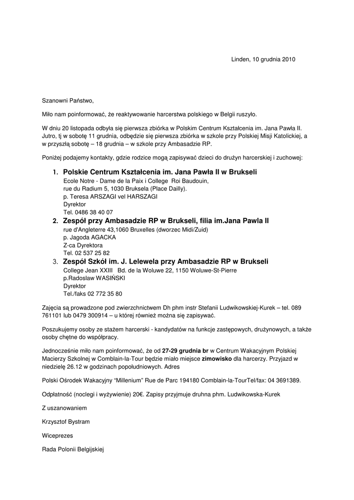 Linden, 10 grudnia 2010 Szanowni Państwo, Miło nam poinformować, że reaktywowanie harcerstwa polskiego w Belgii ruszyło. W dniu 20 listopada odbyła się pierwsza zbiórka w Polskim Centrum Kształcenia im. Jana Pawła II. Jutro, tj w sobotę 11 grudnia, odbędzie się pierwsza zbiórka w szkole przy Polskiej Misji Katolickiej, a w przyszłą sobotę – 18 grudnia – w szkole przy Ambasadzie RP. Poniżej podajemy kontakty, gdzie rodzice mogą zapisywać dzieci do drużyn harcerskiej i zuchowej: 1. Polskie Centrum Kształcenia im. Jana Pawła II w Brukseli Ecole Notre - Dame de la Paix i College Roi Baudouin, rue du Radium 5, 1030 Bruksela (Place Dailly). p. Teresa ARSZAGI vel HARSZAGI Dyrektor Tel. 0486 38 40 07 2. Zespół przy Ambasadzie RP w Brukseli, filia im.Jana Pawla II rue d'Angleterre 43,1060 Bruxelles (dworzec Midi/Zuid) p. Jagoda AGACKA Z-ca Dyrektora Tel. 02 537 25 82 3. Zespół Szkół im. J. Lelewela przy Ambasadzie RP w Brukseli College Jean XXIII Bd. de la Woluwe 22, 1150 Woluwe-St-Pierre p.Radoslaw WASIŃSKI Dyrektor Tel./faks 02 772 35 80 Zajęcia są prowadzone pod zwierzchnictwem Dh phm instr Stefanii Ludwikowskiej-Kurek – tel. 089 761101 lub 0479 300914 – u której również można się zapisywać. Poszukujemy osoby ze stażem harcerski - kandydatów na funkcje zastępowych, drużynowych, a także osoby chętne do współpracy. Jednocześnie miło nam poinformować, że od 27-29 grudnia br w Centrum Wakacyjnym Polskiej Macierzy Szkolnej w Comblain-la-Tour będzie miało miejsce zimowisko dla harcerzy. Przyjazd w niedzielę 26.12 w godzinach popołudniowych. Adres Polski Ośrodek Wakacyjny “Millenium” Rue de Parc 194180 Comblain-la-TourTel/fax: 04 3691389. Odpłatność (noclegi i wyżywienie) 20€. Zapisy przyjmuje druhna phm. Ludwikowska-Kurek Z uszanowaniem Krzysztof Bystram Wiceprezes Rada Polonii Belgijskiej