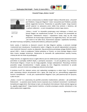 Dyskusyjny Klub Książki - Turek, 11 marca 2011 r. Krzysztof Varga „Gulasz z turula” W notce umieszczonej na okładce książki Tadeusz Olszański pisze: „Krzysztof jest Polakiem, Varga jest Węgrem”. Autor rzeczywiście jest Polakiem, posiada jednak węgierskie korzenie. Potwierdza to specyfika książki. Varga bowiem potrafi spojrzeć na opisywany przez siebie kraj zarówno z dystansu, jak i z pełnym oddaniem – co jest niewątpliwym atutem tego utworu. „Gulasz z turula” to niezwykle przejmujący esej traktujący o historii oraz pozycji Węgier we współczesnej Europie. To na pewno nie przewodnik po Węgrzech. Odwiedzane miejsca i napotykane osoby stają się dla Vargi pretekstem do krytycznego przyjrzenia się węgierskiej duszy. Jak sam mówi: „ten świat to nie tylko leczo, faszerowana papryka i zapiekanka kartoflana, ale także frustracja, kompleksy, nieuleczalna bolesna, pokręcona pamięć”. Autor uważa, iż tęsknota za dawnymi czasami nie daje Węgrom spokoju, a poczucie nostalgii i melancholii jest nieodzowne. Paradoksalnie żaden z Węgrów nie potrafi odpowiedzieć sensownie, czym świetność dawnych czasów się objawiała. Żyją przeszłością pamiętając potęgę Wielkich Węgier sprzed 1920 r., kiedy to podpisano Traktat pokojowy w Trianon, na mocy którego Węgrzy stracili dwie trzecie swojego terytorium. Wydarzenie to stanowiło dla społeczeństwa swoistą traumę, z której do dziś nie może się podźwignąć. Varga twierdzi, że węgierska dusza w ogóle skłonna jest do celebrowania porażek (stawianie licznych pomników na pamiątkę wielkich klęsk), a pomijania zwycięstw – to jest jej główną rysą. Wiecznie sfrustrowani Węgrzy z niczym się nie mogą pogodzić, niczego zaakceptować. Wyszukują mnóstwo powodów swego niezadowolenia i niejako upajają się nimi. Węgierska mentalność to przede wszystkim poczucie inności oraz pielęgnacja własnej martyrologii. A tytułowy turul? On, zdaniem autora, jest najbardziej nostalgiczny w całym kraju. To wymyślony ptak, stanowiący dziwne skrzyżowanie orła z gęsią. Dla Vargi jest on „personifikacją węgierskich marzeń i kompleksów” – to tak, jak z wyobrażeniem Węgrów o tym, jaka powinna być ich ojczyzna, a jaka nie jest. „Gulasz z turula” to z pewnością nie pamflet przeciwko madziarskości, jednakże – jak podkreślały Klubowiczki – w powieści pisarz bardzo mocno rozprawia się ze złudnymi marzeniami i narodowymi kompleksami węgierskimi. Nie brakuje tu kpin, ani dosadnych sformułowań. Warto jednak sięgnąć po tę „pigułkę węgierskości”. Varga bowiem świetnie, w bardzo przystępny sposób, odmalował w niej obraz społeczności węgierskiej. Agnieszka Tomczyk