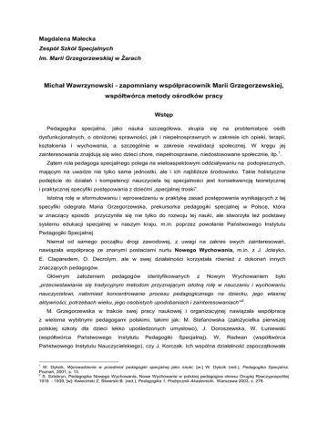 Magdalena Małecka Zespół Szkół Specjalnych Im. Marii Grzegorzewskiej w Żarach Michał Wawrzynowski - zapomniany współpracownik Marii Grzegorzewskiej, współtwórca metody ośrodków pracy Wstęp Pedagogika specjalna, jako nauka szczegółowa, skupia się na problematyce osób dysfunkcjonalnych, o obniżonej sprawności, jak i niepełnosprawnych w zakresie ich opieki, terapii, kształcenia i wychowania, a szczególnie w zakresie rewalidacji społecznej. W kręgu jej 1 zainteresowania znajdują się wiec dzieci chore, niepełnosprawne, niedostosowane społecznie, itp. . Zatem rola pedagoga specjalnego polega na wieloaspektowym oddziaływaniu na podopiecznych, mającym na uwadze nie tylko same jednostki, ale i ich najbliższe środowisko. Takie holistyczne podejście do działań i kompetencji nauczyciela tej specjalności jest konsekwencją teoretycznej i praktycznej specyfiki postępowania z dziećmi „specjalnej troski”. Istotną rolę w sformułowaniu i wprowadzeniu w praktykę zasad postępowania wynikających z tej specyfiki odegrała Maria Grzegorzewska, prekursorka pedagogiki specjalnej w Polsce, która w znaczący sposób przyczyniła się nie tylko do rozwoju tej nauki, ale stworzyła też podstawy systemu edukacji specjalnej w naszym kraju, m.in. poprzez powołanie Państwowego Instytutu Pedagogiki Specjalnej. Niemal od samego początku drogi zawodowej, z uwagi na zakres swych zainteresowań, nawiązała współpracę ze znanymi postaciami nurtu Nowego Wychowania, m.in. z J. Joteyko, E. Claparedem, O. Decrolym, ale w swej działalności korzystała również z dokonań innych znaczących pedagogów. Głównym założeniem pedagogów identyfikowanych z Nowym Wychowaniem było „przeciwstawianie się tradycyjnym metodom przyznającym istotną rolę w nauczaniu i wychowaniu nauczycielowi, natomiast koncentrowanie procesu pedagogicznego na dziecku, jego własnej 2 aktywności, potrzebach wieku, jego osobistych upodobaniach i zainteresowaniach"' . M. Grzegorzewska w trakcie swej pracy naukowej i organizacyjnej nawiązała współpracę z wieloma wybitnymi pedagogami polskimi, takimi jak: M. Stefanowska (założycielka pierwszej polskiej szkoły dla dzieci lekko upośledzonych umysłowo), J. Doroszewska, W. Łuniewski (współtwórca Państwowego Instytutu Pedagogiki Specjalnej), W. Radwan (współtwórca Państwowego Instytutu Nauczycielskiego), czy J. Korczak. Ich wspólna działalność zapoczątkowała 1 W. Dykcik, Wprowadzenie w przedmiot pedagogiki specjalnej jako nauki, [w:] W. Dykcik (red.), Pedagogika Specjalna, Poznań, 2001, s. 13. 2 S. Sztobryn, Pedagogika Nowego Wychowania, Nowe Wychowanie w polskiej pedagogice okresu Drugiej Rzeczypospolitej 1918 - 1939, [w]: Kwieciński Z, Śliwerski B. (red.), Pedagogika 1; Podręcznik Akademicki, Warszawa 2003, s. 278. funkcjonowanie ważnych instytucji pedagogicznych, działających na rzecz zaspokajania potrzeb dzieci o szczególnych potrzebach. Wśród współpracowników Marii Grzegorzewskiej, wybitnych praktyków i teoretyków pedagogiki specjalnej, szczególną rolę odegrał Michał Wawrzynowski. Jest to postać zapomniana. A przecież to właśnie on przyczynił się w ogromnej mierze do stworzenia podstaw metodyki nauczania specjalnego. Dlatego należy go przywrócić powszechnej świadomości pedagogów, czemu właśnie służy niniejsze opracowanie. Życie i działalność Michała Wawrzynowskiego Michał Wawrzynowski urodził się 1 września 1899 w Rabie Wyżnej. Pochodził z rodziny inteligenckiej, był synem nauczyciela. Po śmierci ojca opieką i wychowaniem Michała zajął się jego stryj, proboszcz w Nowym Targu. W czasie pierwszej wojny światowej młody Michał walczył jako żołnierz I Brygady Legionów, a po jej zakończeniu podjął studia w Warszawie i Wiedniu. Po powstaniu Państwowego Instytutu Pedagogiki Specjalnej, (co miało miejsce 4 lipca 1922 roku) Wawrzynowski związał się z tą placówką na dłużej, pełniąc funkcję jednego z wykładowców. Stał się również bliskim współpracownikiem dyrektora Instytutu – Marii Grzegorzewskiej. Głównym obszarem działalności Wawrzynowskiego były wykłady z metodyki nauczania i wychowania upośledzonych umysłowo, w których przedstawiał między innymi zagadnienia znaczenia naukowego i społecznego opieki wychowawczej nad upośledzonymi umysłowo, przystosowalności i samowystarczalności, zadań wychowawczych szkolnictwa specjalnego, jak również problematykę rozwoju fizycznego i psychicznego niepełnosprawnych intelektualnie. Wawrzynowski „swoje poglądy na temat nauczania i wychowania stosował w praktyce, w codziennej pracy w istniejącej przy Instytucie <<Szkole Ćwiczeń>>, której był kierownikiem 3 administracyjnym” . Poza pracą nauczycielską w Szkole Ćwiczeń i naukową w Instytucie Pedagogiki Specjalnej, Michał Wawrzynowski był czynnym działaczem Sekcji Szkolnictwa Specjalnego, powołanej do życia w roku 1924 przez Zarząd Główny Związku Nauczycielstwa Szkół Powszechnych. Sekcja wydawała kwartalnik Szkoła Specjalna, którego redaktorem naczelnym była M. Grzegorzewska, a funkcję redaktora odpowiedzialnego pełnił Wawrzynowski. Sekcja Szkolnictwa Specjalnego zorganizowała dwa Zjazdy Nauczycieli Szkół Specjalnych, podczas których Michał Wawrzynowski wygłosił referaty: Czytania i pisania metodą Decrolyego w zastosowaniu do szkolnictwa upośledzonych umysłowo, będący pierwszą próbą dostosowania tej metody do warunków polskich oraz Styczne momenty w nauczaniu i wychowaniu anormalnych różnych typów, poruszający problematykę zaspokajania potrzeb społecznych w szkolnictwie 4 specjalnym . 3 R. Marcinkowski, Życie i działalność pedagogiczna Michała Wawrzynowskiego, Niepublikowana praca magisterska napisana pod kierunkiem dr hab. W. Jamrożka, Poznań 1997. 4 Tamże, s. 109. Od 1925 roku Michał Wawrzynowski sprawował obowiązki wizytatora ministerialnego do spraw szkolnictwa specjalnego. 