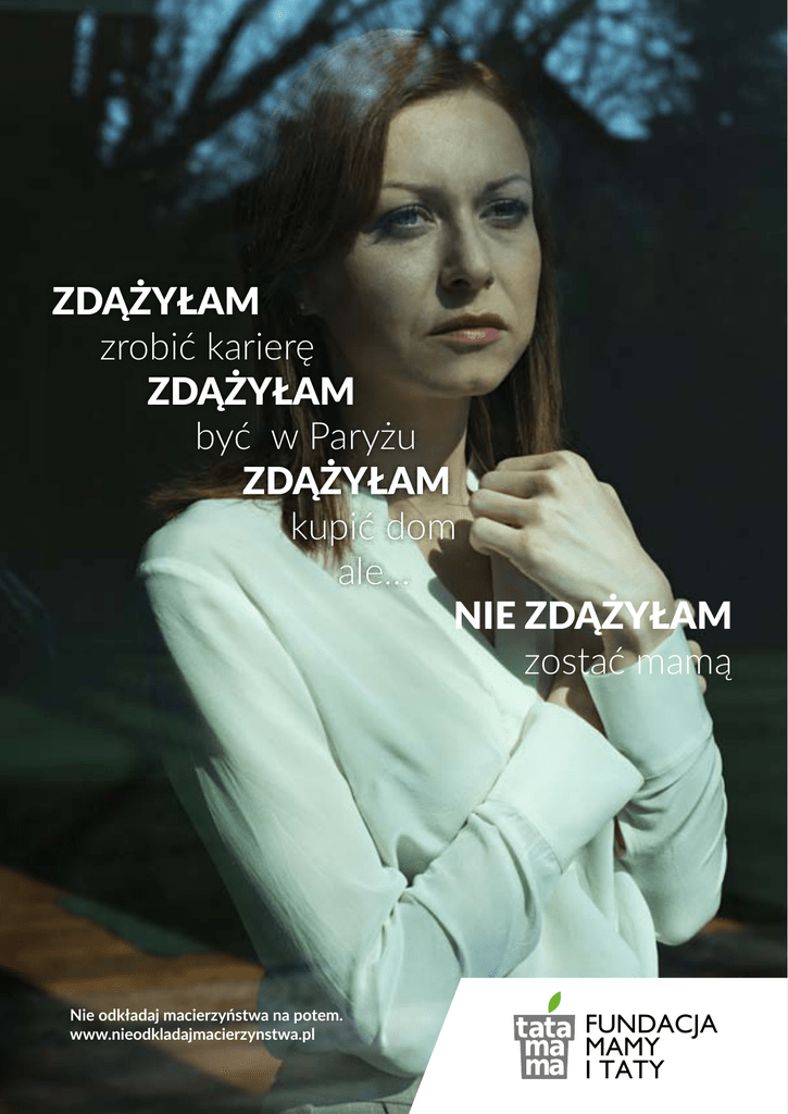 ZDĄŻYŁAM zrobić karierę ZDĄŻYŁAM być w Paryżu ZDĄŻYŁAM kupić dom ale... NIE ZDĄŻYŁAM zostać mamą Nie odkładaj macierzyństwa na potem. www.nieodkladajmacierzynstwa.pl FUNDACJA MAMY I TATY