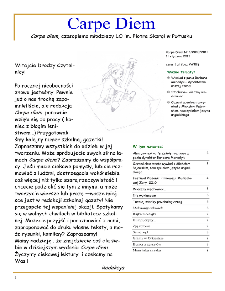Carpe Diem Carpe diem, czasopismo młodzieży LO im. Piotra Skargi w Pułtusku Carpe Diem Nr 1/2010/2011 11 stycznia 2011 Witajcie Drodzy Czytelnicy! cena: 1 zł. (bez VAT!!!) Ważne tematy: Po rocznej nieobecności znowu jesteśmy! Pewnie już o nas trochę zapomnieliście, ale redakcja Carpe diem ponownie wzięła się do pracy ( koniec z błogim lenistwem…) Przygotowaliśmy kolejny numer szkolnej gazetki! Zapraszamy wszystkich do udziału w jej tworzeniu. Może spróbujecie swych sił na łamach Carpe diem.? Zapraszamy do współpracy. Jeśli macie ciekawe pomysły, lubicie rozmawiać z ludźmi, dostrzegacie wokół siebie coś więcej niż tylko szarą rzeczywistość i chcecie podzielić się tym z innymi, a może tworzycie wiersze lub prozę —wasze miejsce jest w redakcji szkolnej gazety! Nie przegapcie tej wspaniałej okazji. Spotykamy się w wolnych chwilach w bibliotece szkolnej. Możecie przyjść i porozmawiać z nami, zaproponować do druku własne teksty, a może rysunki, komiksy? Zapraszamy! Mamy nadzieję , że znajdziecie coś dla siebie w dzisiejszym wydaniu Carpe diem. Życzymy ciekawej lektury i czekamy na Was ! Redakcja 1 Wywiad z panią Barbarą Meredyk— dyrektorem naszej szkoły Stachura— wieczny wedrowiec Oczami absolwenta wywiad z Michałem Pajewskim, nauczycielem języka angielskiego W tym numerze: Mam pomysł na tę szkołę rozmowa z 2 Oczami absolwenta wywiad z Michałem Pajewskim, nauczycielem języka angielskiego 3 Festiwal Piosenki Filmowej i Musicalowej Żory 2010 4 Wieczny wędrowiec... 5 Nie wykluczam 6 Turniej wiedzy psychologicznej 6 Malowany człowiek 6 Bajka nie-bajka 7 Olimpijczycy... 7 Żyj zdrowo 7 Samorząd 8 Gramy w Orkiestrze 8 Humor z zeszytów 8 Mam haka na raka 8 panią dyrektor Barbarą Meredyk „Mam pomysł na tę szkołę” Rozmowa z panią dyrektor Barbarą Meredyk 1. Jest Pani dyrektorem naszej szkoły drugi rok. Jak się Pani czuje w tej roli? - Jak ryba w wodzie (śmiech). Świadomie przystąpiłam do konkursu na stanowisko dyrektora, przemyślałam to i miałam pomysł na tę szkołę. Planowałam realizować swoje zamierzenia. Jestem z natury konsekwentna i uważam, że jest to przydatne w kierowaniu szkołą. Cały czas pamiętam też o byciu nauczycielem i to przynosi największą satysfakcję. 2. Co w tej pracy jest dla Pani najtrudniejsze? - Trudności osobiste uczniów i pracowników. Często jestem bezradna wobec problemów, które są do mnie zgłaszane. Jest wiele personalnych spraw, które są dla mnie trudne i wtedy sprawy organizacyjne nie są już tak istotne. 3. A co daje najwięcej satysfakcji? - Ostatnio? Imieninowe życzenia od młodzieży, żebym była dyrektorem drugą kadencję. Satysfakcję przynosi też sytuacja, gdy uda się komuś pomóc, czy zdobyć pieniądze od sponsora. Wielką radość przynoszą sukcesy uczniów i to, że młodzi ludzie są aktywni i ich pasje są doceniane. 4. Co chciałaby Pani zmienić w naszej szkole? - Jednym z pomysłów było zmniejszenie liczby oddziałów, aby podnieść jakość nauczania. Nie powinno być tu uczniów, którzy nie chcą się uczyć, gdyż obniżają oni poziom. Moim celem jest podniesienie jakości pracy szkoły, ale nie chciałabym zwalniać przez to nauczycieli. Mam nadzieję, że jeśli będzie to płynne nie przyniesie nikomu szkody, a da pozytywny efekt. 5. Wielu uczniów naszej szkoły uczęszczało w gimnazjach do klas z rozszerzonym (5 godz. w tygodniu) językiem obcym. Jak wiadomo, u nas takich klas nie ma. Czy można byłoby utworzyć grupę lub nawet klasę z rozszerzonym językiem obcym (w wymiarze 5 2 w tygodniu) lub wprowadzić dodatkowe zajęcia z języka obcego dla tych, którzy chcą go zdawać na maturze na poziomie rozszerzonym? - Jestem po rozmowie z paniami wicedyrektorkami, mamy w planie klasę lingwistyczną w przyszłym roku, chcemy zwiększyć ilość godzin przeznaczonych na drugi język obcy – niemiecki lub rosyjski. W przeszłości nie spełniały one swojej roli, uczniowie nie zdawali rozszerzonych języków na maturze. Uważam jednak, że nie to jest najważniejsze, lecz to, że dobra znajomość języka daje lepsze samopoczucie w dzisiejszym świecie, stwarza możliwość znalezienia dobrej pracy. 6. Uczniowie byliby bardzo zainteresowani zwiększeniem ilości godzin przeznaczonych na różne fakultety. Czy jest taka możliwość? To wynika z rozporządzeń ministerialnych. Są tylko cztery godziny na zajęcia dodatkowe i w rezultacie zostaje tylko jedna na zajęcia fakultatywne w trzeciej klasie. Gdyby starostwo było zamożne można byłoby zwiększyć ilość tych godzin, o co niejednokrotnie się ubiegałam, ale na razie nie otrzymałam zgody. 7. Radiowęzeł z głośnikami tylko na korytarzu nie bardzo się nam przydaje. Czy planuje Pani założenie głośników również w salach lekcyjnych, co umożliwiłoby skuteczniejsze przekazywanie różnych informacji i komunikatów wszystkim uczniom? Rozważałam tę kwestię, jednak mam tak mały budżet na remonty i pomoce dydaktyczne, że nie mam pieniędzy na taki cel. Chciałabym zrobić dobre pracownie lekcyjne. Radiowęzeł nie jest to coś, co poprawiłoby jakość naszej szkoły. Nie ma również osób chętnych do prowadzenia go. 8. Wielu z nas zaskoczyła i zmartwiła decyzja o wprowadzeniu w tym roku zakazu organizowania wigilii klasowych. Skąd taka decyzja? Decyzja została podjęta w zeszłym roku, po tym jak młodzież nie podeszła do wigilii poważnie chcąc się tylko świetnie bawić i zostawiając bałagan. 9. A co z nową halą sportową? - Moja pierwsza rozmowa z zarządem rady powiatu miała miejsce we wrześniu lub październiku zeszłego roku. Miałam plan jak można przyspieszyć sprawę badań archeologicznych, które uniemożliwiają budowę hali. Najważniejsze jednak w ostatnich latach były wydatki na szpital. Będę nadal próbować, w styczniu planuję spotkanie z władzami starostwa i temat wraca. 10. Wielu z nas ma już plany na przysz