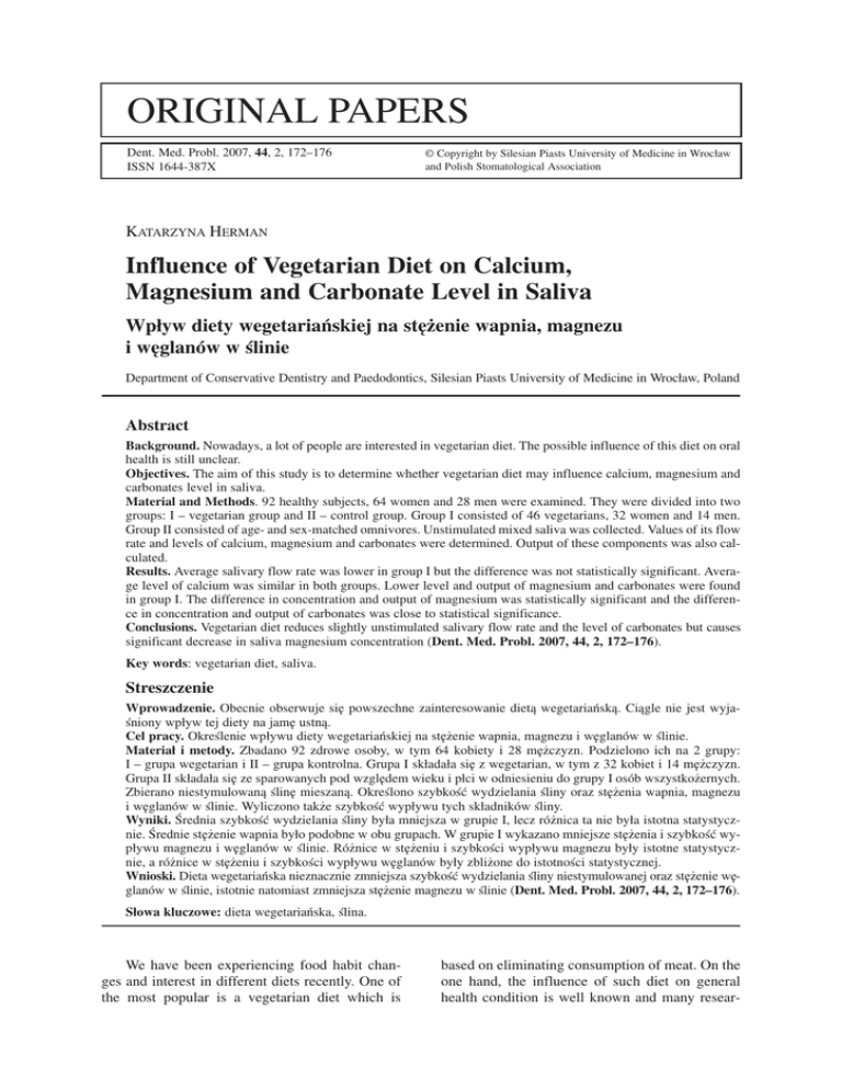 ORIGINAL PAPERS Dent. Med. Probl. 2007, 44, 2, 172–176 ISSN 1644−387X © Copyright by Silesian Piasts University of Medicine in Wrocław and Polish Stomatological Association KATARZYNA HERMAN Influence of Vegetarian Diet on Calcium, Magnesium and Carbonate Level in Saliva Wpływ diety wegetariańskiej na stężenie wapnia, magnezu i węglanów w ślinie Department of Conservative Dentistry and Paedodontics, Silesian Piasts University of Medicine in Wrocław, Poland Abstract Background. Nowadays, a lot of people are interested in vegetarian diet. The possible influence of this diet on oral health is still unclear. Objectives. The aim of this study is to determine whether vegetarian diet may influence calcium, magnesium and carbonates level in saliva. Material and Methods. 92 healthy subjects, 64 women and 28 men were examined. They were divided into two groups: I – vegetarian group and II – control group. Group I consisted of 46 vegetarians, 32 women and 14 men. Group II consisted of age− and sex−matched omnivores. Unstimulated mixed saliva was collected. Values of its flow rate and levels of calcium, magnesium and carbonates were determined. Output of these components was also cal− culated. Results. Average salivary flow rate was lower in group I but the difference was not statistically significant. Avera− ge level of calcium was similar in both groups. Lower level and output of magnesium and carbonates were found in group I. The difference in concentration and output of magnesium was statistically significant and the differen− ce in concentration and output of carbonates was close to statistical significance. Conclusions. Vegetarian diet reduces slightly unstimulated salivary flow rate and the level of carbonates but causes significant decrease in saliva magnesium concentration (Dent. Med. Probl. 2007, 44, 2, 172–176). Key words: vegetarian diet, saliva. Streszczenie Wprowadzenie. Obecnie obserwuje się powszechne zainteresowanie dietą wegetariańską. Ciągle nie jest wyja− śniony wpływ tej diety na jamę ustną. Cel pracy. Określenie wpływu diety wegetariańskiej na stężenie wapnia, magnezu i węglanów w ślinie. Materiał i metody. Zbadano 92 zdrowe osoby, w tym 64 kobiety i 28 mężczyzn. Podzielono ich na 2 grupy: I – grupa wegetarian i II – grupa kontrolna. Grupa I składała się z wegetarian, w tym z 32 kobiet i 14 mężczyzn. Grupa II składała się ze sparowanych pod względem wieku i płci w odniesieniu do grupy I osób wszystkożernych. Zbierano niestymulowaną ślinę mieszaną. Określono szybkość wydzielania śliny oraz stężenia wapnia, magnezu i węglanów w ślinie. Wyliczono także szybkość wypływu tych składników śliny. Wyniki. Średnia szybkość wydzielania śliny była mniejsza w grupie I, lecz różnica ta nie była istotna statystycz− nie. Średnie stężenie wapnia było podobne w obu grupach. W grupie I wykazano mniejsze stężenia i szybkość wy− pływu magnezu i węglanów w ślinie. Różnice w stężeniu i szybkości wypływu magnezu były istotne statystycz− nie, a różnice w stężeniu i szybkości wypływu węglanów były zbliżone do istotności statystycznej. Wnioski. Dieta wegetariańska nieznacznie zmniejsza szybkość wydzielania śliny niestymulowanej oraz stężenie wę− glanów w ślinie, istotnie natomiast zmniejsza stężenie magnezu w ślinie (Dent. Med. Probl. 2007, 44, 2, 172–176). Słowa kluczowe: dieta wegetariańska, ślina. We have been experiencing food habit chan− ges and interest in different diets recently. One of the most popular is a vegetarian diet which is based on eliminating consumption of meat. On the one hand, the influence of such diet on general health condition is well known and many resear− Influence of Vegetarian Diet on Calcium, Magnesium and Carbonate Level in Saliva ches have been carried out on this subject. On the other hand, few papers have been devoted to its possible influence on oral health. One of the most important factor in maintaining homeostasis in oral cavity is saliva. Saliva consists mainly of wa− ter but it contains a lot of organic and inorganic compounds as well. Calcium ions take a signifi− cant part in remineralization process. Calcium su− persaturated saliva is one of the factors preventing enamel demineralisation. Ionised calcium fraction is of particular significance [1]. Magnesium is al− so an important component of saliva. Its role is not clear yet. It is known to play a part as a co−factor of many enzymes taking part in metabolism of proteins, carbohydrates, fats, and nucleic acids. It is also essential for immunologic processes, in par− ticular for humoral response. It has been shown that its level in saliva is lower than in blood [2, 3]. Some researches found some unclear dependence between high concentration of magnesium in sali− va and susceptibility to caries [4–6]. Carbonates constitute the most important buffer system which controls pH of saliva. Their concentration is repor− ted to be correlated with saliva flow rate [7]. The aim of this study is to determine if vege− tarian diet can influence calcium, magnesium and carbonates level in saliva. Material and Methods 92 healthy subjects, 64 women and 28 men were examined. They were from 17 to 51 years old. They were divided into two groups: I – vegetarian group and II – control group. Group I consisted of 46 vegetarians, 32 women and 14 men. The dura− tion of vegetarian diet was between 1 and 18 years (the mean duration was 9 years). Group II consi− sted of age− and sex−matched omnivores. The mean age of subjects in both groups was 29 (Tab. 1). The individuals from group I were lactovege− tarians. Their diet consisted of fruit, vegetables and dairy products. 76% of them were lactoovo− vegetarians (their diet included eggs). Unstimulated mixed saliva (5 ml) was collec− ted at least 2 hours after the meal. The samples were centrifuged at 4000