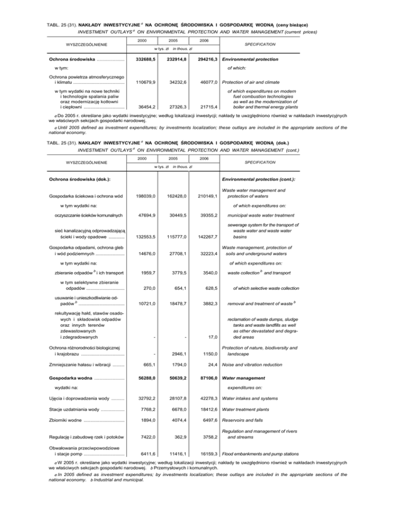 TABL. 25 (31). NAKŁADY INWESTYCYJNE a NA OCHRONĘ ŚRODOWISKA I GOSPODARKĘ WODNĄ (ceny bieżące) INVESTMENT OUTLAYS a ON ENVIRONMENTAL PROTECTION AND WATER MANAGEMENT (current prices) 2000 2005 2006 SPECIFICATION WYSZCZEGÓLNIENIE w tys. zł Ochrona środowiska ..................... 332688,5 in thous. zl 232914,8 294216,3 w tym: Environmental protection of which: Ochrona powietrza atmosferycznego i klimatu ....................................... w tym wydatki na nowe techniki i technologie spalania paliw oraz modernizację kotłowni i ciepłowni ............................... 110679,9 34232,6 36454,2 27326,3 46077,0 21715,4 Protection of air and climate of which expenditures on modern fuel combustion technologies as well as the modernization of boiler and thermal energy plants a Do 2005 r. określane jako wydatki inwestycyjne; według lokalizacji inwestycji; nakłady te uwzględniono również w nakładach inwestycyjnych we właściwych sekcjach gospodarki narodowej. a Until 2005 defined as investment expenditures; by investments localization; these outlays are included in the appropriate sections of the national economy. TABL. 25 (31). NAKŁADY INWESTYCYJNE a NA OCHRONĘ ŚRODOWISKA I GOSPODARKĘ WODNĄ (dok.) INVESTMENT OUTLAYS a ON ENVIRONMENTAL PROTECTION AND WATER MANAGEMENT (cont.) 2000 2005 2006 SPECIFICATION WYSZCZEGÓLNIENIE w tys. zł in thous. zl Ochrona środowiska (dok.): Gospodarka ściekowa i ochrona wód Environmental protection (cont.): 198039,0 162428,0 210149,1 w tym wydatki na: oczyszczanie ścieków komunalnych of which expenditures on: 47694,9 30449,5 39355,2 sieć kanalizacyjną odprowadzającą ścieki i wody opadowe ............ 132553,5 115777,0 142267,7 Gospodarka odpadami, ochrona gleb i wód podziemnych ...................... 14676,0 27708,1 32223,4 w tym wydatki na: b Waste water management and protection of waters municipal waste water treatment sewerage system for the transport of waste water and waste water basins Waste management, protection of soils and underground waters of which expenditures on: zbieranie odpadów i ich transport 1959,7 3779,5 3540,0 w tym selektywne zbieranie odpadów ............................. 270,0 654,1 628,5 usuwanie i unieszkodliwianie odpadów b ................................... 10721,0 18478,7 3882,3 waste collection b and transport of which selective waste collection removal and treatment of waste b rekultywację hałd, stawów osadowych i składowisk odpadów oraz innych terenów zdewastowanych i zdegradowanych - - 17,0 reclamation of waste dumps, sludge tanks and waste landfills as well as other devastated and degraded areas Ochrona różnorodności biologicznej i krajobrazu ................................. - 2946,1 1150,0 Protection of nature, biodiversity and landscape Zmniejszanie hałasu i wibracji ......... 665,1 1794,0 Gospodarka wodna ....................... 56288,0 50639,2 24,4 Noise and vibration reduction 87106,0 wydatki na: Water management expenditures on: Ujęcia i doprowadzenia wody .......... 32792,2 28107,8 42278,3 Water intakes and systems Stacje uzdatniania wody .................. 7768,2 6678,0 18412,6 Water treatment plants Zbiorniki wodne ............................... 1894,0 4074,4 Regulację i zabudowę rzek i potoków 7422,0 362,9 3758,2 Regulation and management of rivers and streams Obwałowania przeciwpowodziowe i stacje pomp ............................... 6411,6 11416,1 16159,3 Flood embankments and pump stations 6497,6 Reservoirs and falls a W 2005 r. określane jako wydatki inwestycyjne; według lokalizacji inwestycji; nakłady te uwzględniono również w nakładach inwestycyjnych we właściwych sekcjach gospodarki narodowej. b Przemysłowych i komunalnych. a In 2005 defined as investment expenditures; by investments localization; these outlays are included in the appropriate sections of the national economy. b Industrial and municipal.