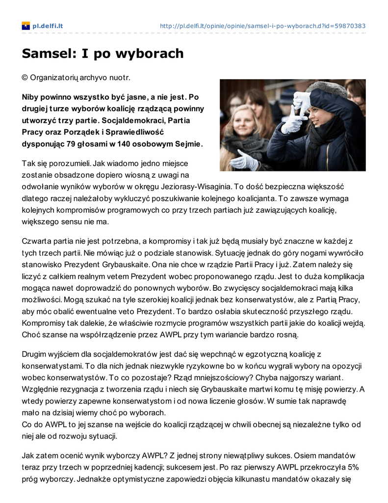 pl.delfi.lt http://pl.delfi.lt/opinie/opinie/samsel-i-po-wyborach.d?id=59870383 Samsel: I po wyborach © Organizatorių archyvo nuotr. Niby powinno wszyst ko być jasne, a nie jest . Po drugiej t urze wyborów koalicję rządzącą powinny ut worzyć t rzy part ie. Socjaldemokraci, Part ia Pracy oraz Porządek i Sprawiedliwość dysponując 79 głosami w 140 osobowym Sejmie. Tak się porozumieli. Jak wiadomo jedno miejsce zostanie obsadzone dopiero wiosną z uwagi na odwołanie wyników wyborów w okręgu Jeziorasy-Wisaginia. To dość bezpieczna większość dlatego raczej należałoby wykluczyć poszukiwanie kolejnego koalicjanta. To zawsze wymaga kolejnych kompromisów programowych co przy trzech partiach już zawiązujących koalicję, większego sensu nie ma. Czwarta partia nie jest potrzebna, a kompromisy i tak już będą musiały być znaczne w każdej z tych trzech partii. Nie mówiąc już o podziale stanowisk. Sytuację jednak do góry nogami wywróciło stanowisko Prezydent Grybauskaite. Ona nie chce w rządzie Partii Pracy i już. Zatem należy się liczyć z całkiem realnym vetem Prezydent wobec proponowanego rządu. Jest to duża komplikacja mogąca nawet doprowadzić do ponownych wyborów. Bo zwycięscy socjaldemokraci mają kilka możliwości. Mogą szukać na tyle szerokiej koalicji jednak bez konserwatystów, ale z Partią Pracy, aby móc obalić ewentualne veto Prezydent. To bardzo osłabia skuteczność przyszłego rządu. Kompromisy tak dalekie, że właściwie rozmycie programów wszystkich partii jakie do koalicji wejdą. Choć szanse na współrządzenie przez AWPL przy tym wariancie bardzo rosną. Drugim wyjściem dla socjaldemokratów jest dać się wepchnąć w egzotyczną koalicję z konserwatystami. To dla nich jednak niezwykle ryzykowne bo w końcu wygrali wybory na opozycji wobec konserwatystów. To co pozostaje? Rząd mniejszościowy? Chyba najgorszy wariant. Względnie rezygnacja z tworzenia rządu i niech się Grybauskaite martwi komu tę misję powierzy. A wtedy powierzy zapewne konserwatystom i od nowa liczenie głosów. W sumie tak naprawdę mało na dzisiaj wiemy choć po wyborach. Co do AWPL to jej szanse na wejście do koalicji rządzącej w chwili obecnej są niezależne tylko od niej ale od rozwoju sytuacji. Jak zatem ocenić wynik wyborczy AWPL? Z jednej strony niewątpliwy sukces. Osiem mandatów teraz przy trzech w poprzedniej kadencji; sukcesem jest. Po raz pierwszy AWPL przekroczyła 5% próg wyborczy. Jednakże optymistyczne zapowiedzi objęcia kilkunastu mandatów okazały się nierealne. Wejście do koalicji rządzącej i objęcie kilku ministerstw, jak na razie okazują się bardzo mgliste. Co w przypadku niepowodzenia wejścia do koalicji, może stanowić problem za cztery lata. Bo partia będąca w opozycji ma dość nikłe szanse na realizację swoich programowych zapowiedzi. W tych wyborach potencjalny elektorat AWPL bardzo się zmobilizował. Ma zatem prawo oczekiwać jakiś z tego zysków. Gdy ich nie będzie za cztery lata już o mobilizację będzie trudniej. Szczególnie, że raczej trudno będzie liczyć na „pomoc” ze strony wygranej partii jaką dawali konserwatyści swoją polityką wobec mniejszości narodowych. Polityka ta prawie na pewno (przy tworzeniu rządu wokół socjaldemokratów!) ulegnie złagodzeniu. Oczywiście do idealnej sytuacji w tej kwestii droga ciągle jest daleka, ale raczej nie będą otwierane nowe pola konfliktów tak jak to robił poprzedni rząd. Odrębnej analizy wymaga to kto faktycznie na AWPL głosował. Co pozwoli odpowiedzieć na pytanie czy przedwyborcze manewry tej partii przyniosły odpowiedni skutek. Wydawałoby się że odpowiedź jest oczywista – Tak, przyniosły skutek. Moim zdaniem nie jest to jednak tak oczywiste w każdym wymiarze. Zmiana retoryki poprzez jej złagodzenie, mogły pomóc. Przesunięcie akcentów na sprawy ogólnokrajowe i gospodarcze jako pierwsze kosztem znajdujących się na drugim planie spraw mniejszości narodowych już jest bardziej dyskusyjne. Biorąc pod uwagę to, że wygląda na to iż na listę AWPL głosowali głównie Polacy i Rosjanie. Niepowodzeniem zakończyło się pozyskanie większej liczby wyborców litewskich w skali kraju. Wskazują na to właśnie wyniki drugiej tury wyborów. AWPL ciągle nie jest do zaakceptowania przez nawet względnie liberalnego wyborcę litewskiego. Choć lokalne zwycięstwo Tamašunienė która na opozycji wobec Partii Pracy uzyskała jednak w drodze wyjątku, trochę głosów litewskich może jakoś rokować na przyszłość. Mimo tej lokalnej wygranej o znaczącym sukcesie w tym pozyskiwaniu Litwinów trudno mówić. Jest to skutkiem wielu lat zupełnie innego pozycjonowania się tej partii wobec społeczności litewskiej. Trudno jest to odmienić w ciągu kilku miesięcy. Szczególnie kiedy firmują to te same twarze. Na zmianę liderów (bo to nie tylko kwestia samego Tomaszewskiego) się nie zanosi. Bo niby jak? W końcu posłowie są wybrani tacy jacy są. Czy partia będzie dalej kontynuować ten kurs, jest pytaniem na które trudno obecnie o jednoznaczną odpowiedź. Ryzyko jest duże, koszty i konieczne działania też niemałe a efekt wcale nie pewny. Pewnym natomiast wydaje się kontynuowanie sojusz z Aliansem Rosjan. Aby to ugruntować konieczne jest zapewnienie miejsca w Sejmie Irinie Rozowej - jego liderce. Ktoś z już wybranych będzie musiał jej miejsca ustąpić. Moim zdaniem tą osobą będzie Jedziński. Waldemar Tomaszewski pozostanie w europarlamencie czyli Jedziński wejdzie do Sejmu. Jednakże zrezygnuje na rzecz Rozowej właśnie. Stanie się tak z kilku względów. Zbigniew Jedziński jest wce przewodniczącym AWPL. Choć wydawałoby się logiczne aby znalazł się w Sejmie to właśnie może świadczyć na jego niekorzyść. Niekoniecznie liderowi musi zależeć na umacnianiu pozycji swego zastępcy. Każdy lider partii stara się mieć takiego zastępcę aby nie był on następcą. Zres