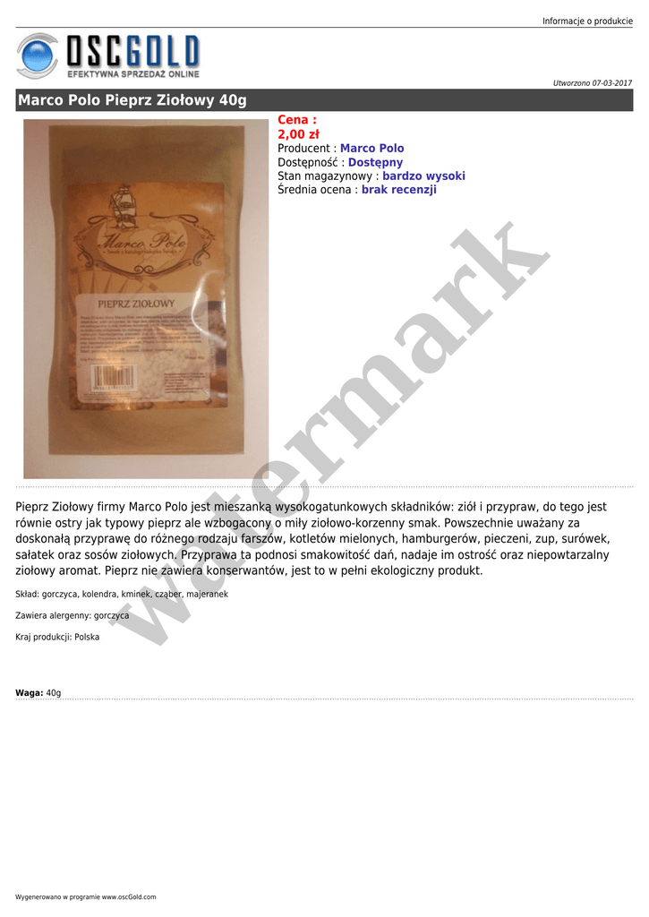 Informacje o produkcie Utworzono 07-03-2017 Marco Polo Pieprz Ziołowy 40g Cena : 2,00 zł er m ar k Producent : Marco Polo Dostępność : Dostępny Stan magazynowy : bardzo wysoki Średnia ocena : brak recenzji at Pieprz Ziołowy firmy Marco Polo jest mieszanką wysokogatunkowych składników: ziół i przypraw, do tego jest równie ostry jak typowy pieprz ale wzbogacony o miły ziołowo-korzenny smak. Powszechnie uważany za doskonałą przyprawę do różnego rodzaju farszów, kotletów mielonych, hamburgerów, pieczeni, zup, surówek, sałatek oraz sosów ziołowych. Przyprawa ta podnosi smakowitość dań, nadaje im ostrość oraz niepowtarzalny ziołowy aromat. Pieprz nie zawiera konserwantów, jest to w pełni ekologiczny produkt. w Skład: gorczyca, kolendra, kminek, cząber, majeranek Zawiera alergenny: gorczyca Kraj produkcji: Polska Waga: 40g Wygenerowano w programie www.oscGold.com
