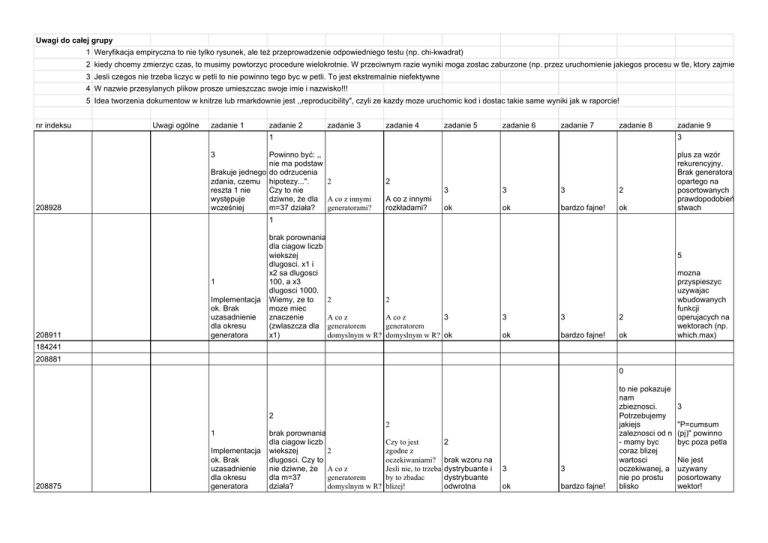 Uwagi do całej grupy 1 Weryfikacja empiryczna to nie tylko rysunek, ale też przeprowadzenie odpowiedniego testu (np. chi-kwadrat) 2 kiedy chcemy zmierzyc czas, to musimy powtorzyc procedure wielokrotnie. W przeciwnym razie wyniki moga zostac zaburzone (np. przez uruchomienie jakiegos procesu w tle, ktory zajmie duza cze 3 Jesli czegos nie trzeba liczyc w petli to nie powinno tego byc w petli. To jest ekstremalnie niefektywne 4 W nazwie przesylanych plikow prosze umieszczac swoje imie i nazwisko!!! 5 Idea tworzenia dokumentow w knitrze lub rmarkdownie jest ,,reproducibility", czyli ze kazdy moze uruchomic kod i dostac takie same wyniki jak w raporcie! nr indeksu Uwagi ogólne zadanie 1 zadanie 2 zadanie 3 zadanie 4 zadanie 5 zadanie 6 zadanie 7 zadanie 8 1 3 3 208928 Powinno być: ,, nie ma podstaw Brakuje jednego do odrzucenia 2 zdania, czemu hipotezy...". reszta 1 nie Czy to nie występuje dziwne, że dla A co z innymi generatorami? wcześniej m=37 działa? zadanie 9 2 A co z innymi rozkładami? 3 3 3 2 ok ok bardzo fajne! ok plus za wzór rekurencyjny. Brak generatora opartego na posortowanych prawdopodobień stwach 1 1 208911 Implementacja ok. Brak uzasadnienie dla okresu generatora brak porownania dla ciagow liczb wiekszej dlugosci. x1 i x2 sa dlugosci 100, a x3 dlugosci 1000. 2 Wiemy, ze to moze miec A co z znaczenie (zwlaszcza dla generatorem domyslnym w R? x1) 5 2 A co z 3 generatorem domyslnym w R? ok 3 3 2 ok bardzo fajne! ok mozna przyspieszyc uzywajac wbudowanych funkcji operujacych na wektorach (np. which.max) 184241 208881 0 2 2 1 208875 Implementacja ok. Brak uzasadnienie dla okresu generatora brak porownania dla ciagow liczb 2 wiekszej dlugosci. Czy to nie dziwne, że A co z generatorem dla m=37 domyslnym w R? działa? Czy to jest zgodne z oczekiwaniami? Jesli nie, to trzeba by to zbadac blizej! 2 brak wzoru na dystrybuante i dystrybuante odwrotna 3 3 ok bardzo fajne! to nie pokazuje nam zbieznosci. Potrzebujemy jakiejs zaleznosci od n - mamy byc coraz blizej wartosci oczekiwanej, a nie po prostu blisko 3 "P=cumsum (pj)" powinno byc poza petla Nie jest uzywany posortowany wektor! 1 2 1 2 208879 3 3 2 ok ok ok brak wzoru na dystrybuante i czy to zgodne z dystrybuante oczekiwaniami? odwrotna bardzo nieczytelny rysunek, brak opisu co sie dzieje 3 3 ok bardzo fajne! 3 3 ok bardzo fajne! ok, mozna by dodac wykres calkowity brak opisu tego co sie dzieje + nieczytelny kod 1 2 185990 kara za spoznienie 20% Implementacja ok. Brak uzasadnienie dla okresu generatora 3 brak porownania 2 z domyslnym generatorem ok 3 b. dobrze brak wzoru na dystrybuante i dystrybuante odwrotna 2 2 2 1 3 3 3 1 brak kodu! ok, brak kodu brak kodu! ok ok bardzo fajne! brak kodu! 0 1 186030 Brak kodu. Brak uzasadnienie dla okresu generatora 0 185881 3 2 204602 3 3 2 ok b. dobrze ok za duzo podzialow! Mowilismy o ,, regule kciuka", wedlug ktorej do kazdego powinno wpadac 3 przynjamniej 5 liczb! ok 3 3 2 ok ok ok "f <- choose(n, 0:n)*p^(0:n)*(1p)^(n - 0:n) f_sort <- sort(f, decreasing = TRUE, index. return = TRUE) # sortowanie i zachowanie in f_sort_cumsum <- cumsum (f_sort$x)" powinno byc poza petla!!!! 2 1 1 Brak pliku źródlowego Rmd lub Rnw. Ewentulanie skyptów w R 204582 Implementacja ok. Brak uzasadnienie dla okresu generatora Czy to jest zgodne z oczekiwaniami? Dlaczego działa 2 generator z m=37? Trzeby A co z innymi by to sprawdzić generatorami? 3 3 3 3 super! ok ok ok Nie widać różnicy tylko dlatego, że kod jest napisany bardzo 2 nieoptymalnie. Pętle w R są Taki kod bardzo wolne. wymaga Do tego n jest komentarza, małe, przez co czemu nie widać dodajemy po 10 przewagi liczb losowych? posortowania 1 co to jest: "x <0*c(n)"? 4 nie ma powodu zamykac MPWL w funkcji, jaka jest z tego korzysc? 1 Implementacja niepotrzebna zmienna l=i+1. x nie ma elementu 3 pierwszego n to nie jest Brak liczba uzasdanienia pomiarów, tylko 2 dla okresu liczba generatora podziałów! ok 204552 można dac zamiast "binom_distrib (p,1)" "binom_distrib (p,n)" i zaoszczedzic na zbedne petli 3 3 3 ok ok ok ok, ale: "w <- 0*c(n)" rysunek kiepsko pokazuje zbieznosc, glownie dlatego, ze dla kazdego m mamy inne liczby losowe. stad kazda srednia jest niezalezna od poprzedniej 3 3 2 ok ok ok 0 3 3 2 5 2 powinno uzyc sie which.max takze w przypadku posortowanych p-stw 2 kara za spoznienie 20% 204547 221116 Maksymilian Debeściak 3 3 2 ok ok ok ok, ale brak dokladnego opisu (kodu) 3 tego co zostalo wykonane ok 3 3 2 3 3 Uwagi do całej grupy 1 Weryfikacja empiryczna to nie tylko rysunek, ale też przeprowadzenie odpowiedniego testu (np. chi-kwadrat) 2 kiedy chcemy zmierzyc czas, to musimy powtorzyc procedure wielokrotnie. W przeciwnym razie wyniki moga zostac zaburzone (np. przez uruchomienie jakiegos procesu w tle, ktory zajmie duza cze 3 Jesli czegos nie trzeba liczyc w petli to nie powinno tego byc w petli. To jest ekstremalnie niefektywne 4 W nazwie przesylanych plikow prosze umieszczac swoje imie i nazwisko!!! 5 Idea tworzenia dokumentow w knitrze lub rmarkdownie jest ,,reproducibility", czyli ze kazdy moze uruchomic kod i dostac takie same wyniki jak w raporcie!