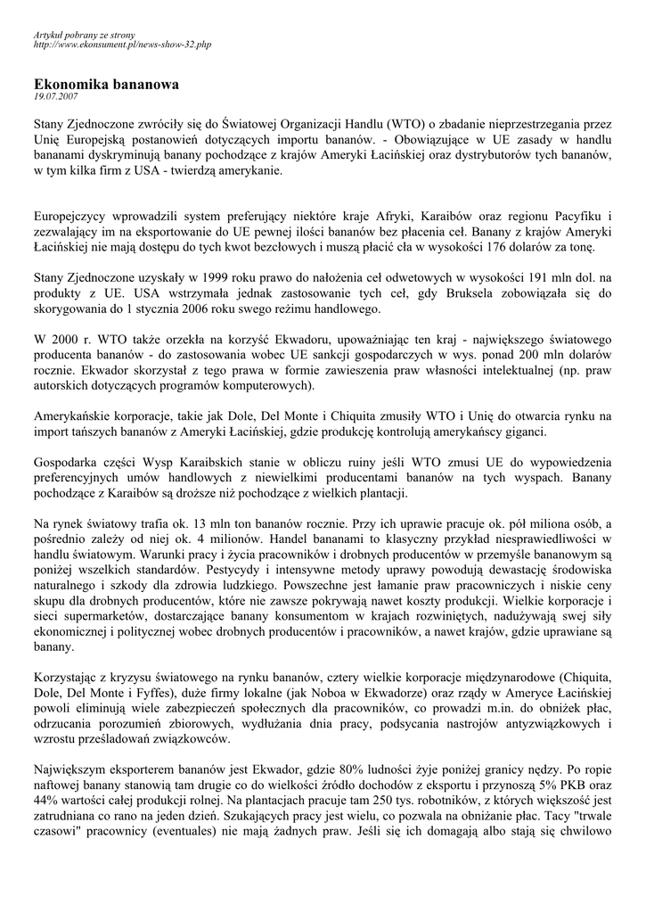Artykuł pobrany ze strony http://www.ekonsument.pl/news-show-32.php Ekonomika bananowa 19.07.2007 Stany Zjednoczone zwróciły się do Światowej Organizacji Handlu (WTO) o zbadanie nieprzestrzegania przez Unię Europejską postanowień dotyczących importu bananów. - Obowiązujące w UE zasady w handlu bananami dyskryminują banany pochodzące z krajów Ameryki Łacińskiej oraz dystrybutorów tych bananów, w tym kilka firm z USA - twierdzą amerykanie. Europejczycy wprowadzili system preferujący niektóre kraje Afryki, Karaibów oraz regionu Pacyfiku i zezwalający im na eksportowanie do UE pewnej ilości bananów bez płacenia ceł. Banany z krajów Ameryki Łacińskiej nie mają dostępu do tych kwot bezcłowych i muszą płacić cła w wysokości 176 dolarów za tonę. Stany Zjednoczone uzyskały w 1999 roku prawo do nałożenia ceł odwetowych w wysokości 191 mln dol. na produkty z UE. USA wstrzymała jednak zastosowanie tych ceł, gdy Bruksela zobowiązała się do skorygowania do 1 stycznia 2006 roku swego reżimu handlowego. W 2000 r. WTO także orzekła na korzyść Ekwadoru, upoważniając ten kraj - największego światowego producenta bananów - do zastosowania wobec UE sankcji gospodarczych w wys. ponad 200 mln dolarów rocznie. Ekwador skorzystał z tego prawa w formie zawieszenia praw własności intelektualnej (np. praw autorskich dotyczących programów komputerowych). Amerykańskie korporacje, takie jak Dole, Del Monte i Chiquita zmusiły WTO i Unię do otwarcia rynku na import tańszych bananów z Ameryki Łacińskiej, gdzie produkcję kontrolują amerykańscy giganci. Gospodarka części Wysp Karaibskich stanie w obliczu ruiny jeśli WTO zmusi UE do wypowiedzenia preferencyjnych umów handlowych z niewielkimi producentami bananów na tych wyspach. Banany pochodzące z Karaibów są droższe niż pochodzące z wielkich plantacji. Na rynek światowy trafia ok. 13 mln ton bananów rocznie. Przy ich uprawie pracuje ok. pół miliona osób, a pośrednio zależy od niej ok. 4 milionów. Handel bananami to klasyczny przykład niesprawiedliwości w handlu światowym. Warunki pracy i życia pracowników i drobnych producentów w przemyśle bananowym są poniżej wszelkich standardów. Pestycydy i intensywne metody uprawy powodują dewastację środowiska naturalnego i szkody dla zdrowia ludzkiego. Powszechne jest łamanie praw pracowniczych i niskie ceny skupu dla drobnych producentów, które nie zawsze pokrywają nawet koszty produkcji. Wielkie korporacje i sieci supermarketów, dostarczające banany konsumentom w krajach rozwiniętych, nadużywają swej siły ekonomicznej i politycznej wobec drobnych producentów i pracowników, a nawet krajów, gdzie uprawiane są banany. Korzystając z kryzysu światowego na rynku bananów, cztery wielkie korporacje międzynarodowe (Chiquita, Dole, Del Monte i Fyffes), duże firmy lokalne (jak Noboa w Ekwadorze) oraz rządy w Ameryce Łacińskiej powoli eliminują wiele zabezpieczeń społecznych dla pracowników, co prowadzi m.in. do obniżek płac, odrzucania porozumień zbiorowych, wydłużania dnia pracy, podsycania nastrojów antyzwiązkowych i wzrostu prześladowań związkowców. Największym eksporterem bananów jest Ekwador, gdzie 80% ludności żyje poniżej granicy nędzy. Po ropie naftowej banany stanowią tam drugie co do wielkości źródło dochodów z eksportu i przynoszą 5% PKB oraz 44% wartości całej produkcji rolnej. Na plantacjach pracuje tam 250 tys. robotników, z których większość jest zatrudniana co rano na jeden dzień. Szukających pracy jest wielu, co pozwala na obniżanie płac. Tacy "trwale czasowi" pracownicy (eventuales) nie mają żadnych praw. Jeśli się ich domagają albo stają się chwilowo zbędni, łatwo się ich pozbyć. W Ameryce Łacińskiej mniej zarabiają tylko robotnicy w Nikaragui. Na plantacjach wielkich korporacji pracuje się po 12 godzin dziennie w fatalnych warunkach. Według raportu Human Right Watch, w Ekwadorze pracuje również wiele dzieci. Większość z nich zaczyna pracę w wieku 10-11 lat (choć zatrudnia się i młodsze), gdyż ich rodzice - często też pracownicy plantacji - nie są w stanie zapewnić im nawet wyżywienia. Dzieci używają ostrych, niebezpiecznych narzędzi, noszą duże ciężary, bywają też wykorzystywane seksualnie. Pracują nawet w czasie opryskiwania plantacji, zwykle bez żadnych zabezpieczeń. Aby móc zarabiać, wiele z nich musi zrezygnować ze szkoły. Dostają zaledwie 60% ustawowej płacy minimalnej. Robotnicy na plantacjach i drobni producenci dostają tylko 1,5-2% ceny, jaką płacimy za banany w sklepach. Działalność związków zawodowych spotyka się z dużym oporem pracodawców, zwłaszcza w Kostaryce i Hondurasie. Dochodzi do brutalnych aktów przemocy wobec działaczy związkowych i protestujących robotników. Banany są bardzo podatne na choroby i szkodniki, stąd producenci stosują wielkie ilości pestycydów, m.in. DBCP (Nemagon), którego użycia zakazano w USA już w r. 1979. W krajach bogatych zużywa się średnio 2,7 kg pestycydów na hektar rocznie; na plantacjach bananów w Kostaryce - aż 44 kg. Opryskuje się je nawet 50 razy w roku, co kosztuje dwukrotnie więcej niż płace. Robotnicy, pracujący zwykle bez odzieży ochronnej, narażeni są na działanie pestycydów, co powoduje ostre zatrucia, choroby, a nawet śmierć. 40 proc. bananów na stołach Unii Europejskiej to dziś banany kostarykańskie. W 1995 roku Unia zmusiła Kostarykę do skierowania 8 milionów skrzynek bananów na inne rynki światowe, co spowodowało światowy spadek cen na te owoce. W Kostaryce pracownicy plantacji zarabiali miesięcznie w 1993 250 USD, w 1997 187 USD, w 2001 tylko 160 USD. W listopadzie 2000 roku Kostaryka, ogłosiła, że reguły importu proponowane przez UE zaszkodzą systemowi społecznemu tego kraju. Przebywający w Brukseli prezydent Miguel Angel Rodriguez zwrócił uwagę, że owoce z Kostaryki są droższe niż