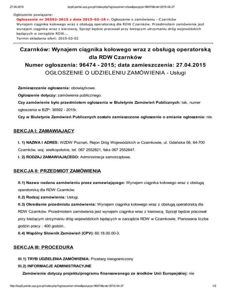 27.04.2015 bzp0.portal.uzp.gov.pl/index.php?ogloszenie=show&pozycja=96474&rok=2015-04-27 Ogłoszenie powiązane: Ogłoszenie nr 36592-2015 z dnia 2015-02-18 r. Ogłoszenie o zamówieniu - C zarnków Wynajem ciągnika kołowego wraz z obsługą operatorską dla RDW C zarnków. Przedmiotem zamówienia jest wynajem ciągnika wraz z kierowcą. Sprzęt będzie pracował przy bieżącym utrzymaniu dróg wojewódzkich będących w zarządzie RDW... Termin składania ofert: 2015-03-02 Czarnków: Wynajem ciągnika kołowego wraz z obsługą operatorską dla RDW Czarnków Numer ogłoszenia: 96474 - 2015; data zamieszczenia: 27.04.2015 OGŁOSZENIE O UDZIELENIU ZAMÓWIENIA - Usługi Zamieszczanie ogłoszenia: obowiązkowe. Ogłoszenie dotyczy: zamówienia publicznego. Czy zamówienie było przedmiotem ogłoszenia w Biuletynie Zamówień Publicznych: tak, numer ogłoszenia w BZP: 36592 - 2015r. Czy w Biuletynie Zamówień Publicznych zostało zamieszczone ogłoszenie o zmianie ogłoszenia: nie. SEKCJA I: ZAMAWIAJĄCY I. 1) NAZWA I ADRES: WZDW Poznań, Rejon Dróg Wojewódzkich w Czarnkowie, ul. Gdańska 56, 64-700 Czarnków, woj. wielkopolskie, tel. 067 2552821, faks 067 2552647. I. 2) RODZAJ ZAMAWIAJĄCEGO: Administracja samorządowa. SEKCJA II: PRZEDMIOT ZAMÓWIENIA II.1) Nazwa nadana zamówieniu przez zamawiającego: Wynajem ciągnika kołowego wraz z obsługą operatorską dla RDW Czarnków. II.2) Rodzaj zamówienia: Usługi. II.3) Określenie przedmiotu zamówienia: Wynajem ciągnika kołowego wraz z obsługą operatorską dla RDW Czarnków. Przedmiotem zamówienia jest wynajem ciągnika wraz z kierowcą. Sprzęt będzie pracował przy bieżącym utrzymaniu dróg wojewódzkich będących w zarządzie RDW w Czarnkowie. Planowana liczba godzin pracy : 400 godzin.. II.4) Wspólny Słownik Zamówień (CPV): 60.18.00.00-3. SEKCJA III: PROCEDURA III.1) TRYB UDZIELENIA ZAMÓWIENIA: Przetarg nieograniczony III.2) INFORMACJE ADMINISTRACYJNE Zamówienie dotyczy projektu/programu finansowanego ze środków Unii Europejskiej: nie http://bzp0.portal.uzp.gov.pl/index.php?ogloszenie=show&pozycja=96474&rok=2015-04-27 1/2 27.04.2015 bzp0.portal.uzp.gov.pl/index.php?ogloszenie=show&pozycja=96474&rok=2015-04-27 SEKCJA IV: UDZIELENIE ZAMÓWIENIA IV.1) DATA UDZIELENIA ZAMÓWIENIA: 02.04.2015. IV.2) LICZBA OTRZYMANYCH OFERT: 1. IV.3) LICZBA ODRZUCONYCH OFERT: . IV.4) NAZWA I ADRES WYKONAWCY, KTÓREMU UDZIELONO ZAMÓWIENIA: Zakład Transportowy Janusz Kubiś, Lubcz Mały 1 , 64-761 Krzyż, 64-762 Lubcz Mały, kraj/woj. wielkopolskie. IV.5) Szacunkowa wartość zamówienia (bez VAT): 24000,00 PLN. IV.6) INFORMACJA O CENIE WYBRANEJ OFERTY ORAZ O OFERTACH Z NAJNIŻSZĄ I NAJWYŻSZĄ CENĄ Cena wybranej oferty: 56,00 Oferta z najniższą ceną: 56,00 / Oferta z najwyższą ceną: 56,00 Waluta: PLN. http://bzp0.portal.uzp.gov.pl/index.php?ogloszenie=show&pozycja=96474&rok=2015-04-27 2/2
