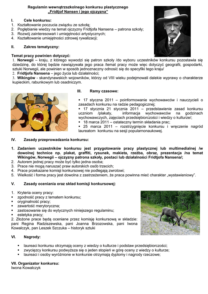 Regulamin wewnątrzszkolnego konkursu plastycznego „Fridtjof Nansen i jego ojczyzna” I. 1. 2. 3. 4. Cele konkursu: Kształtowanie poczucia związku ze szkołą; Pogłębianie wiedzy na temat ojczyzny Fridtjofa Nansena – patrona szkoły; Rozwój zainteresowań i umiejętności artystycznych; Kształtowanie umiejętności zdrowej rywalizacji; II. Zakres tematyczny: Temat pracy powinien dotyczyć: 1. Norwegii – kraju, z którego wywodzi się patron szkoły /do wyboru uczestników konkursu pozostawia się dziedzinę, do której będzie nawiązywała jego praca /temat pracy może więc dotyczyć geografii, gospodarki, sztuki Norwegii, ale powinien w sposób jednoznaczny odnosić się do specyfiki tego kraju/ 2. Fridtjofa Nansena – jego życia lub działalności; 3. Wikingów - skandynawskich wojowników, którzy od VIII wieku podejmowali dalekie wyprawy o charakterze kupieckim, rabunkowym lub osadniczym. III. Ramy czasowe: 17 styczna 2011 – poinformowanie wychowawców i nauczycieli o zasadach konkursu na radzie pedagogicznej; 17 stycznia 21 stycznia 2011 – przedstawienie zasad konkursu uczniom /plakaty, informacja wychowawców na godzinach wychowawczych, zajęciach przedsiębiorczości i wiedzy o kulturze/; 18 marca 2011 – ostateczny termin składania prac; 25 marca 2011 – rozstrzygnięcie konkursu i wręczenie nagród laureatom konkursu na sesji popularnonaukowej. IV. Zasady przeprowadzania konkursu: 1. Zadaniem uczestników konkursu jest przygotowanie pracy plastycznej lub multimedialnej /w dowolnej technice np. plakat, graffiti, rysunek, makieta, rzeźba, obraz, prezentacja /na temat Wikingów, Norwegii – ojczyzny patrona szkoły, postaci lub działalności Fridtjofa Nansena/; 2. Autorem jednej pracy może być tylko jedna osoba; 3. Prace nie mogą naruszać praw autorskich osób trzecich; 4. Prace przekazane komisji konkursowej nie podlegają zwrotowi; 5. Wielkość i forma pracy jest dowolna z zastrzeżeniem, że praca powinna mieć charakter „wystawieniowy”. Zasady oceniania oraz skład komisji konkursowej: V. 1. Kryteria oceny pracy: zgodność pracy z tematem konkursu; oryginalność pracy; zawartość merytoryczna; zastosowanie się do wytycznych niniejszego regulaminu; estetyka pracy; 2. Złożone prace będą oceniane przez komisję konkursową w składzie: pani Regina Radziszewska, pani Joanna Brzozowska, pani Iwona Kowalczyk, pan Leszek Szczuka – historyk sztuki VI. Nagrody: laureaci konkursu otrzymają oceny z wiedzy o kulturze i podstaw przedsiębiorczości; zwycięzcy konkursu podwyższa się o jeden stopień w górę oceny z wiedzy o kulturze; laureaci i osoby wyróżnione w konkursie otrzymają dyplomy i nagrody rzeczowe; VII. Organizator konkursu: Iwona Kowalczyk