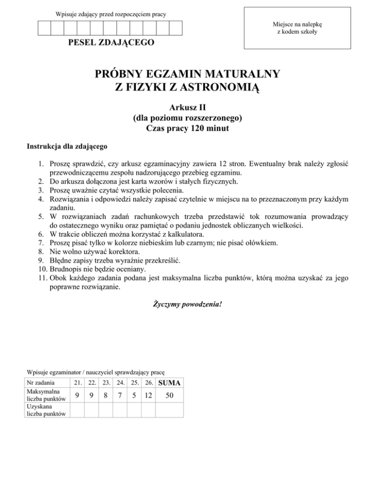 PRÓBNY EGZAMIN MATURALNY Z FIZYKI Z ASTRONOMIĄ