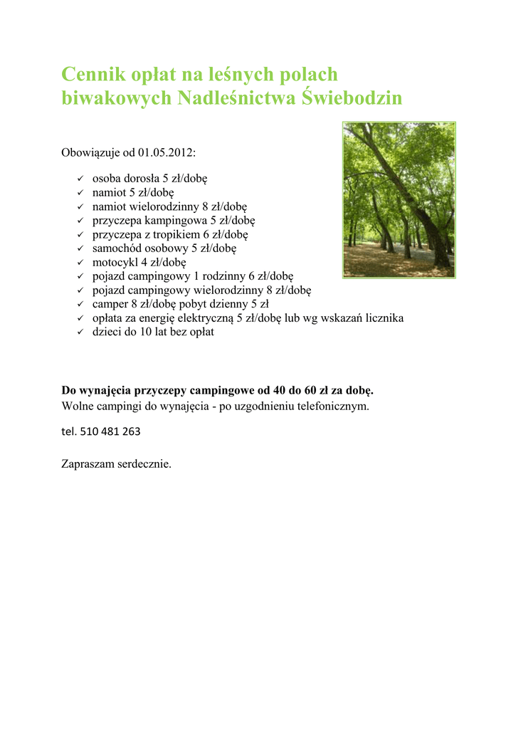 Cennik opłat na leśnych polach biwakowych Nadleśnictwa Świebodzin Obowiązuje od 01.05.2012: osoba dorosła 5 zł/dobę namiot 5 zł/dobę namiot wielorodzinny 8 zł/dobę przyczepa kampingowa 5 zł/dobę przyczepa z tropikiem 6 zł/dobę samochód osobowy 5 zł/dobę motocykl 4 zł/dobę pojazd campingowy 1 rodzinny 6 zł/dobę pojazd campingowy wielorodzinny 8 zł/dobę camper 8 zł/dobę pobyt dzienny 5 zł opłata za energię elektryczną 5 zł/dobę lub wg wskazań licznika dzieci do 10 lat bez opłat Do wynajęcia przyczepy campingowe od 40 do 60 zł za dobę. Wolne campingi do wynajęcia - po uzgodnieniu telefonicznym. tel. 510 481 263 Zapraszam serdecznie.