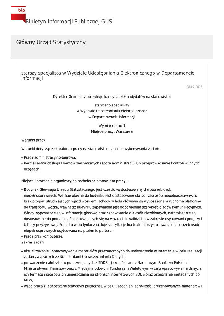 Biuletyn Informacji Publicznej GUS Główny Urząd Statystyczny starszy specjalista w Wydziale Udostępniania Elektronicznego w Departamencie Informacji 08.07.2016 Dyrektor Generalny poszukuje kandydatek/kandydatów na stanowisko: starszego specjalisty w Wydziale Udostępniania Elektronicznego w Departamencie Informacji Wymiar etatu: 1 Miejsce pracy: Warszawa Warunki pracy Warunki dotyczące charakteru pracy na stanowisku i sposobu wykonywania zadań: ● Praca administracyjno-biurowa. ● Permanentna obsługa klientów zewnętrznych (spoza administracji) lub przeprowadzanie kontroli w innych urzędach. Miejsce i otoczenie organizacyjno-techniczne stanowiska pracy: ● Budynek Głównego Urzędu Statystycznego jest częściowo dostosowany dla potrzeb osób niepełnosprawnych. Wejście główne do budynku jest dostosowane dla potrzeb osób niepełnosprawnych, brak progów utrudniających wjazd wózkiem, schody w holu głównym są wyposażone w ruchome platformy do transportu wózka, wewnątrz budynku zapewniona jest odpowiednia szerokość ciągów komunikacyjnych. Windy wyposażone są w informację głosową oraz oznakowanie dla osób niewidomych, natomiast nie są dostosowane do potrzeb osób poruszających się na wózkach inwalidzkich w zakresie usytuowania poręczy i tablicy przyzywowej. Ponadto w budynku znajduje się tylko jedna toaleta przystosowana dla potrzeb osób niepełnosprawnych usytuowana na poziomie parteru. ● Praca przy komputerze. Zakres zadań: ● aktualizowanie i opracowywanie materiałów przeznaczonych do umieszczenia w Internecie w celu realizacji zadań związanych ze Standardami Upowszechniania Danych, ● prowadzenie całokształtu prac związanych z SDDS, tj.: współpraca z Narodowym Bankiem Polskim i Ministerstwem Finansów oraz z Międzynarodowym Funduszem Walutowym w celu opracowywania danych, ich formatu i sposobu ich umieszczania na stronach internetowych SDDS oraz przesyłanie metadanych do MFW, ● współpraca z jednostkami statystyki publicznej, w celu uzgodnień jednolitości prezentowanych materiałów i aktualizacji, ● współpraca z departamentami GUS, w celu aktualizacji SDDS, ● prowadzenie całokształtu prac związanych ze sprzętem informatycznym na rzecz Departamentu. Wymagania niezbędne: ● Wykształcenie: wyższe, ● doświadczenie zawodowe: 1 rok ● znajomość języka angielskiego na poziomie komunikatywnym, ● znajomość ustawy o statystyce publicznej, ● znajomość ustawy o służbie cywilnej, ● umiejętność obsługi komputera (MS OFFICE), ● specjalistyczna wiedza informatyczna z zakresu budowy portali i tworzenia stron WWW, ● wykorzystywanie wiedzy i doskonalenie zawodowe, ● rzetelność, ● organizacja pracy i orientacja na osiąganie celów, ● komunikacja interpersonalna, komunikacja pisemna, ● współpraca, ● orientacja na klienta/interesanta, ● radzenie sobie w sytuacjach kryzysowych, ● kreatywność, ● posiadanie obywatelstwa polskiego, ● korzystanie z pełni praw publicznych, ● nieskazanie prawomocnym wyrokiem za umyślne przestępstwo lub umyślne przestępstwo skarbowe. Wymagania dodatkowe: ● wykształcenie wyższe informatyczne lub ekonomiczne, ● doświadczenie w tworzeniu stron WWW, ● szkolenia informatyczne w zakresie budowy portali. Dokumenty i oświadczenia niezbędne: ● życiorys/CV i list motywacyjny, ● kopie dokumentów potwierdzających spełnianie wymagania niezbędnego w zakresie wykształcenia, ● kopie dokumentów potwierdzających spełnianie wymagania niezbędnego w zakresie doświadczenia zawodowego/stażu pracy, ● kopie dokumentu potwierdzającego znajomość języka angielskiego na wymaganym poziomie lub oświadczenie o znajomości języka angielskiego na wymaganym poziomie, ● kopia dokumentu potwierdzającego posiadanie polskiego obywatelstwa lub oświadczenie o posiadaniu obywatelstwa polskiego, ● oświadczenie kandydata o korzystaniu z pełni praw publicznych, ● oświadczenie kandydata o nieskazaniu prawomocnym wyrokiem za umyślne przestępstwo lub umyślne przestępstwo skarbowe, ● oświadczenie kandydata o wyrażeniu zgody na przetwarzanie danych osobowych do celów naboru. Dokumenty i oświadczenia dodatkowe: ● kopia dokumentu potwierdzającego niepełnosprawność - w przypadku kandydatek/kandydatów, zamierzających skorzystać z pierwszeństwa w zatrudnieniu w przypadku, gdy znajdą się w gronie najlepszych kandydatek/kandydatów, ● kopie dokumentów potwierdzających spełnienie wymagania dodatkowego w zakresie wykształcenia informatycznego lub ekonomicznego, ● kopie dokumentów potwierdzających spełnianie wymagania dodatkowego w zakresie doświadczenia w tworzeniu stron WWW, ● kopie dokumentów potwierdzających spełnienie wymagania dodatkowego w zakresie szkoleń informatycznych w zakresie budowy portali. Dokumenty należy składać lub przesyłać do: 21-07-2016 r. Decyduje data: wpływu oferty do urzędu Miejsce składania dokumentów: Główny Urząd Statystyczny Biuro Organizacji i Kadr pok. 234 lub 251 Al. Niepodległości 208 00-925 Warszawa (w godz. 815-1615) koniecznie z dopiskiem: oferta nr 65/DI/2016 Inne informacje: W miesiącu poprzedzającym datę upublicznienia ogłoszenia wskaźnik zatrudnienia osób niepełnosprawnych w urzędzie, w rozumieniu przepisów o rehabilitacji zawodowej i społecznej oraz zatrudnianiu osób niepełnosprawnych, nie wynosi co najmniej 6%. Proponowane wynagrodzenie brutto ok. 2 998 zł + dodatek stażowy. Po upływie terminu składania dokumentów w Biuletynie Informacji Publicznej GUS zostanie upowszechniona lista kandydatek/kandydatów spełniających wymagania formalne określone w ogłoszeniu o naborze. Kandydatki/kandydaci spełniający wymagania formalne o kolejnych etapach naboru zostaną poinformowani telefonicznie lub e-mailem. Oferty złożone po terminie oraz oferty rozpatrzone negatywnie zostaną komisyjnie zniszczone po zakończeniu procedury naboru. Oświadczenia pros