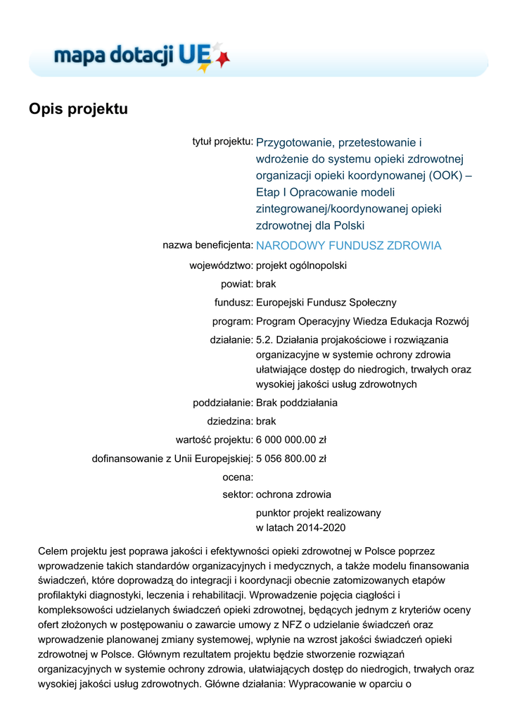 Opis projektu tytuł projektu: Przygotowanie, przetestowanie i wdrożenie do systemu opieki zdrowotnej organizacji opieki koordynowanej (OOK) – Etap I Opracowanie modeli zintegrowanej/koordynowanej opieki zdrowotnej dla Polski nazwa beneficjenta: NARODOWY FUNDUSZ ZDROWIA województwo: projekt ogólnopolski powiat: brak fundusz: Europejski Fundusz Społeczny program: Program Operacyjny Wiedza Edukacja Rozwój działanie: 5.2. Działania projakościowe i rozwiązania organizacyjne w systemie ochrony zdrowia ułatwiające dostęp do niedrogich, trwałych oraz wysokiej jakości usług zdrowotnych poddziałanie: Brak poddziałania dziedzina: brak wartość projektu: 6 000 000.00 zł dofinansowanie z Unii Europejskiej: 5 056 800.00 zł ocena: sektor: ochrona zdrowia punktor projekt realizowany w latach 2014-2020 Celem projektu jest poprawa jakości i efektywności opieki zdrowotnej w Polsce poprzez wprowadzenie takich standardów organizacyjnych i medycznych, a także modelu finansowania świadczeń, które doprowadzą do integracji i koordynacji obecnie zatomizowanych etapów profilaktyki diagnostyki, leczenia i rehabilitacji. Wprowadzenie pojęcia ciągłości i kompleksowości udzielanych świadczeń opieki zdrowotnej, będących jednym z kryteriów oceny ofert złożonych w postępowaniu o zawarcie umowy z NFZ o udzielanie świadczeń oraz wprowadzenie planowanej zmiany systemowej, wpłynie na wzrost jakości świadczeń opieki zdrowotnej w Polsce. Głównym rezultatem projektu będzie stworzenie rozwiązań organizacyjnych w systemie ochrony zdrowia, ułatwiających dostęp do niedrogich, trwałych oraz wysokiej jakości usług zdrowotnych. Główne działania: Wypracowanie w oparciu o doświadczenia międzynarodowe modeli opieki koordynowanej, w której zasadniczą rolę będzie odgrywała podstawowa i ambulatoryjna opieka zdrowotna z elementami profilaktyki.Przygotowanie publikacji dotyczącej najlepszych rozwiązań międzynarodowych poświęconych opiece koordynowanej. Zorganizowanie konferencji mającej na celu dyskusję z interesariuszami systemu ochrony zdrowia na temat głównych założeń implementacji nowych rozwiązań.Podjęcie aktywnej akcji edukacyjnej skierowanej do pacjentów oraz przedstawicieli podmiotów wykonujących działalność leczniczą na temat planowanych zmian polegających na wprowadzeniu opieki koordynowanej. Zadania projektu wymagające specjalistycznej wiedzy eksperckiej z zakresu opieki koordynowanej na poziomie międzynarodowym, będą realizowane we współpracy z Bankiem Światowym, prowadzącym swoje działania na całym świecie.Na I etap projektu przygotowania, przetestowania i wdrożenia do systemu opieki zdrowotnej organizacji opieki koordynowanej (OOK) zaplanowano 6 mln zł.
