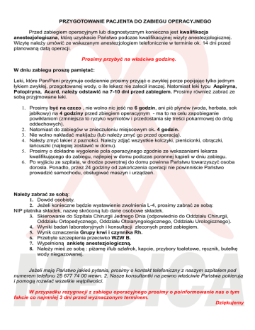 PRZYGOTOWANIE PACJENTA DO ZABIEGU OPERACYJNEGO Przed zabiegiem operacyjnym lub diagnostycznym konieczna jest kwalifikacja anestezjologiczna, którą uzyskacie Państwo podczas kwalifikacyjnej wizyty anestezjologicznej. Wizytę należy umówić ze wskazanym anestezjologiem telefonicznie w terminie ok. 14 dni przed planowaną datą operacji. Prosimy przybyć na właściwa godzinę. W dniu zabiegu proszę pamiętać: Leki, które Pan/Pani przyjmuje codziennie prosimy przyjąć o zwykłej porze popijając tylko jednym łykiem zwykłej, przegotowanej wody, o ile lekarz nie zalecił inaczej. Natomiast leki typu Aspiryna, Polopiryna, Acard, należy odstawić na 7-10 dni przed zabiegiem. Prosimy również zabrać ze sobą przyjmowane leki. 1. Prosimy być na czczo , nie wolno nic jeść na 6 godzin, ani pić płynów (woda, herbata, sok jabłkowy) na 4 godziny przed zbiegiem operacyjnym - ma to na celu zapobieganie powikłaniom (zmniejsza to ryzyko wymiotów i przedostania się treści pokarmowej do dróg oddechowych). 2. Natomiast do zabiegów w znieczuleniu miejscowym ok. 4 godzin. 3. Nie wolno nakładać makijażu (lub należy zmyć go przed operacją). 4. Należy zmyć lakier z paznokci. Należy zdjąć wszystkie kolczyki, pierścionki, obrączki, łańcuszki (najlepiej zostawić w domu). 5. Prosimy o dokładne wygolenie pola operacyjnego zgodnie ze wskazaniami lekarza kwalifikującego do zabiegu, najlepiej w domu podczas porannej kąpieli w dniu zabiegu. 6. Po wyjściu ze szpitala, w drodze powrotnej do domu powinna Państwu towarzyszyć osoba dorosła. Ponadto, przez 24 godziny od zakończenia operacji nie powinniście Państwo prowadzić samochodu, obsługiwać maszyn i urządzeń. Należy zabrać ze sobą: 1. Dowód osobisty. 2. Jeżeli konieczne będzie wystawienie zwolnienia L-4, prosimy zabrać ze sobą: NIP płatnika składek, nazwę skróconą lub dane osobowe składek. 3. Skierowanie do Szpitala Chirurgii Jednego Dnia (odpowiednio do Oddziału Chirurgii, Oddziału Ortopedycznego, Oddziału Otolaryngologicznego, Oddziału Urologicznego). 4. Wyniki badań laboratoryjnych i konsultacji zleconych przed zabiegiem. 5. Wynik oznaczenia Grupy krwi i czynnika Rh. 6. Przebyte szczepienia przeciwko WZW B. 7. Wypełnioną ankietę anestezjologiczną. 8. Należy mieć ze sobą : piżamę i/lub szlafrok, kapcie, przybory toaletowe, ręcznik, butelkę wody niegazowanej. Jeżeli mają Państwo jakieś pytania, prosimy o kontakt telefoniczny z naszym szpitalem pod numerem telefonu 25 677 74 00 wewn. 2. Nasze konsultantki na pewno właściwie Państwa pokierują i pomogą rozwiać wszelkie wątpliwości. W przypadku rezygnacji z zabiegu operacyjnego prosimy o poinformowanie nas o tym fakcie co najmniej 3 dni przed wyznaczonym terminem. Dziękujemy