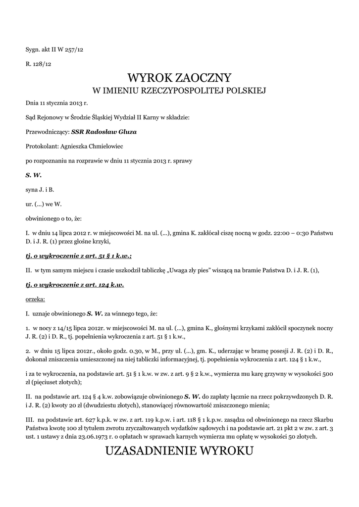 Sygn. akt II W 257/12 R. 128/12 WYROK ZAOCZNY W IMIENIU RZECZYPOSPOLITEJ POLSKIEJ Dnia 11 stycznia 2013 r. Sąd Rejonowy w Środzie Śląskiej Wydział II Karny w składzie: Przewodniczący: SSR Radosław Gluza Protokolant: Agnieszka Chmielowiec po rozpoznaniu na rozprawie w dniu 11 stycznia 2013 r. sprawy S. W. syna J. i B. ur. (...) we W. obwinionego o to, że: I. w dniu 14 lipca 2012 r. w miejscowości M. na ul. (...), gmina K. zakłócał ciszę nocną w godz. 22:00 – 0:30 Państwu D. i J. R. (1) przez głośne krzyki, tj. o wykroczenie z art. 51 § 1 k.w.; II. w tym samym miejscu i czasie uszkodził tabliczkę „Uwaga zły pies” wiszącą na bramie Państwa D. i J. R. (1), tj. o wykroczenie z art. 124 k.w. orzeka: I. uznaje obwinionego S. W. za winnego tego, że: 1. w nocy z 14/15 lipca 2012r. w miejscowości M. na ul. (...), gmina K., głośnymi krzykami zakłócił spoczynek nocny J. R. (2) i D. R., tj. popełnienia wykroczenia z art. 51 § 1 k.w., 2. w dniu 15 lipca 2012r., około godz. 0.30, w M., przy ul. (...), gm. K., uderzając w bramę posesji J. R. (2) i D. R., dokonał zniszczenia umieszczonej na niej tabliczki informacyjnej, tj. popełnienia wykroczenia z art. 124 § 1 k.w., i za te wykroczenia, na podstawie art. 51 § 1 k.w. w zw. z art. 9 § 2 k.w., wymierza mu karę grzywny w wysokości 500 zł (pięciuset złotych); II. na podstawie art. 124 § 4 k.w. zobowiązuje obwinionego S. W. do zapłaty łącznie na rzecz pokrzywdzonych D. R. i J. R. (2) kwoty 20 zł (dwudziestu złotych), stanowiącej równowartość zniszczonego mienia; III. na podstawie art. 627 k.p.k. w zw. z art. 119 k.p.w. i art. 118 § 1 k.p.w. zasądza od obwinionego na rzecz Skarbu Państwa kwotę 100 zł tytułem zwrotu zryczałtowanych wydatków sądowych i na podstawie art. 21 pkt 2 w zw. z art. 3 ust. 1 ustawy z dnia 23.06.1973 r. o opłatach w sprawach karnych wymierza mu opłatę w wysokości 50 złotych. UZASADNIENIE WYROKU Na podstawie przeprowadzonego przewodu sądowego ustalono następujący stan faktyczny: Obwiniony S. W. w godzinach wieczornych w dniu 14 lipca 2012r. przebywał w miejscowości M., gdzie zamieszkuje jego konkubina J. S.. S. W. chodził ulicą w stronę baru, po czym wracał, przechodząc w pobliżu budynku J. i D. R., przy ul. (...) w M.. Dowód: zeznania świadka J. R. (2), k. 3, 30, zeznania świadka D. R., k. 1, 29v – 30. J. R. (2) i D. R. przed godziną 22.00 przebywali na terenie swojej posesji, po czym udali się na spoczynek nocny. Dowód: zeznania świadka J. R. (2), k. 3, 30, zeznania świadka D. R., k. 1, 29v – 30. Po godzinie 22.00 S. W. ponownie przechodził ulicą (...), wykrzykiwał słowa wulgarne i kłócił się ze swoją konkubiną. Hałas wywołany przez obwinionego obudził D. R., zaś J. R. (2) wyszedł na posesję i zobaczył S. W., po czym wrócił do domu i poinformował o tym żonę. Dowód: zeznania świadka J. R. (2), k. 3, 30, zeznania świadka D. R., k. 1, 29v – 30. Około godz. 0.30 S. W. przechodząc ulicą (...) w M., podszedł do bramy posesji nr (...), a następnie w nią uderzył, powodując ułamanie tabliczki informacyjnej o wartości 20 zł. Słysząc głośny huk i wulgarne krzyki obwinionego, J. R. (2) wybiegł na zewnątrz i zobaczył, w odległości około trzech metrów od bramy, oddalającego się S. W.. Obawiając się eskalacji zachowania obwinionego, J. R. (2) nie zwracał mu uwagi, tylko wrócił do domu. Z uwagi na późną porę D. R. zdecydowała aby nie dzwonić na Policję, tylko zgłosić zdarzenie następnego dnia. Dowód: zeznania świadka J. R. (2), k. 3, 30, zeznania świadka D. R., k. 1, 29v – 30. Obwiniony S. W. ma 35 lat, pozostaje w związku konkubenckim, utrzymuje się z prac dorywczych. Obwiniony nie był leczony psychiatrycznie, neurologicznie ani odwykowo. Nie był karany sądownie za przestępstwa. Dowód: wyjaśnienia obwinionego S. W., k. 7 – 8. Obwiniony S. W. nie przyznał się do zarzucanego czynu i odmówił składania wyjaśnień. Ponadto Sąd Rejonowy zważył co następuje: Ustalenia stanu faktycznego w sprawie sąd poczynił w oparciu o zeznania świadków D. R. i J. R. (2), które uznał za w pełni wiarygodne. Dokonując powyższej oceny, sąd miał na uwadze spójny i logiczny charakter relacji świadków, którzy w sposób konsekwentny, na poszczególnych etapach postępowania, opisali zachowanie obwinionego. Dokonując bezpośredniej oceny zeznań świadków na rozprawie, sąd nie dopatrzył się w ich relacji oznak wskazujących na to, że podali nieprawdziwe okoliczności zdarzenia, bądź też w sposób bezprawny pomówili obwinionego o czyny, których nie popełnił. Odnosząc się z kolei do wyjaśnień obwinionego, sąd uznał że stanowią one wyłącznie wyraz przyjętej przez niego linii obrony i pominął je w zakresie ustaleń faktycznych w sprawie. Dokonując oceny przedstawionych powyżej dowodów sąd uznał, że sprawstwo i wina obwinionego S. W. w zakresie przypisanych mu wykroczeń nie budzą wątpliwości. Obwiniony dopuścił się wykroczenia z art. 51 § 1 k.w., gdyż po godzinie 22.00, kiedy obowiązuje cisza nocna, wykrzykiwał na ulicy (...) w M. głośne słowa, co spowodowało zakłócenie spoczynku nocnego D. i J. R. (2). Z kolei zachowanie obwinionego, polegające na uderzeniu w nieustalony sposób w bramę posesji pokrzywdzonych i zniszczeniu tabliczki informacyjnej o wartości 20 zł, realizowało znamiona wykroczenia z art. 124 § 1 k.w. W tym zakresie wskazać należy, że co prawda J. R. (2) nie widział tego jak doszło do zniszczenia tabliczki przez obwinionego, lecz zaraz po tym jak usłyszał huk i krzyki obwinionego wyszedł na zewnątrz i zauważył w pobliżu bramy oddalającego się S. W.. Powyższe jednoznacznie wskazuje na obwinionego, jako sprawcę przypisanego mu wykroczenia. Czyny popełnione przez S. W. były zawinione, okoliczności wyłączające winę nie zachodziły. Wymierzając obwinionemu karę grzywny za popełnione wykroczen
