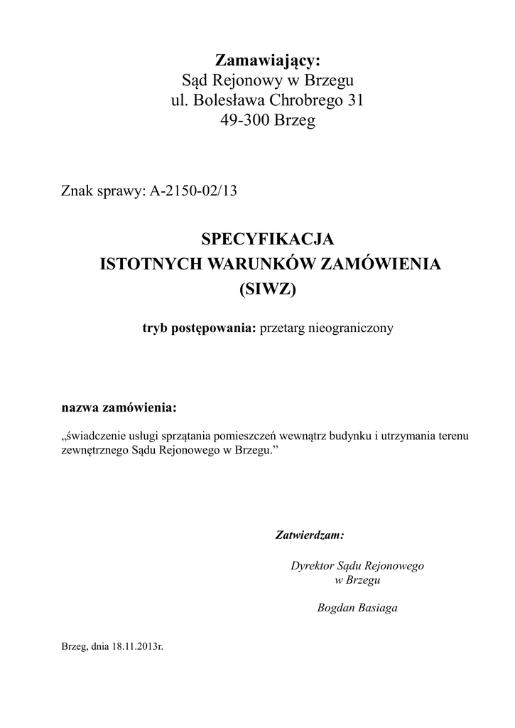 Zamawiający: Sąd Rejonowy w Brzegu ul. Bolesława Chrobrego 31 49-300 Brzeg Znak sprawy: A-2150-02/13 SPECYFIKACJA ISTOTNYCH WARUNKÓW ZAMÓWIENIA (SIWZ) tryb postępowania: przetarg nieograniczony nazwa zamówienia: „świadczenie usługi sprzątania pomieszczeń wewnątrz budynku i utrzymania terenu zewnętrznego Sądu Rejonowego w Brzegu.” Zatwierdzam: Dyrektor Sądu Rejonowego w Brzegu Bogdan Basiaga Brzeg, dnia 18.11.2013r. SIWZ Usługa sprzątania pomieszczeń wewnątrz budynku i utrzymania terenu zewnętrznego Sądu Rejonowego w Brzegu (A-2150-02/13) 1. Dane zamawiającego: Adres do korespondencji: Sąd Rejonowy w Brzegu, ul. Bolesława Chrobrego 31, 49-300 Brzeg NIP: 747-11-10-890 REGON: 000323677 Faks: 077-444-23-26 godziny urzędowania: pn-pt w godzinach 730 - 1530, Adres strony internetowej: www.brzeg.sr.gov.pl adres e-mail: [email protected] 2. Tryb udzielenia zamówienia. 2.1. Postępowanie o udzielenie zamówienia publicznego jest prowadzone w trybie przetargu nieograniczonego na podstawie ustawy z dnia 29 stycznia 2004 r. Prawo zamówień publicznych (tekst jednolity Dz.U. z 2013r. poz. 907 ze zm.), zwanej dalej „PZP” i przepisów wykonawczych wydanych na jej podstawie. W zakresie nieuregulowanym w niniejszej Specyfikacji Istotnych Warunków Zamówienia, zwanej dalej w skrócie „SIWZ”, mają zastosowanie przepisy PZP. 2.2. Podstawa prawna udzielenia zamówienia publicznego: art. 10 ust. 1 w związku z art. 39 – 46 ustawy PZP. 3. Opis przedmiotu zamówienia. 3.1 Numery klasyfikacji zamówienia wg Wspólnego Słownika Zamówień: Nr CPV 90.91.12.00-8 Usługi sprzątania budynków, Nr CPV 90.91.92.00-4 Usługi sprzątania biur, Nr CPV 90.91.13.00-9 Usługi czyszczenia okien, Nr CPV 90.91.40.00-7 Usługi sprzątania parkingów, Nr CPV 77.31.00.00-6 Usługi sadzenia roślin i utrzymania terenów zielonych. 3.2 Przedmiotem zamówienia jest usługa sprzątania pomieszczeń wewnątrz budynku i utrzymania terenu zewnętrznego Sądu Rejonowego w Brzegu przy ul. Bolesława Chrobrego 31, zgodnie ze szczegółowym opisem zawartym w załączniku nr 1 i 2 do niniejszej specyfikacji. 3.3 Wymagania szczegółowe związane z przedmiotem zamówienia: 3.3.1. Usługę sprzątania pomieszczeń wewnątrz budynku i utrzymania terenu zewnętrznego wokół budynku Wykonawca zobowiązany jest wykonać przy użyciu własnego sprzętu, środków myjących, czyszczących, konserwujących, pielęgnacyjnych i materiałów (np. kostka WC, papier toaletowy, ręczniki, worki do pojemników na odpady, płyn do naczyń, kostki do zmywarki naczyń, worki na liście, środki antypoślizgowe, środki do nawożenia roślin) oraz swoimi pracownikami, za których działania jest odpowiedzialny. Wykonawca może nieodpłatnie korzystać z wody i energii elektrycznej Zamawiającego na potrzeby wykonania przedmiotu zamówienia. Strona 2/38 SIWZ Usługa sprzątania pomieszczeń wewnątrz budynku i utrzymania terenu zewnętrznego Sądu Rejonowego w Brzegu (A-2150-02/13) 3.3.2. Zamawiający dopuszcza powierzenie wyodrębnionych prac (wymienionych w Załączniku nr 1 do SIWZ, poz. 14, 15, 16, 28 33) podwykonawcom. Wykonawca jest odpowiedzialny za zlecone do podwykonania prace oraz skutki działania podwykonawcy. 3.3.3. Usługa powinna być wykonywana, przy zastosowaniu atestowanych profesjonalnych środków czystości oraz profesjonalnego sprzętu ręcznego i mechanicznego, dostarczonego przez Wykonawcę. Dostarczane artykuły higieniczne i środki czyszczące, myjące, konserwujące i pielęgnacyjne używane przez Wykonawcę i ewentualnych podwykonawców do realizacji zamówienia winny posiadać atesty tzn. spełniać wymagania bezpieczeństwa użytkowania, nie stanowić zagrożenia dla życia, mienia i środowiska naturalnego oraz posiadać aktualny termin ważności. 3.3.4. Usługa sprzątania wykonywana będzie w dni robocze w godz. od 15:00 do 21:00, oraz przez jedną osobę dyżurującą w godzinach od 08.00 do 12.00, w celu realizacji bieżących prac, z zastrzeżeniem pkt 3.3.5., natomiast teren wokół budynku powinien być utrzymany w czystości do godz. 7.30. 3.3.5. W porozumieniu z Zamawiającym prace okresowe, o których mowa w pkt 3.3.7 będą mogły być wykonywane w dniach wolnych od pracy, szczególnie jeśli wymaga tego technologia (np. czas schnięcia czyszczonych powierzchni). 3.3.6. Do realizacji wszelkich prac objętych niniejszym postępowaniem przetargowym Wykonawca zobowiązany jest skierować pracowników posiadających aktualne świadectwo niekaralności. 3.3.7. Wykonawca musi zapewnić dodatkowych pracowników na czas realizacji zadań okresowych (np. czyszczenie polimeryzacja podłóg, pranie dywanów i tapicerki krzeseł, utrzymanie terenów zielonych) w ilości wystarczającej do prawidłowego i terminowego wykonania tych prac. Zapisy pkt 3.3.6 stosuje się odpowiednio. 3.3.8. Wykonawca zobowiązany będzie ponadto do dostarczania i uzupełniania w sanitariatach i pomieszczeniach socjalnych następujących środków czystości: a) papier toaletowy celulozowy, min. 2-warstwowy, b) ręczniki papierowe (typu ZZ, składanka), c) mydło w płynie kolagenowe ph 5.5, d) odświeżacze powietrza w żelu, kostki WC do muszli i pisuarów, e) worki na śmieci w koszach (dotyczy wszystkich pomieszczeń sądu), f) płyn do mycia naczyń typu Ludwik lub równoważny, g) tabletki do zmywarki do naczyń, h) gąbki do mycia naczyń. 3.3.9. Zatrudnieni pracownicy wykonawcy winni być ubrani jednolicie i posiadać umieszczone w widocznym miejscu identyfikatory. 3.3.10. Wszyscy pracownicy zatrudnieni do wykonania usługi będą musieli okazać Zamawiającemu zaświadczenie o niekaralności najpóźniej jeden dzień przed przystąpieniem do pracy. Strona 3/38 SIWZ Usługa sprzątania pomieszczeń wewnątrz budynku i utrzymania terenu zewnętrznego Sądu Rejonowego w Brzegu (A-2150-02/13) 3.3.11. Wszystkie prace porządkowe będą podlegać cotygodniowemu (w każdy piątek) sprawdzaniu przez osobę w