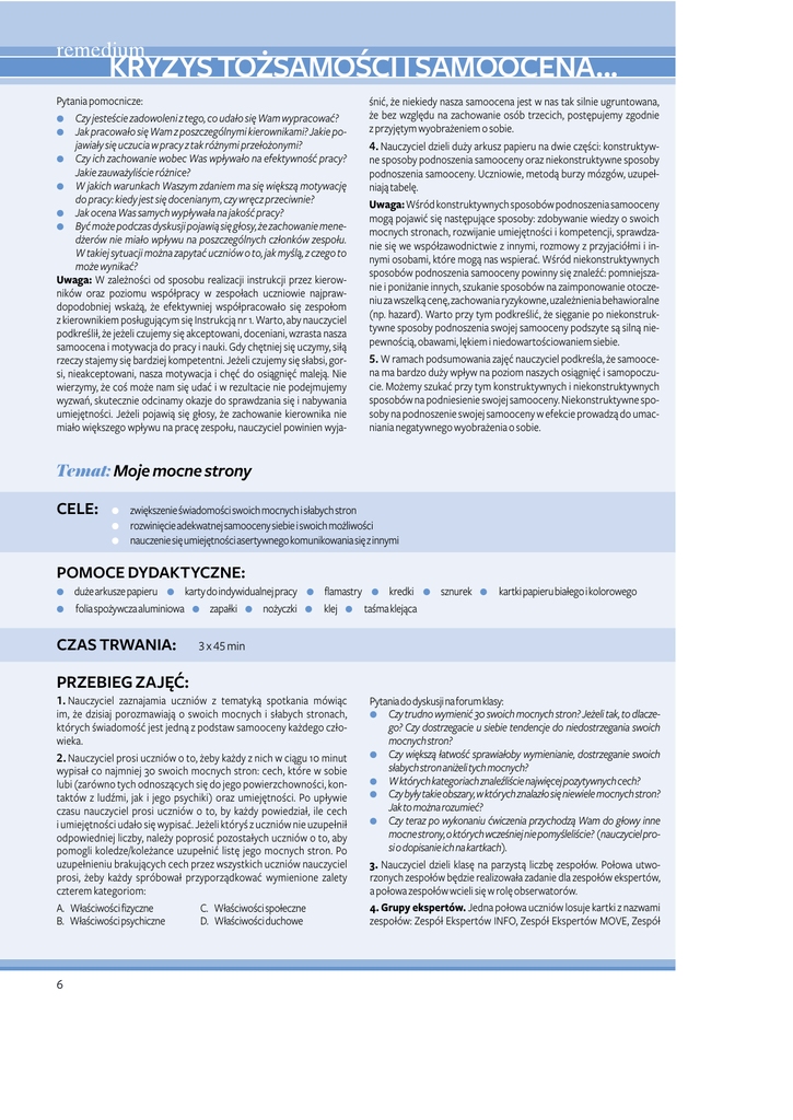 Kryzys tOżsamOści i samOOcena... Pytania pomocnicze: ● C zy jesteście zadowoleni z tego, co udało się Wam wypracować? ● J ak pracowało się Wam z poszczególnymi kierownikami? Jakie pojawiały się uczucia w pracy z tak różnymi przełożonymi? ● C zy ich zachowanie wobec Was wpływało na efektywność pracy? Jakie zauważyliście różnice? ● W jakich warunkach Waszym zdaniem ma się większą motywację do pracy: kiedy jest się docenianym, czy wręcz przeciwnie? ● J ak ocena Was samych wypływała na jakość pracy? ● B yć może podczas dyskusji pojawią się głosy, że zachowanie menedżerów nie miało wpływu na poszczególnych członków zespołu. W takiej sytuacji można zapytać uczniów o to, jak myślą, z czego to może wynikać? Uwaga: W zależności od sposobu realizacji instrukcji przez kierowników oraz poziomu współpracy w zespołach uczniowie najprawdopodobniej wskażą, że efektywniej współpracowało się zespołom z kierownikiem posługującym się Instrukcją nr 1. Warto, aby nauczyciel podkreślił, że jeżeli czujemy się akceptowani, doceniani, wzrasta nasza samoocena i motywacja do pracy i nauki. Gdy chętniej się uczymy, siłą rzeczy stajemy się bardziej kompetentni. Jeżeli czujemy się słabsi, gorsi, nieakceptowani, nasza motywacja i chęć do osiągnięć maleją. Nie wierzymy, że coś może nam się udać i w rezultacie nie podejmujemy wyzwań, skutecznie odcinamy okazje do sprawdzania się i nabywania umiejętności. Jeżeli pojawią się głosy, że zachowanie kierownika nie miało większego wpływu na pracę zespołu, nauczyciel powinien wyja- śnić, że niekiedy nasza samoocena jest w nas tak silnie ugruntowana, że bez względu na zachowanie osób trzecich, postępujemy zgodnie z przyjętym wyobrażeniem o sobie. 4. Nauczyciel dzieli duży arkusz papieru na dwie części: konstruktywne sposoby podnoszenia samooceny oraz niekonstruktywne sposoby podnoszenia samooceny. Uczniowie, metodą burzy mózgów, uzupełniają tabelę. Uwaga: Wśród konstruktywnych sposobów podnoszenia samooceny mogą pojawić się następujące sposoby: zdobywanie wiedzy o swoich mocnych stronach, rozwijanie umiejętności i kompetencji, sprawdzanie się we współzawodnictwie z innymi, rozmowy z przyjaciółmi i innymi osobami, które mogą nas wspierać. Wśród niekonstruktywnych sposobów podnoszenia samooceny powinny się znaleźć: pomniejszanie i poniżanie innych, szukanie sposobów na zaimponowanie otoczeniu za wszelką cenę, zachowania ryzykowne, uzależnienia behawioralne (np. hazard). Warto przy tym podkreślić, że sięganie po niekonstruktywne sposoby podnoszenia swojej samooceny podszyte są silną niepewnością, obawami, lękiem i niedowartościowaniem siebie. 5. W ramach podsumowania zajęć nauczyciel podkreśla, że samoocena ma bardzo duży wpływ na poziom naszych osiągnięć i samopoczucie. Możemy szukać przy tym konstruktywnych i niekonstruktywnych sposobów na podniesienie swojej samooceny. Niekonstruktywne sposoby na podnoszenie swojej samooceny w efekcie prowadzą do umacniania negatywnego wyobrażenia o sobie. Temat: Moje mocne strony cele: zwiększenie świadomości swoich mocnych i słabych stron rozwinięcie adekwatnej samooceny siebie i swoich możliwości ● nauczenie się umiejętności asertywnego komunikowania się z innymi ● ● POMOCE DYDAKTYCZNE: ●duże arkusze papieru ●karty do indywidualnej pracy ●flamastry ●kredki ●sznurek ● kartki papieru białego i kolorowego ● folia spożywcza aluminiowa ●zapałki ●nożyczki ● klej ● taśma klejąca CZAs TrwANiA: 3 x 45 min PrzebieG zaJĘĆ: 1. Nauczyciel zaznajamia uczniów z tematyką spotkania mówiąc im, że dzisiaj porozmawiają o swoich mocnych i słabych stronach, których świadomość jest jedną z podstaw samooceny każdego człowieka. 2. Nauczyciel prosi uczniów o to, żeby każdy z nich w ciągu 10 minut wypisał co najmniej 30 swoich mocnych stron: cech, które w sobie lubi (zarówno tych odnoszących się do jego powierzchowności, kontaktów z ludźmi, jak i jego psychiki) oraz umiejętności. Po upływie czasu nauczyciel prosi uczniów o to, by każdy powiedział, ile cech i umiejętności udało się wypisać. Jeżeli któryś z uczniów nie uzupełnił odpowiedniej liczby, należy poprosić pozostałych uczniów o to, aby pomogli koledze/koleżance uzupełnić listę jego mocnych stron. Po uzupełnieniu brakujących cech przez wszystkich uczniów nauczyciel prosi, żeby każdy spróbował przyporządkować wymienione zalety czterem kategoriom: A. Właściwości fizyczne C. Właściwości społeczne B. Właściwości psychiczne D. Właściwości duchowe 6 Pytania do dyskusji na forum klasy: ● C zy trudno wymienić 30 swoich mocnych stron? Jeżeli tak, to dlaczego? Czy dostrzegacie u siebie tendencje do niedostrzegania swoich mocnych stron? ● C zy większą łatwość sprawiałoby wymienianie, dostrzeganie swoich słabych stron aniżeli tych mocnych? ● W których kategoriach znaleźliście najwięcej pozytywnych cech? ● C zy były takie obszary, w których znalazło się niewiele mocnych stron? Jak to można rozumieć? ● C zy teraz po wykonaniu ćwiczenia przychodzą Wam do głowy inne mocne strony, o których wcześniej nie pomyśleliście? (nauczyciel prosi o dopisanie ich na kartkach). 3. Nauczyciel dzieli klasę na parzystą liczbę zespołów. Połowa utworzonych zespołów będzie realizowała zadanie dla zespołów ekspertów, a połowa zespołów wcieli się w rolę obserwatorów. 4. Grupy ekspertów. Jedna połowa uczniów losuje kartki z nazwami zespołów: Zespół Ekspertów INFO, Zespół Ekspertów MOVE, Zespół Ekspertów HOME, Zespół Ekspertów PLAZA. Uczniowie odnajdują swoich kolegów/koleżanki z zespołu ekspertów o tej samej nazwie. Następnie nauczyciel przekazuje instrukcje i materiały do pracy: sznurek, kartki papieru białego i kolorowego, folię spożywczą, zapałki, nożyczki