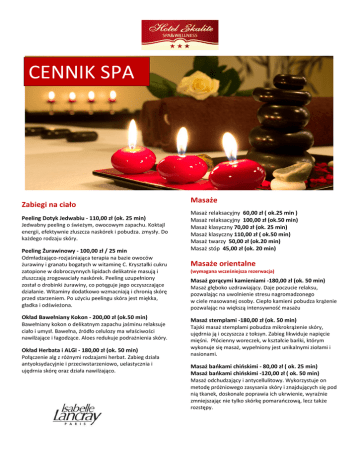 CENNIK SPA Zabiegi na ciało Peeling Dotyk Jedwabiu - 110,00 zł (ok. 25 min) Jedwabny peeling o świeżym, owocowym zapachu. Koktajl energii, efektywnie złuszcza naskórek i pobudza. zmysły. Do każdego rodzaju skóry. Peeling Żurawinowy - 100,00 zł / 25 min Odmładzająco-rozjaśniająca terapia na bazie owoców żurawiny i granatu bogatych w witaminę C. Kryształki cukru zatopione w dobroczynnych lipidach delikatnie masują i złuszczają zrogowaciały naskórek. Peeling uzupełniony został o drobinki żurawiny, co potęguje jego oczyszczające działanie. Witaminy dodatkowo wzmacniają i chronią skórę przed starzeniem. Po użyciu peelingu skóra jest miękka, gładka i odświeżona. Okład Bawełniany Kokon - 200,00 zł (ok.50 min) Bawełniany kokon o delikatnym zapachu jaśminu relaksuje ciało i umysł. Bawełna, źródło celulozy ma właściwości nawilżające i łagodzące. Aloes redukuje podrażnienia skóry. Okład Herbata i ALGI - 180,00 zł (ok. 50 min) Połączenie alg z różnymi rodzajami herbat. Zabieg działa antyoksydacyjnie i przeciwstarzeniowo, uelastycznia i ujędrnia skórę oraz działa nawilżająco. Masaże Masaż relaksacyjny 60,00 zł ( ok.25 min ) Masaż relaksacyjny 100,00 zł (ok.50 min) Masaż klasyczny 70,00 zł (ok. 25 min) Masaż klasyczny 110,00 zł ( ok.50 min) Masaż twarzy 50,00 zł (ok.20 min) Masaż stóp 45,00 zł (ok. 20 min) Masaże orientalne (wymagana wcześniejsza rezerwacja) Masaż gorącymi kamieniami -180,00 zł (ok. 50 min) Masaż głęboko uzdrawiający. Daje poczucie relaksu, pozwalając na uwolnienie stresu nagromadzonego w ciele masowanej osoby. Ciepło kamieni pobudza krążenie pozwalając na większą intensywność masażu Masaż stemplami -180,00 zł (ok. 50 min) Tajski masaż stemplami pobudza mikrokrążenie skóry, ujędrnia ją i oczyszcza z toksyn. Zabieg likwiduje napięcie mięśni. Płócienny woreczek, w kształcie bańki, którym wykonuje się masaż, wypełniony jest unikalnymi ziołami i nasionami. Masaż bańkami chińskimi - 80,00 zł ( ok. 25 min) Masaż bańkami chińskimi -120,00 zł ( ok. 50 min) Masaż odchudzający i antycellulitowy. Wykorzystuje on metodę próżniowego zasysania skóry i znajdujących się pod nią tkanek, doskonale poprawia ich ukrwienie, wyraźnie zmniejszając nie tylko skórkę pomarańczową, lecz także rozstępy. Maski algowe na twarz Zabiegi pielęgnacyjne na twarz Women’s Bliss Peel Off Mask 50,00 zł (ok.20 min) Cellular Balans -130,00 zł (ok. 40 min) „ Maska Hormonu szczęścia”- betaphroline to roślinny wyciąg, który stymuluje wydzielanie beta-endorfinyhormonu odpowiedzialnego za uczucie szczęścia. Algi laminaria odpowiadają za działanie nawilżające. Zabieg oczyszczający. Zastosowane ekstrakty roślinne działają przeciwzapalnie i antybakteryjnie. Zabieg skutecznie wzmacnia odporność mechaniczna skóry, wycisza pracę gruczołów łojowych, zmniejsza wrażliwość i skłonność do stanów zapalnych. Również dla cer wrażliwych. Anti-wrinkle Peel Off Mask 50,00 zł (ok.20 min) Zapobiega zmarszczkom mimicznym. Zawiera wyciąg z Lola Implexa- zielonej algi, która poprawia jędrność i gęstość skóry oraz działa rozkurczająco na napiete mięśnie twarzy, dzieki czemu pomaga zapobiec zmarszczkom mimicznym. Maska + masaż twarzy - 90,00 zł( ok. 40 min) Zabiegi na twarz Vitamina Revitalisant - 220,00 zł ( ok. 50 min) Zabieg dotleniający -dotleniająca moc witamin. Dotlenia, witalizuje i wzmacnia naskórek, chroni przed procedurami fotostarzenia, wyrównuje koloryt, stymuluje procesy odnowy komórkowej. Idealny zabieg na każdą porę roku, polecany szczególnie w okresie jesienno-zimowym. Egostyle Men – dla mężczyzn - 160,00 zł (ok. 50 min) Zwalcza niekorzystny wpływ środowiska zewnętrznego na skórę, niweluje stres i zmęczenie. Wzmacnia naturalną barierę ochronna skóry, wyrównuje ubytki wilgoci. Skóra odzyskuje gładkość i zdrowy wygląd. Kosmetyki dopasowane do cery męskiej. Egostyle Antypollution – 160,00 zł (ok. 50 min) Zabieg nawilżający. Zwalcza niekorzystny wpływ środowiska zewnętrznego na skórę, niweluje stres i zmęczenie. Wzmacnia naturalną barierę ochronną skóry, zmniejsza nadwrażliwość i reaktywność. Skóra odzyskuje napięcie, gładkość i zdrowy koloryt. Zabieg nawilżający dla kobiet. Czas trwania zabiegów obejmuję również czas na przygotowanie się do zabiegu i jego zakończenie. Bez kosztowna anulacja zabiegu z min. 24 godzinnym wyprzedzeniem, po tym terminie klient zostanie obciążony 50% wartością zamówionego zabiegu. ul. Krokusów 4 Cellular Filler- 140,00 zł (ok. 40 min) Zabieg liftujący- przeciwzmarszczkowy Dla cery pozbawionej jędrności i sprężystości. Składniki aktywne zabiegu( system lipidów) naprawia strukturę skóry, chroni przed toksynami, zwiększa ilość kwasu hialuronowego. DAY SPA Rytuały 3 zabiegów Rytuał regenerujący na ciało - 290,00 zł Peeling Dotyk Jedwabiu, Okład na ciało Herbata i Algi, Masaż relaksacyjny 25 min. (ok. 2 godziny) Rytuał nawilżający na ciało - 310,00 zł Peeling ciała, Okład na ciało Bawełniany Kokon, Maska – serum Zielony Sekret ( ok. 2 godziny) Rytuał na ciało i twarz - 310,00 zł Okład na ciało Bawełniany Kokon, Maska algowa na twarz, Masaż klasyczny 50 min. (ok. 2,5 godziny) KIDS SPA Aksamitna maska algowa - 50,00 zł (ok. 20 min) Do cery tłustej i z problemami ( 12-18 lat) Anielski relaks - 90,00 zł (ok. 40 min) Maska algowa + masaż twarzy Pomarańczowy Raj - 50,00 zł ok.20 min Orzeźwiający masaż plecków Pakiet dla mamy i dziecka dwie maseczki algowe wykonywane jednocześnie 90,00 zł (ok. 30 min) Zapraszamy serdecznie Hotel Skalite *** SPA & Wellness 43-370 Szczyrk Telefon: 33 817 91 45 [email protected]