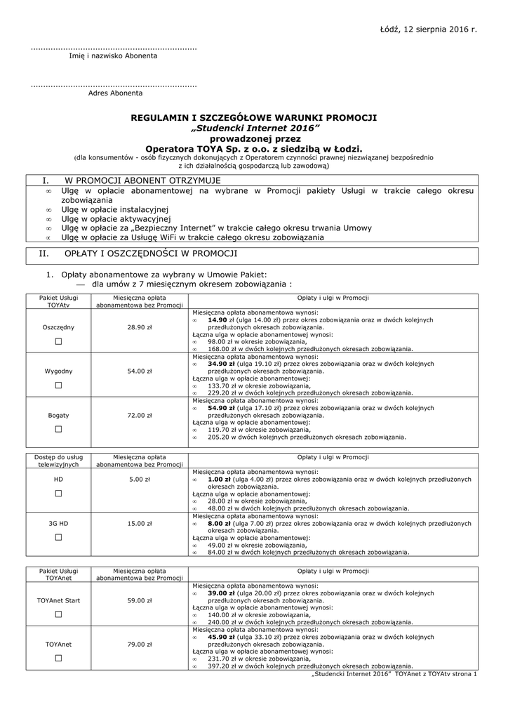 Łódź, 12 sierpnia 2016 r. ................................................................... Imię i nazwisko Abonenta ................................................................... Adres Abonenta REGULAMIN I SZCZEGÓŁOWE WARUNKI PROMOCJI „Studencki Internet 2016” prowadzonej przez Operatora TOYA Sp. z o.o. z siedzibą w Łodzi. (dla konsumentów - osób fizycznych dokonujących z Operatorem czynności prawnej niezwiązanej bezpośrednio z ich działalnością gospodarczą lub zawodową) I. • • • • • W PROMOCJI ABONENT OTRZYMUJE Ulgę w opłacie abonamentowej na wybrane w Promocji pakiety Usługi w trakcie całego okresu zobowiązania Ulgę w opłacie instalacyjnej Ulgę w opłacie aktywacyjnej Ulgę w opłacie za „Bezpieczny Internet” w trakcie całego okresu trwania Umowy Ulgę w opłacie za Usługę WiFi w trakcie całego okresu zobowiązania II. OPŁATY I OSZCZĘDNOŚCI W PROMOCJI 1. Opłaty abonamentowe za wybrany w Umowie Pakiet: dla umów z 7 miesięcznym okresem zobowiązania : Pakiet Usługi TOYAtv Oszczędny Miesięczna opłata abonamentowa bez Promocji 28.90 zł □ Wygodny 54.00 zł □ Bogaty 72.00 zł □ Dostęp do usług telewizyjnych Miesięczna opłata abonamentowa bez Promocji HD 5.00 zł □ 3G HD 15.00 zł □ Pakiet Usługi TOYAnet TOYAnet Start Miesięczna opłata abonamentowa bez Promocji 59.00 zł □ TOYAnet □ 79.00 zł Opłaty i ulgi w Promocji Miesięczna opłata abonamentowa wynosi: • 14.90 zł (ulga 14.00 zł) przez okres zobowiązania oraz w dwóch kolejnych przedłużonych okresach zobowiązania. Łączna ulga w opłacie abonamentowej wynosi: • 98.00 zł w okresie zobowiązania, • 168.00 zł w dwóch kolejnych przedłużonych okresach zobowiązania. Miesięczna opłata abonamentowa wynosi: • 34.90 zł (ulga 19.10 zł) przez okres zobowiązania oraz w dwóch kolejnych przedłużonych okresach zobowiązania. Łączna ulga w opłacie abonamentowej: • 133.70 zł w okresie zobowiązania, • 229.20 zł w dwóch kolejnych przedłużonych okresach zobowiązania. Miesięczna opłata abonamentowa wynosi: • 54.90 zł (ulga 17.10 zł) przez okres zobowiązania oraz w dwóch kolejnych przedłużonych okresach zobowiązania. Łączna ulga w opłacie abonamentowej: • 119.70 zł w okresie zobowiązania, • 205.20 w dwóch kolejnych przedłużonych okresach zobowiązania. Opłaty i ulgi w Promocji Miesięczna opłata abonamentowa wynosi: • 1.00 zł (ulga 4.00 zł) przez okres zobowiązania oraz w dwóch kolejnych przedłużonych okresach zobowiązania. Łączna ulga w opłacie abonamentowej: • 28.00 zł w okresie zobowiązania, • 48.00 zł w dwóch kolejnych przedłużonych okresach zobowiązania. Miesięczna opłata abonamentowa wynosi: • 8.00 zł (ulga 7.00 zł) przez okres zobowiązania oraz w dwóch kolejnych przedłużonych okresach zobowiązania. Łączna ulga w opłacie abonamentowej: • 49.00 zł w okresie zobowiązania, • 84.00 zł w dwóch kolejnych przedłużonych okresach zobowiązania. Opłaty i ulgi w Promocji Miesięczna opłata abonamentowa wynosi: • 39.00 zł (ulga 20.00 zł) przez okres zobowiązania oraz w dwóch kolejnych przedłużonych okresach zobowiązania. Łączna ulga w opłacie abonamentowej wynosi: • 140.00 zł w okresie zobowiązania, • 240.00 zł w dwóch kolejnych przedłużonych okresach zobowiązania. Miesięczna opłata abonamentowa wynosi: • 45.90 zł (ulga 33.10 zł) przez okres zobowiązania oraz w dwóch kolejnych przedłużonych okresach zobowiązania. Łączna ulga w opłacie abonamentowej wynosi: • 231.70 zł w okresie zobowiązania, • 397.20 zł w dwóch kolejnych przedłużonych okresach zobowiązania. „Studencki Internet 2016” TOYAnet z TOYAtv strona 1 TOYAnet 120 89.00 zł □ Pakiet Usługi TOYAtv Oszczędny dla umów z 8 miesięcznym okresem zobowiązania : Miesięczna opłata abonamentowa bez Promocji 28.90 zł □ Wygodny 54.00 zł □ Bogaty 72.00 zł □ Dostęp do usług telewizyjnych Miesięczna opłata abonamentowa bez Promocji HD 5.00 zł □ 3G HD 15.00 zł □ Pakiet Usługi TOYAnet TOYAnet Start 59.00 zł 79.00 zł □ TOYAnet 120 89.00 zł □ Pakiet Usługi TOYAtv Oszczędny Miesięczna opłata abonamentowa bez Promocji 28.90 zł 54.00 zł □ Bogaty □ Miesięczna opłata abonamentowa wynosi: • 14.90 zł (ulga 14.00 zł) przez okres zobowiązania oraz w dwóch kolejnych przedłużonych okresach zobowiązania. Łączna ulga w opłacie abonamentowej wynosi: • 112.00 zł w okresie zobowiązania, • 168.00 zł w dwóch kolejnych przedłużonych okresach zobowiązania. Miesięczna opłata abonamentowa wynosi: • 34.90 zł (ulga 19.10 zł) przez okres zobowiązania oraz w dwóch kolejnych przedłużonych okresach zobowiązania. Łączna ulga w opłacie abonamentowej: • 152.80 zł w okresie zobowiązania, • 229.20 zł w dwóch kolejnych przedłużonych okresach zobowiązania. Miesięczna opłata abonamentowa wynosi: • 54.90 zł (ulga 17.10 zł) przez okres zobowiązania oraz w dwóch kolejnych przedłużonych okresach zobowiązania. Łączna ulga w opłacie abonamentowej: • 136.80 zł w okresie zobowiązania, • 205.20 w dwóch kolejnych przedłużonych okresach zobowiązania. Opłaty i ulgi w Promocji Miesięczna opłata abonamentowa wynosi: • 1.00 zł (ulga 4.00 zł) przez okres zobowiązania oraz w dwóch kolejnych przedłużonych okresach zobowiązania. Łączna ulga w opłacie abonamentowej: • 32.00 zł w okresie zobowiązania, • 48.00 zł w dwóch kolejnych przedłużonych okresach zobowiązania. Miesięczna opłata abonamentowa wynosi: • 8.00 zł (ulga 7.00 zł) przez okres zobowiązania oraz w dwóch kolejnych przedłużonych okresach zobowiązania. Łączna ulga w opłacie abonamentowej: • 56.00 zł w okresie zobowiązania, • 84.00 zł w dwóch kolejnych przedłużonych okresach zobowiązania. Opłaty i ulgi w Promocji Miesięczna opłata abonamentowa wynosi: • 39.00 zł (ulga 20.00 zł) przez okres zobowiąz