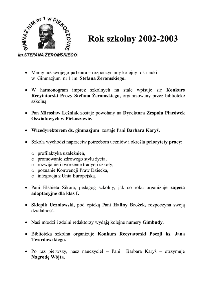 Rok szkolny 2002-2003 - Gimnazjum nr 1 im. Stefana Żeromskiego