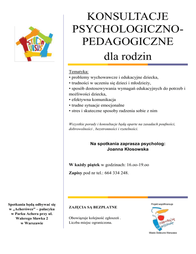 KONSULTACJE PSYCHOLOGICZNOPEDAGOGICZNE dla rodzin Tematyka: • problemy wychowawcze i edukacyjne dziecka, • trudności w uczeniu się dzieci i młodzieży, • sposób dostosowywania wymagań edukacyjnych do potrzeb i możliwości dziecka, • efektywna komunikacja • trudne sytuacje emocjonalne • stres i skuteczne sposoby radzenia sobie z nim Wszystkie porady i konsultacje będą oparte na zasadach poufności, dobrowolności , bezstronności i rzetelności. Na spotkania zaprasza psycholog: Joanna Kłosowska W każdy piątek w godzinach: 16.oo-19.oo Zapisy pod nr tel.: 664 334 248. Spotkania będą odbywać się w „Acherówce” – pałacyku w Parku Achera przy ul. Walerego Sławka 2 w Warszawie ZAJĘCIA SĄ BEZPŁATNE Obowiązuje kolejność zgłoszeń . Liczba miejsc ograniczona.