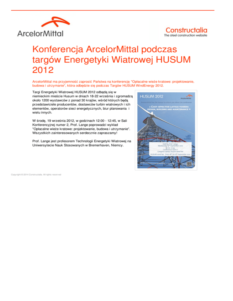 Konferencja ArcelorMittal podczas targów Energetyki Wiatrowej HUSUM 2012 ArcelorMittal ma przyjemność zaprosić Państwa na konferencję "Opłacalne wieże kratowe: projektowanie, budowa i utrzymanie", która odbędzie się podczas Targów HUSUM WindEnergy 2012. Targi Energetyki Wiatrowej HUSUM 2012 odbędą się w niemieckim mieście Husum w dniach 18-22 września i zgromadzą około 1200 wystawców z ponad 30 krajów, wśród których będą przedstawiciele producentów, dostawców turbin wiatrowych i ich elementów, operatorów sieci energetycznych, biur planowania i wielu innych. W środę, 19 września 2012, w godzinach 12:00 - 12:45, w Sali Konferencyjnej numer 2, Prof. Lange poprowadzi wykład "Opłacalne wieże kratowe: projektowanie, budowa i utrzymanie". Wszystkich zainteresowanych serdecznie zapraszamy! Prof. Lange jest profesorem Technologii Energetyki Wiatrowej na Uniwersytecie Nauk Stosowanych w Bremerhaven, Niemcy. Copyright © 2014 Constructalia. All rights reserved