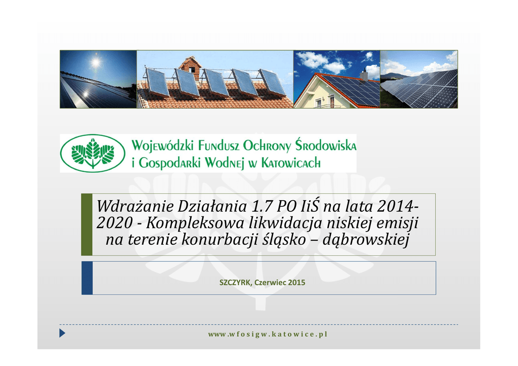 Wdrażanie Działania 1.7 PO IiŚ na lata 20142020 - Kompleksowa likwidacja niskiej emisji na terenie konurbacji śląsko – dąbrowskiej SZCZYRK, Czerwiec 2015 www .w f o s i g w . k a t o w i c e . p l Program Operacyjny Infrastruktura i Środowisko 2014-2020 – Działanie 1.7 PODSTAWA WSPARCIA W DZIAŁANIU 1.7 Oś priorytetowa I Zmniejszenie emisyjności gospodarki Realizuje Cel tematyczny 4 Umowy Partnerstwa – Wspieranie przejścia na gospodarkę niskoemisyjną we wszystkich sektorach. Priorytet inwestycyjny 4.3: Wspieranie efektywności energetycznej, inteligentnego zarządzania energią i wykorzystania odnawialnych źródeł energii w infrastrukturze publicznej, w tym w budynkach publicznych i w sektorze mieszkaniowym. Priorytet inwestycyjny 4.5: Promowanie strategii niskoemisyjnych dla wszystkich rodzajów terytoriów, w szczególności dla obszarów miejskich, w tym wspieranie zrównoważonej multimodalnej mobilności miejskiej i działań adaptacyjnych mających oddziaływanie łagodzące na zmiany klimatu. Priorytet inwestycyjny 4.6: Promowanie wykorzystania wysokosprawnej kogeneracji ciepła i energii elektrycznej w oparciu o zapotrzebowanie na ciepło użytkowe. Program kompleksowej likwidacji niskiej emisji na terenie konurbacji śląsko – dąbrowskiej – Działanie 1.7 ROLA WFOŚiGW w KATOWICACH INSTYTUCJA WDRAŻAJĄCA DZIAŁANIE 1.7: „Kompleksowa likwidacja niskiej emisji na terenie konurbacji śląsko-dąbrowskiej” Program kompleksowej likwidacji niskiej emisji na terenie konurbacji śląsko – dąbrowskiej – Działanie 1.7 ZAKRES OBSZAROWY DZIAŁANIA 1.7: obszar gmin i powiatów ziemskich wchodzących w skład Subregionu Centralnego Województwa Śląskiego (81 członków subregionu) objęty Strategią ZIT dla Województwa Śląskiego; podstawa ubiegania się o wsparcie oraz wybór projektów – ujęcie projektów w Strategii ZIT jako inwestycji niezbędnych do osiągnięcia celów Działania 1.7; projekty realizowane będą głównie na obszarach o dużych skupiskach wielorodzinnych budynków mieszkalnych. Program kompleksowej likwidacji niskiej emisji na terenie konurbacji śląsko – dąbrowskiej – Działanie 1.7 CELE INTERWENCJI W DZIAŁANIU 1.7: Likwidacja niskiej emisji w Subregionie Centralnym Województwa Śląskiego (na obszarach o ponadnormatywnym przekroczeniu poziomów pyłów i innych szkodliwych substancji), m.in., poprzez: zmniejszenie emisji pyłu zawieszonego PM10; zmniejszenie emisji CO2. Wsparcie realizacji ww. celów środowiskowych odbywać się będzie z uwzględnieniem efektywności kosztowej każdego z projektów ograniczenia/uniknięcia emisji zanieczyszczeń powietrza. Interwencja będzie udzielana z uwzględnieniem podejścia zintegrowanego pod względem przestrzennym, technicznym oraz terminu realizacji poszczególnych projektów. Program kompleksowej likwidacji niskiej emisji na terenie konurbacji śląsko – dąbrowskiej – Działanie 1.7 PODSTAWA OKREŚLENIA CELÓW ORAZ ZAKRESU RZECZOWO-FINANSOWEGO PROJEKTÓW, przewidzianych do dofinansowania w ramach Działania 1.7: Plany gospodarki niskoemisyjnej Gmin Program kompleksowej likwidacji niskiej emisji na terenie konurbacji śląsko – dąbrowskiej – Działanie 1.7 OPIS DZIAŁANIA 1.7 PODDZIAŁANIE 1.7.1. Wspieranie efektywności energetycznej w budynkach mieszkalnych w konurbacji śląsko – dąbrowskiej. PODDZIAŁANIE 1.7.2. Efektywna dystrybucja ciepła i chłodu w konurbacji śląsko – dąbrowskiej. PODDZIAŁANIE 1.7.3. Promowanie wykorzystywania wysokosprawnej kogeneracji ciepła i energii elektrycznej w konurbacji śląsko – dąbrowskiej. Program kompleksowej likwidacji niskiej emisji na terenie konurbacji śląsko – dąbrowskiej – Działanie 1.7 TYPY PROJEKTÓW W PODDZIAŁANIU 1.7.1 Kompleksowa modernizacja energetyczna wielorodzinnych budynków mieszkalnych obejmująca: ocieplenie przegród zewnętrznych obiektu, w tym ścian zewnętrznych, podłóg, dachów i stropodachów, wymiana okien, drzwi zewnętrznych; wymiana oświetlenia na energooszczędne (w częściach wspólnych budynków); przebudowa systemów grzewczych lub podłączenie bardziej efektywnego energetycznie i ekologicznie źródła ciepła; instalacja/przebudowa z zastosowaniem OZE; systemów chłodzących, w budowa lub przebudowa systemów wentylacji i klimatyzacji; zastosowanie automatyki pogodowej; zastosowanie systemów zarządzania energią w budynku; tym również Program kompleksowej likwidacji niskiej emisji na terenie konurbacji śląsko – dąbrowskiej – Działanie 1.7 TYPY PROJEKTÓW W PODDZIAŁANIU 1.7.1 [c.d.] budowa lub przebudowa wewnętrznych instalacji odbiorczych oraz likwidacja dotychczasowych źródeł ciepła; instalacja mikrokogeneracji lub mikrotrigeneracji na potrzeby własne; instalacja OZE w modernizowanych energetycznie budynkach, jeśli to wynika z przeprowadzonego audytu energetycznego; opracowanie projektów modernizacji energetycznej stanowiących element projektu inwestycyjnego; instalacja indywidualnych liczników ciepła, chłodu oraz ciepłej wody użytkowej; modernizacja instalacji wewnętrznych ogrzewania i ciepłej wody użytkowej; instalacja zaworów podpionowych i termostatów; tworzenie zielonych dachów i „żyjących, zielonych ścian; przeprowadzenie audytów energetycznych jako elementu projektu inwestycyjnego. Program kompleksowej likwidacji niskiej emisji na terenie konurbacji śląsko – dąbrowskiej – Działanie 1.7 TYPY BENEFICJENTÓW W PODDZIAŁANIU 1.7.1 Właściciele nieruchomości – budynków mieszkalnych wielorodzinnych. Obecnie: SPÓŁDZIELNIE MIESZKANIOWE, WSPÓLNOTY MIESZKANIOWE; (zgodnie z ostatnim stanowiskiem Śląskiego Urzędu Marszałkowskiego wsparcie dla wspólnot mieszkaniowych zapewnione zostanie ze środków Regionalnego Programu Operacyjnego Województwa Śląskiego na lata 2014-2020); Podstawą ostatecznego wskazania typów beneficjentów będą wyniki oceny ex-ante instrumentów finansowych oraz ustalenia w zak