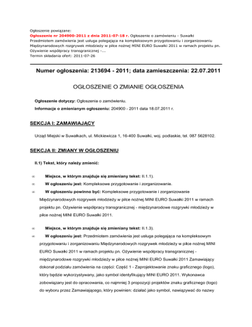 Ogłoszenie powiązane: Ogłoszenie nr 204900-2011 z dnia 2011-07-18 r. Ogłoszenie o zamówieniu - Suwałki Przedmiotem zamówienia jest usługa polegająca na kompleksowym przygotowaniu i zorganizowaniu Międzynarodowych rozgrywek młodzieży w piłce nożnej MINI EURO Suwałki 2011 w ramach projektu pn. Ożywienie współpracy transgranicznej -... Termin składania ofert: 2011-07-26 Numer ogłoszenia: 213694 - 2011; data zamieszczenia: 22.07.2011 OGŁOSZENIE O ZMIANIE OGŁOSZENIA Ogłoszenie dotyczy: Ogłoszenia o zamówieniu. Informacje o zmienianym ogłoszeniu: 204900 - 2011 data 18.07.2011 r. SEKCJA I: ZAMAWIAJĄCY Urząd Miejski w Suwałkach, ul. Mickiewicza 1, 16-400 Suwałki, woj. podlaskie, tel. 087 5628102. SEKCJA II: ZMIANY W OGŁOSZENIU II.1) Tekst, który należy zmienić: • Miejsce, w którym znajduje się zmieniany tekst: II.1.1). • W ogłoszeniu jest: Kompleksowe przygotowanie i zorganizowanie. • W ogłoszeniu powinno być: Kompleksowe przygotowanie i zorganizowanie Międzynarodowych rozgrywek młodzieży w piłce nożnej MINI EURO Suwałki 2011 w ramach projektu pn. Ożywienie współpracy transgranicznej - międzynarodowe rozgrywki młodzieży w piłce nożnej MINI EURO Suwałki 2011. • Miejsce, w którym znajduje się zmieniany tekst: II.1.3). • W ogłoszeniu jest: Przedmiotem zamówienia jest usługa polegająca na kompleksowym przygotowaniu i zorganizowaniu Międzynarodowych rozgrywek młodzieży w piłce nożnej MINI EURO Suwałki 2011 w ramach projektu pn. Ożywienie współpracy transgranicznej międzynarodowe rozgrywki młodzieży w piłce nożnej MINI EURO Suwałki 2011 Zamawiający dokonał podziału zamówienia na części: Część 1 - Zaprojektowanie znaku graficznego (logo), który będzie wykorzystywany, jako symbol identyfikujący MINI EURO 2011. Wykonawca zobowiązany jest do opracowania, co najmniej 3 propozycji projektów znaku graficznego (logo) do wyboru przez Zamawiającego, który powinien: działać jako symbol, nawiązywać do nazwy Międzynarodowych rozgrywek młodzieży w piłce nożnej MINI EURO Suwałki 2011, być możliwy do zastosowania zarówno w wersji kolorystycznej (maksymalnie 8 kolorów) oraz w wersji achromatycznej czarnej i białej, nadawać się do jego różnorodnego wykorzystania w materiałach reklamowych i promocyjnych. Wykonawca zobowiązany jest do opracowania logo w formie kolorowego wydruku na planszy formatu A4 na sztywnym podkładzie. Do wydruku należy dołączyć kopię elektroniczną projektu zapisaną na płycie CD lub DVD w formacie wektorowym (Adobe Photoshop lub Corel Drav) - Logo w wersji kolorowanej 1 egzemplarz. Wykonawca zobowiązany jest także do przeniesienie na zamawiającego autorskich praw majątkowych i pokrewnych do posługiwania się znakiem graficznym (logo) na wszystkich polach eksploatacji w tym w szczególności na cele działań promocyjnych m.in. oznaczania materiałów reklamowych (promocyjnych), zaproszeń i itp. Część 2 - Zaprojektowanie i wykonanie strony internetowej na potrzeby Międzynarodowych rozgrywek młodzieży w piłce nożnej MINI EURO Suwałki 2011 oraz jej prowadzenie w okresie VIII-XI 2011 r. Wymagania techniczne dla strony internetowej: - Portal wykonany z wykorzystaniem systemu zarządzania treścią - CMS. - Adres strony i hosting zapewni Zamawiający na serwerze home.pl (PHP, MySQL lub PostgreSQL) - Rozmiar strony głównej nie powinien przekraczać rozdzielczości 1024x768. Strony powinny prawidłowo się wyświetlać na tabletach podczas zmiany orientacji ekranu. - Strony www powinny być prawidłowo wyświetlane niezależnie od ustawionych rozdzielczości i wielkości okna w przeglądarce (niedopuszczalne jest nakładanie się tekstu lub jego obcinanie itp.), - Strony WWW muszą zostać wykonany w standardzie kodowania znaków Unicode UTF-8, - Kod strony powinien być zoptymalizowany pod względem czasu ładowania. - Wykonawca zobowiązany jest do użycia odpowiedniej technologii budowy strony, która zapewni poprawne interpretowanie i wyświetlanie strony na popularnych urządzeniach, systemach i oprogramowaniu tzn. co najmniej: - Windows PC (Microsoft Internet Explorer 7.0 i nowsza, Mozilla Firefox 3.0 i nowsza, Opera 10.0 i nowsza), Max OS Apple (Apple Safari 5.0, Mozilla Firefox 3.0 i nowsza). - urządzenia przenośne z systemem Google Android, Apple iOS 4.3 - W przypadku zastosowania w proponowanym portalu powtarzalnych graficznych odnośników zawierających różne opisy (np. przyciski różniące się napisami) wymagamy dostarczenia ich wersji bazowej (np. przycisk bez napisu) tak, aby mieć możliwość rozbudowy portalu, - Wykonawca zobowiązany jest do zoptymalizowania strony pod względem jej pozycjonowania. Wykonawca zamieści podane przez Zamawiającego opisy stron i słowa kluczowe (sekcja meta). - Projekt graficzny powinien jednoznacznie wskazywać na tematykę Międzynarodowych rozgrywek młodzieży w piłce nożnej MINI EURO Suwałki 2011. Zawartość strony internetowej: - Budowa strony internetowej musi być wykonana w terminie do 13 sierpnia 2011 r. i musi zawierać moduły min.: aktualności, wyszukiwarka, mapa strony, licznik odwiedzin, kontakt, 3 wersje językowe: polska, litewska, angielska. - Portal musi umożliwiać zamieszczanie: zdjęć (przegląd slajdów), banerów (w tym flash), krótkich prezentacji multimedialnych, plików do pobrania, linków wewnętrznych i zewnętrznych, filmów promocyjnych (maks. 10 minut). Strona ma zawierać następujące treści: dane teleadresowe, - informacje o projekcie (min. drużynach, organizatorach i instytucjach udzielających patronat), - informacje na temat finansowania projektu, - logotypy wskazane przez Zamawiającego. Layout strony: strona musi mieć atrakcyjną i przejrzystą kolorystykę, zawierać elementy graficzne (logotypy wskazane przez Zamawiającego), nawiązywać kolorystyką do loga przedmiotowej imprezy. Wykonawca przygotuje 3 szablony strony do wyboru Zamawiającego. Część