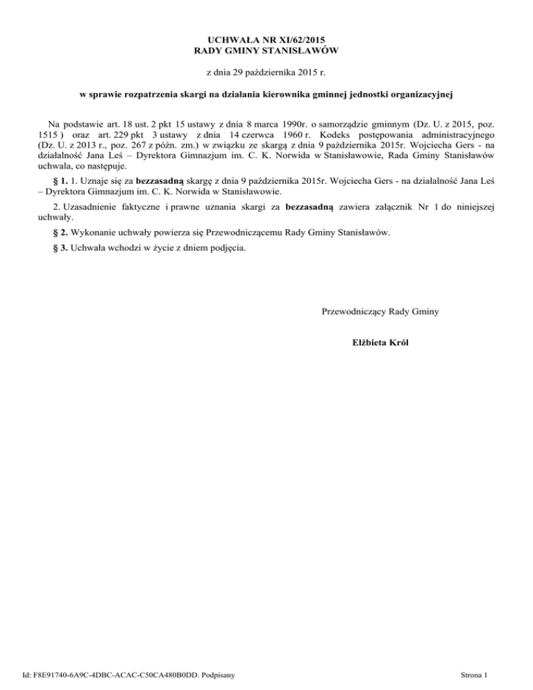 UCHWAŁA NR XI/62/2015 RADY GMINY STANISŁAWÓW z dnia 29 października 2015 r. w sprawie rozpatrzenia skargi na działania kierownika gminnej jednostki organizacyjnej Na podstawie art. 18 ust. 2 pkt 15 ustawy z dnia 8 marca 1990r. o samorządzie gminnym (Dz. U. z 2015, poz. 1515 ) oraz art. 229 pkt 3 ustawy z dnia 14 czerwca 1960 r. Kodeks postępowania administracyjnego (Dz. U. z 2013 r., poz. 267 z późn. zm.) w związku ze skargą z dnia 9 października 2015r. Wojciecha Gers - na działalność Jana Leś – Dyrektora Gimnazjum im. C. K. Norwida w Stanisławowie, Rada Gminy Stanisławów uchwala, co następuje. § 1. 1. Uznaje się za bezzasadną skargę z dnia 9 października 2015r. Wojciecha Gers - na działalność Jana Leś – Dyrektora Gimnazjum im. C. K. Norwida w Stanisławowie. 2. Uzasadnienie faktyczne i prawne uznania skargi za bezzasadną zawiera załącznik Nr 1 do niniejszej uchwały. § 2. Wykonanie uchwały powierza się Przewodniczącemu Rady Gminy Stanisławów. § 3. Uchwała wchodzi w życie z dniem podjęcia. Przewodniczący Rady Gminy Elżbieta Król Id: F8E91740-6A9C-4DBC-ACAC-C50CA480B0DD. Podpisany Strona 1 Uzasadnienie FAKTYCZNE I PRAWNE W dniu 9 października 2015 złożone zostało przez Pana Wojciecha Gers pismo skierowane do Wójta Gminy Stanisławów a stanowiące skargę na działania Jana Leś - Dyrektora Gimnazjum im. C. K. Norwida w Stanisławowie. W związku z powyższym Wójt Gminy Stanisławów przekazał ww. skargę zgodnie z właściwością celem jej rozpoznania przez Radę Gminy Stanisławów. Przewodniczący Rady Gminy Stanisławów przekazał sprawę do rozpatrzenia Komisji Rewizyjnej Rady Gminy Stanisławów. W dniu 27 października 2015r. odbyło się posiedzenie Komisji Rewizyjnej Rady Gminy Stanisławów. Komisja przeanalizowała sprawę. Z przeprowadzonej analizy wynikło, co następuje. Skargą datowaną na dzień 9 października 2015 r. skarżący wskazał, że prosi o udzielenie informacji co do działań podjętych przez Dyrektora Gimnazjum im. C. K. Norwida w Stanisławowie w zakresie w jakim działania te mają dotyczyć Małgorzaty Gers a związane są ze wskazanymi przez skarżącego w piśmie z dnia 10 września 2015 r. uchybieniami w zakresie bieżącej pracy ww. osoby jako nauczyciela. Skarżący wniósł ponadto o udzielenie mu informacji co do tego, czy w stosunku do ww. osoby wszczęte zostało lub czy zostanie wszczęte postępowanie dyscyplinarne. Skarżący wskazał ponadto, że w trakcie analizy dokumentacji nauczania stwierdził nieprawidłowości w zakresie prowadzonej dokumentacji. Po zapoznaniu się ze wskazanymi powyżej zarzutami stwierdzono, że wykazane w rozpoznawanej skardze zarzuty nie znajdują potwierdzenia. W pierwszej kolejności odkreślić należy, że zarówno Komisja Rewizyjna, jak i Rada Gminy Stanisławów nie są organami władnymi do realizacji zadań związanych z organizacją pracy placówki oświatowej, jak i realizacji przez dyrektora tejże placówki zadań z zakresu prawa pracy, czy też z zakresu uprawnień związanych z inicjowaniem postępowania dyscyplinarnego uregulowanego przepisami KN. W związku z tym organy te nie posiadają prawa do ingerowania w sposób władczy w bieżącą działalność placówki oświatowej, a jedynie prawo do sprawowania bieżącego nadzoru nad działalnością placówki. Dokonując oceny złożonej skargi Rada Gminy wzięła pod uwagę treść oświadczenia Dyrektora Gimnazjum im. C. K. Norwida w Stanisławowie, zgodnie z którym organizacja pracy w placówce zgodna jest z obowiązującymi w tym zakresie przepisami prawa, a ponadto, że posiadając wiedzę co do okoliczności sprawy podejmuje on działania, które w jego ocenie umożliwiają realizację nałożonych na Panią Małgorzatę Gers obowiązków. Powyższe dyrektor potwierdził w trakcie wysłuchania jakie miało miejsce zarówno przed Komisją, jak i przed Radą Gminy. Dokonując oceny treści złożonego oświadczenia oraz jego szczegółowego uzasadniania stwierdzić należy, że argumentację w nim zawartą należy podzielić, uznając, że nie doszło do uchybień w zakresie pracy Dyrektora Gimnazjum im. C. K. Norwida w Stanisławowie. W zakresie wniosku o udzielenie informacji co do postępowań dyscyplinarnych prowadzonych w stosunku do w/w osoby, jak tez ewentualnego wszczęcia takiego postępowania informujemy, ze zgodnie z art. 80 ustawy KN postępowanie takie może zostać wszczęte wyłącznie na wniosek rzecznika dyscyplinarnego. Zgodnie zaś z informacją uzyskaną od Dyrektora Gimnazjum im. C. K. Norwida w Stanisławowie w chwili obecnej nie widzi on podstaw dla złożenia takiego wniosku, co Rada przyjęła do wiadomości. Mając powyższe na uwadze Komisja Rewizyjna w głosowaniu (obecnych 5 radnych) wypracowała wniosek o uznanie skargi za bezzasadną. Stanowisko Komisji Rewizyjnej zostało przedłożone Radzie Gminy Stanisławów na sesji w dniu 29 października 2015r. wraz z projektem uchwały wraz z załącznikiem. Rada Gminy Stanisławów uznała za bezzasadną skargę z dnia 9 października 2015 r. Wojciecha Gers - na działalność Jana Leś – Dyrektora Gimnazjum im. C. K. Norwida w Stanisławowie. Id: F8E91740-6A9C-4DBC-ACAC-C50CA480B0DD. Podpisany Strona 1